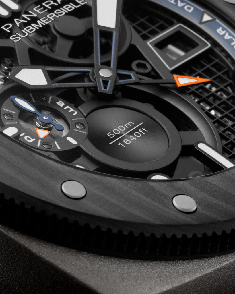 Dotée d’un boîtier imposant de 47 mm en titane Grade 5, cette Submersible est fabriquée à l’aide de la technologie DMLS (frittage laser direct), conférant au titane une légèreté et une résistance sans compromis. La lunette en Carbotech™, matériau composite innovant, ajoute à la robustesse de cette montre, tout en garantissant une résistance exceptionnelle à la corrosion et un motif unique pour chaque pièce. Avec une étanchéité poussée jusqu’à 50 bar (environ 500 mètres), la PAM01670 répond aux besoins des aventuriers, se positionnant comme un instrument de plongée de haute précision, fiable dans les conditions les plus exigeantes.