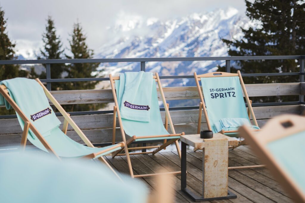 Chaque lieu met en avant le St-Germain Spritz, emblématique cocktail mariant liqueur, prosecco et eau pétillante, parfait pour un après-ski en terrasse ou près du feu.