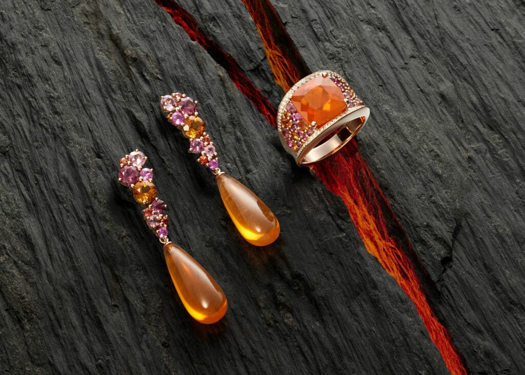 La joaillière Isabelle Langlois, renommée pour son expertise en pierres de couleur, enrichit sa collection Pointilliste avec de nouvelles pièces où l’opale de feu occupe une place centrale. Inspirée par les années 70, cette gemme flamboyante du Mexique, aux nuances d’orange et de rouge, s’impose dans des créations en or rose 750/1000ème, reflétant la gaieté et la féminité qui caractérisent la maison Langlois.