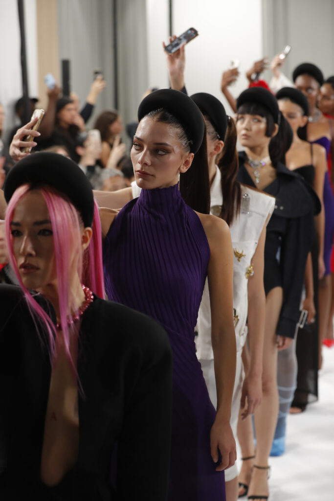 Dans un monde où les tendances uniformes dominent, les mannequins du défilé, coiffées et maquillées à l’identique, incarnent la perte d’individualité imposée par les diktats sociaux et les réseaux sociaux. Cette mise en scène visuelle met en lumière une dérive où la quête de perfection se traduit par une effacement collectif.