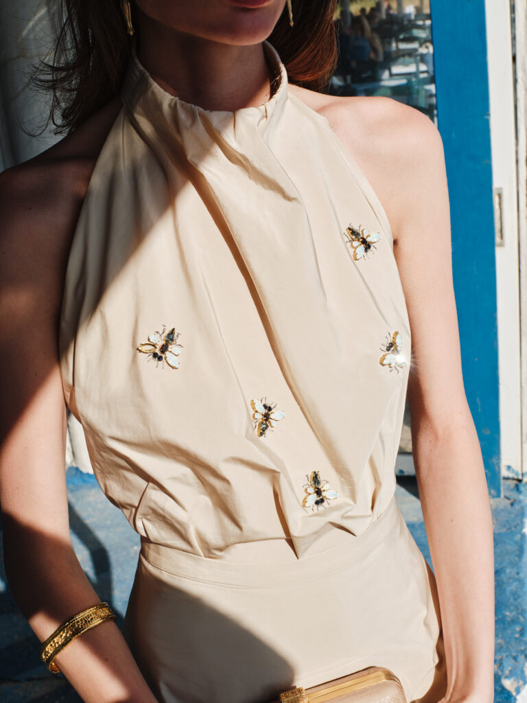 Pour la collection Resort 2025 intitulée « Delphinus », Zeus+Dione et le designer Marios Schwab plongent au cœur d’un jardin méditerranéen résilient. Inspirée par l’esprit de « The Mediterranean Garden Society », cette ligne célèbre l’harmonie entre la nature et l’homme dans les paysages arides de la Méditerranée. Depuis 30 ans, cette société promeut des jardins en phase avec le climat, valorisant sobriété et respect de l’environnement.