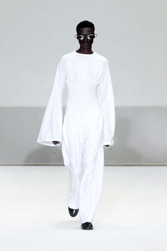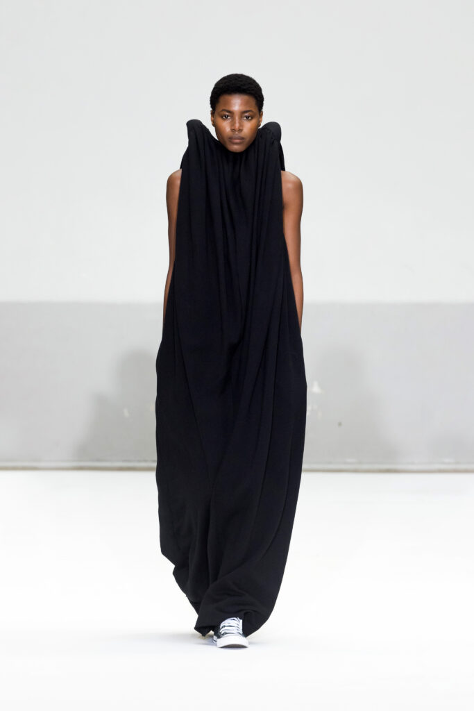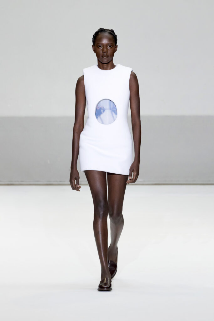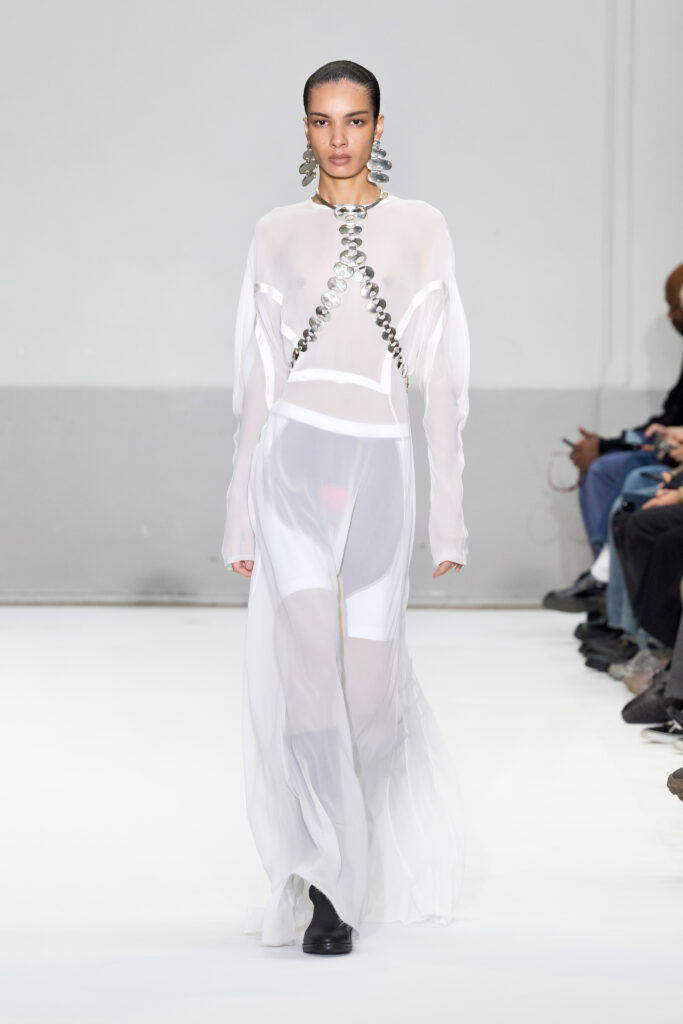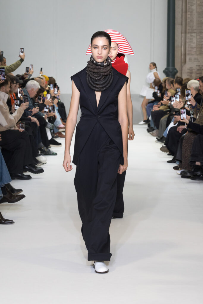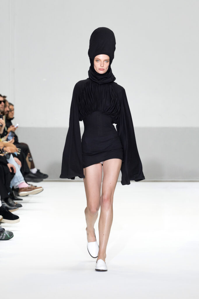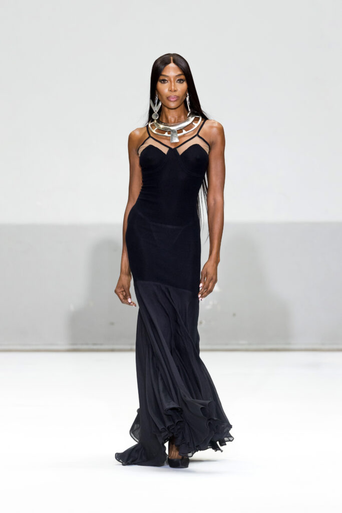 Le défilé a capté l’attention avec une innovation mémorable : une robe équipée d’un écran retransmettant en direct la présentation. En final, Naomi Campbell a surpris les spectateurs, vêtue d’une robe fluide à col illusion, marquant un nouveau sommet dans l’exploration des vêtements flottants, signature récente de la marque.