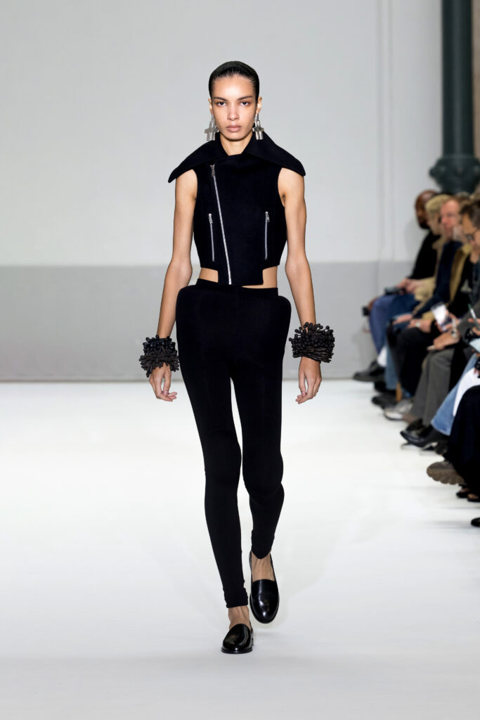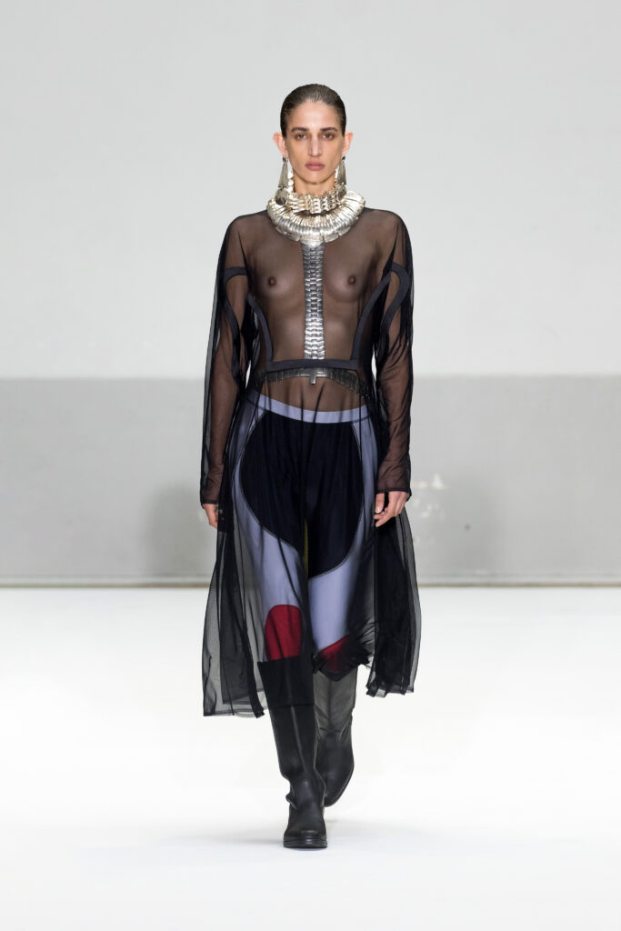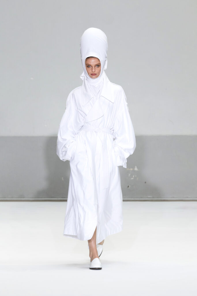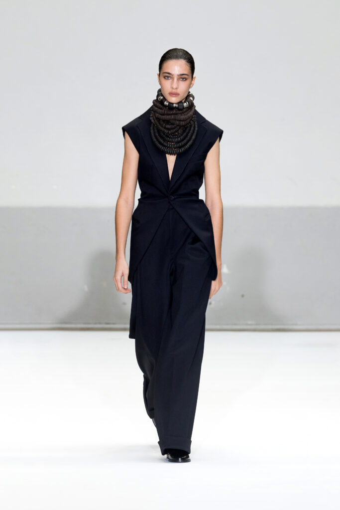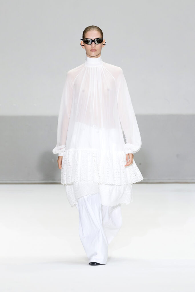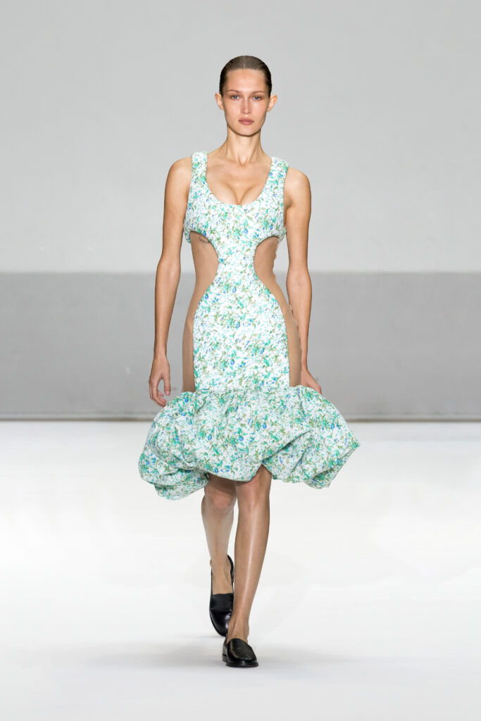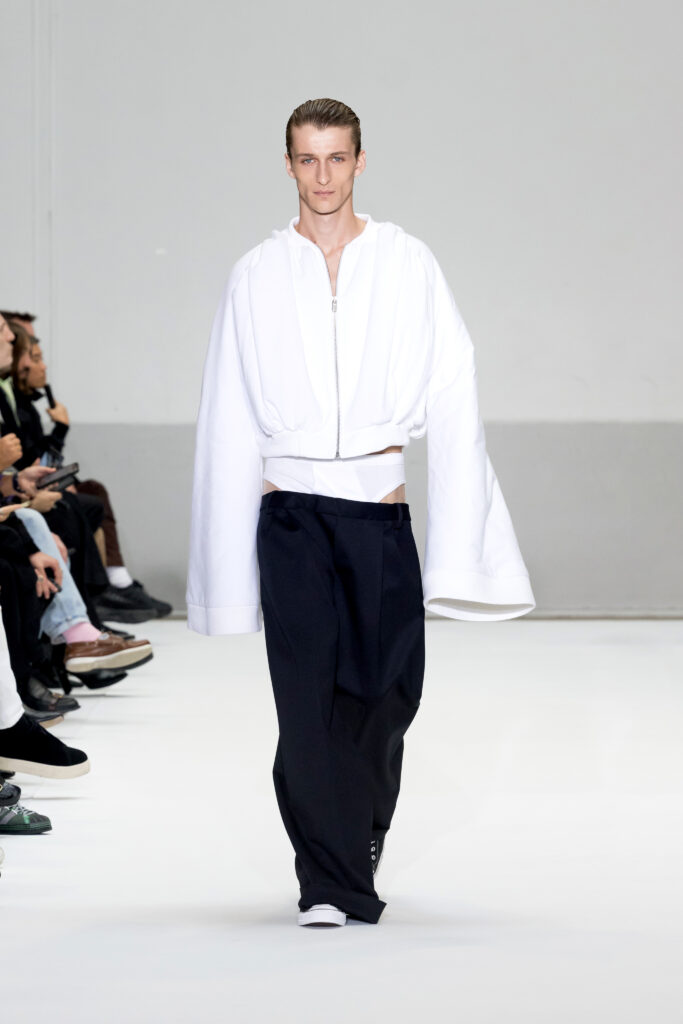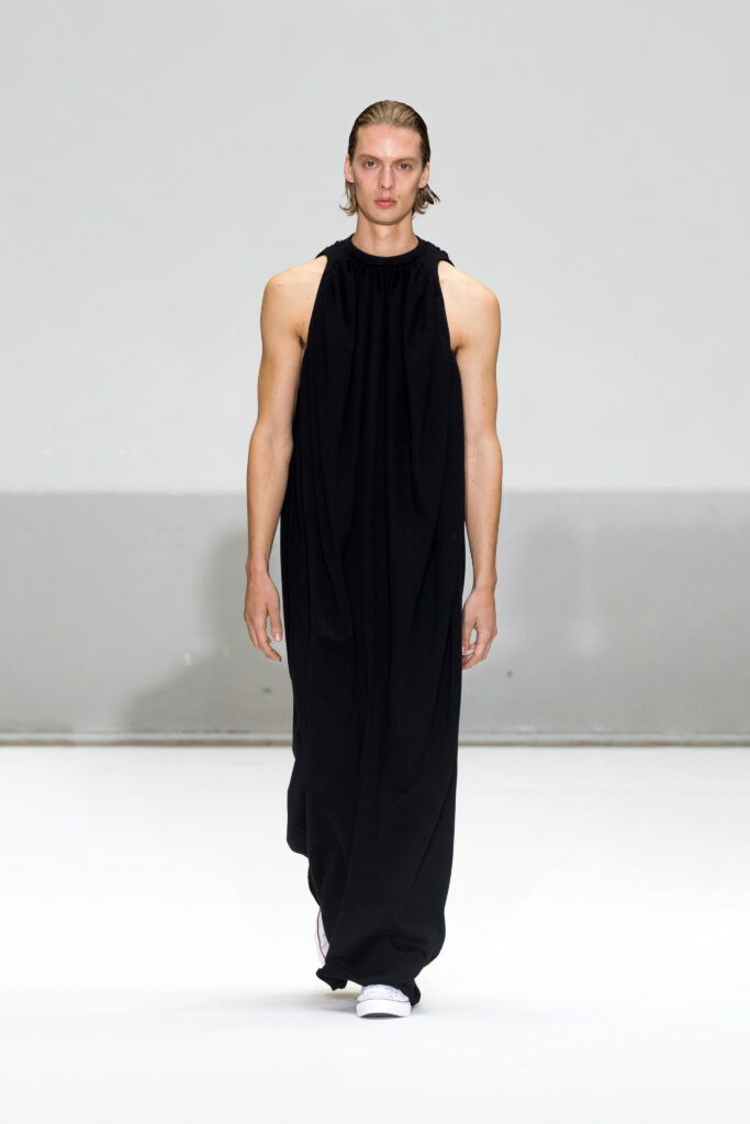 Le défilé a capté l’attention avec une innovation mémorable : une robe équipée d’un écran retransmettant en direct la présentation. En final, Naomi Campbell a surpris les spectateurs, vêtue d’une robe fluide à col illusion, marquant un nouveau sommet dans l’exploration des vêtements flottants, signature récente de la marque.