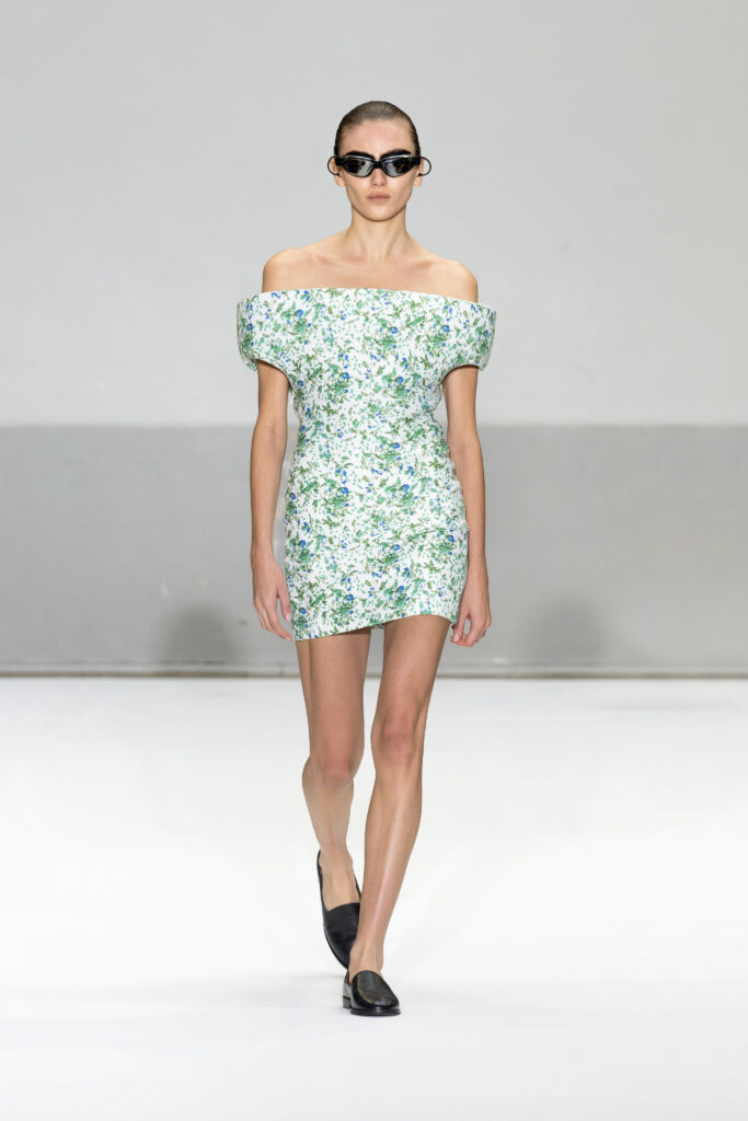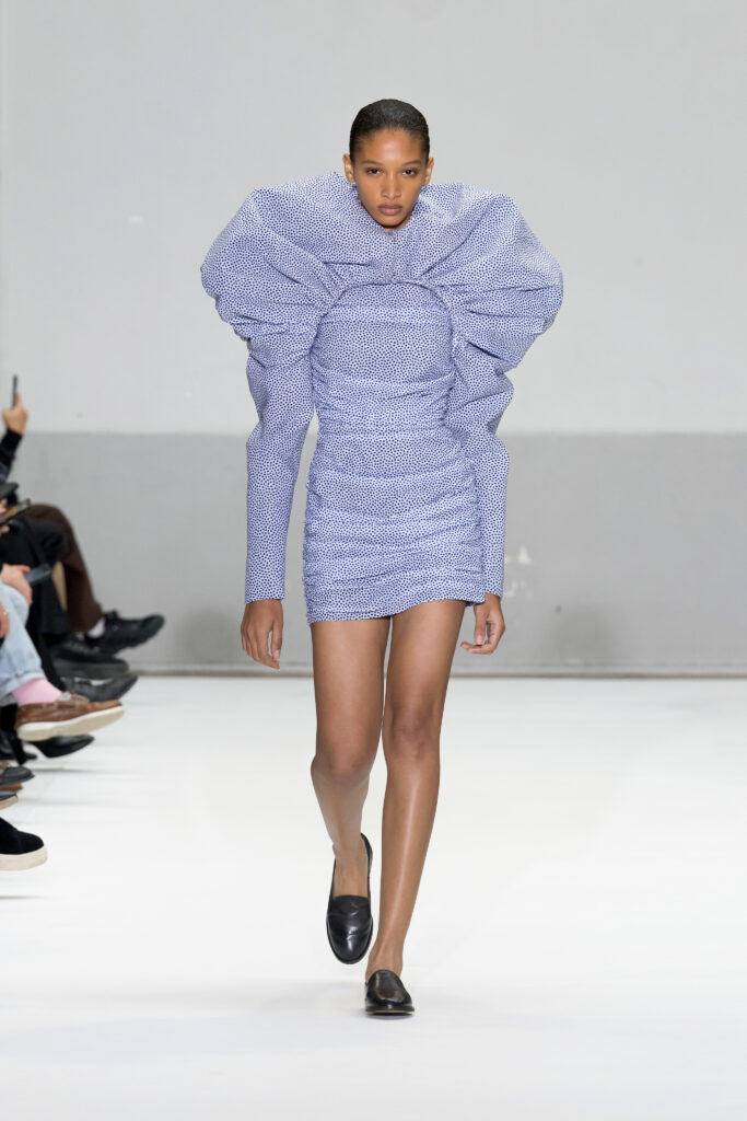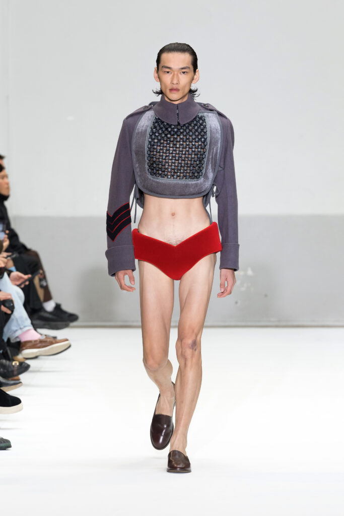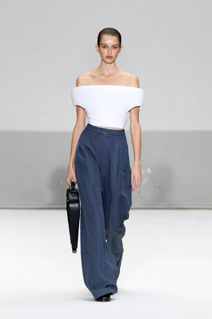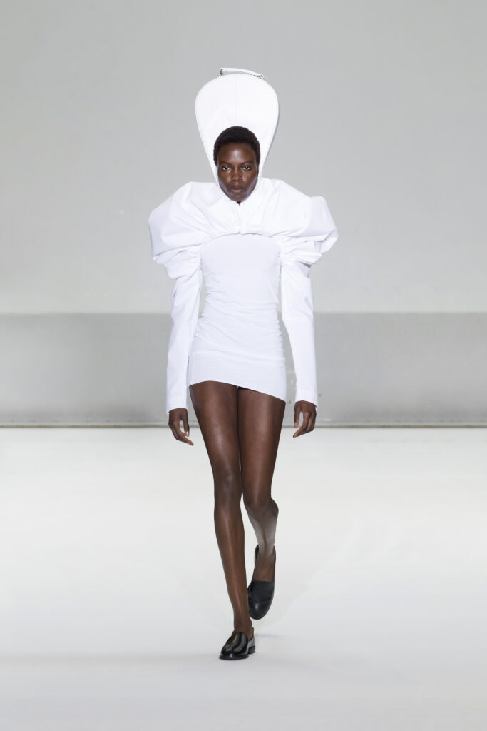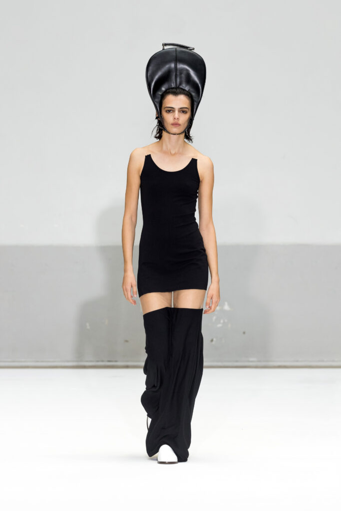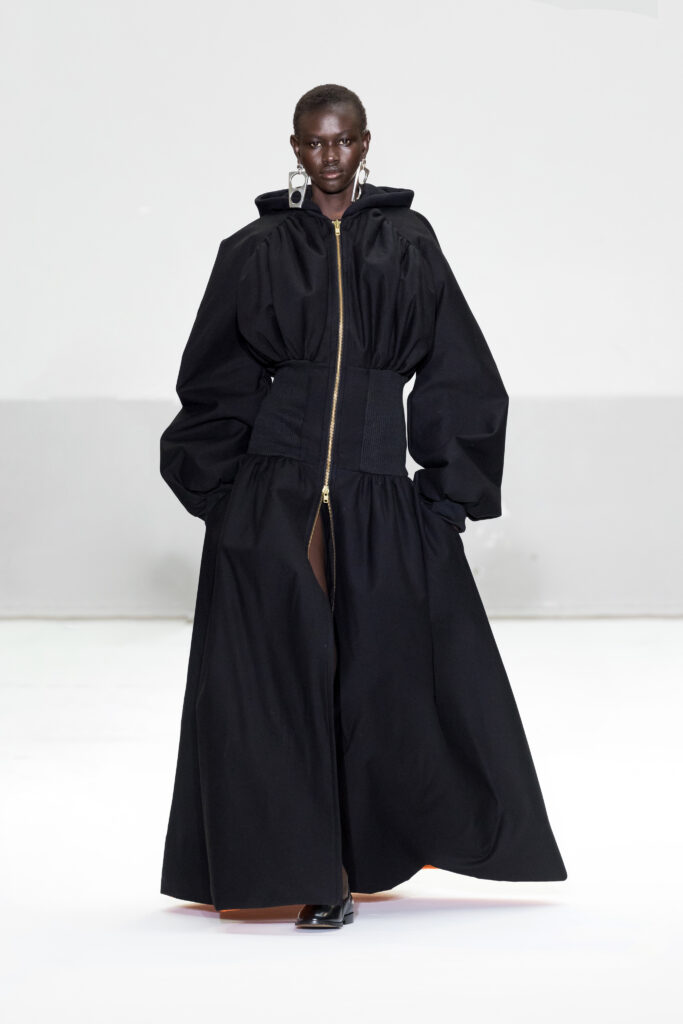 Le défilé a capté l’attention avec une innovation mémorable : une robe équipée d’un écran retransmettant en direct la présentation. En final, Naomi Campbell a surpris les spectateurs, vêtue d’une robe fluide à col illusion, marquant un nouveau sommet dans l’exploration des vêtements flottants, signature récente de la marque.