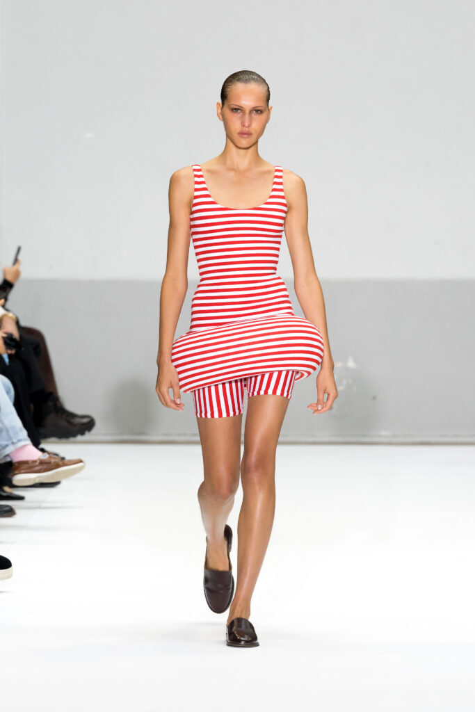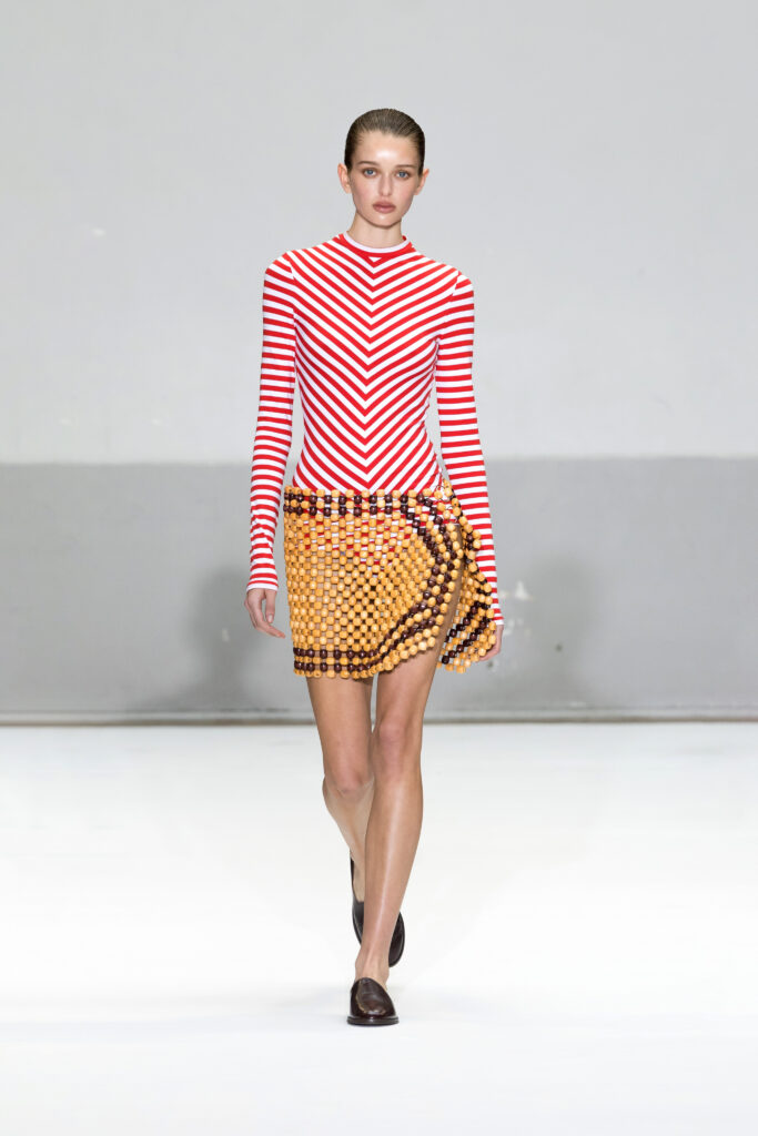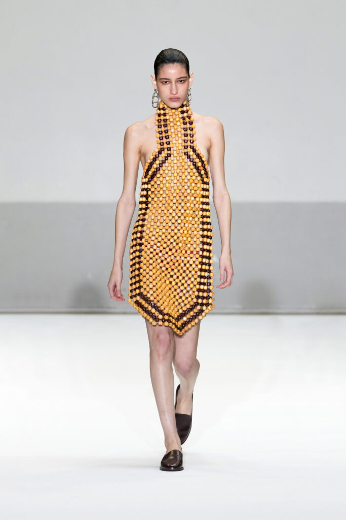 - Matériaux et textures : Tuniques fluides superposées à des shorts de cyclisme, évoquant l’esprit libre des raves d’Ibiza des années 1980, enrichies de bijoux provenant des archives personnelles de Carla Sozzani.