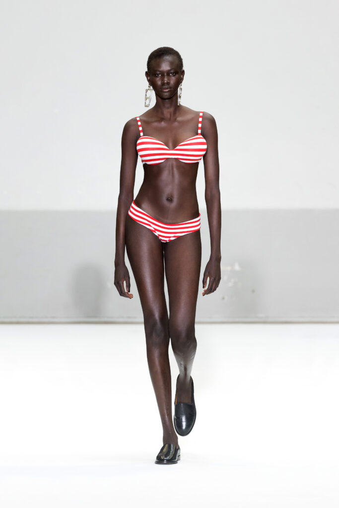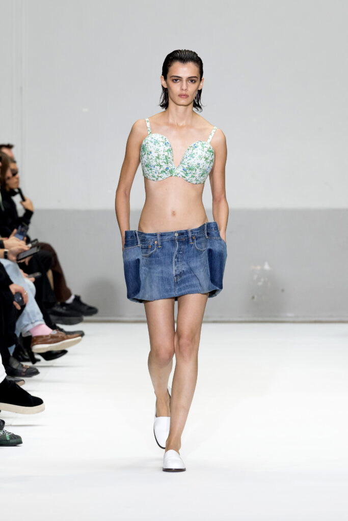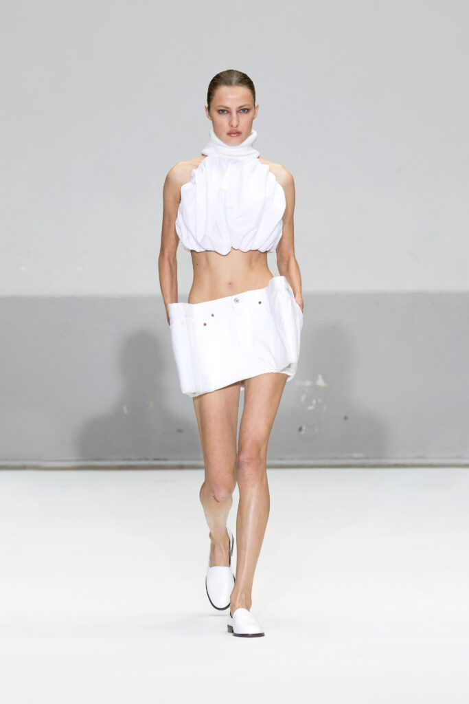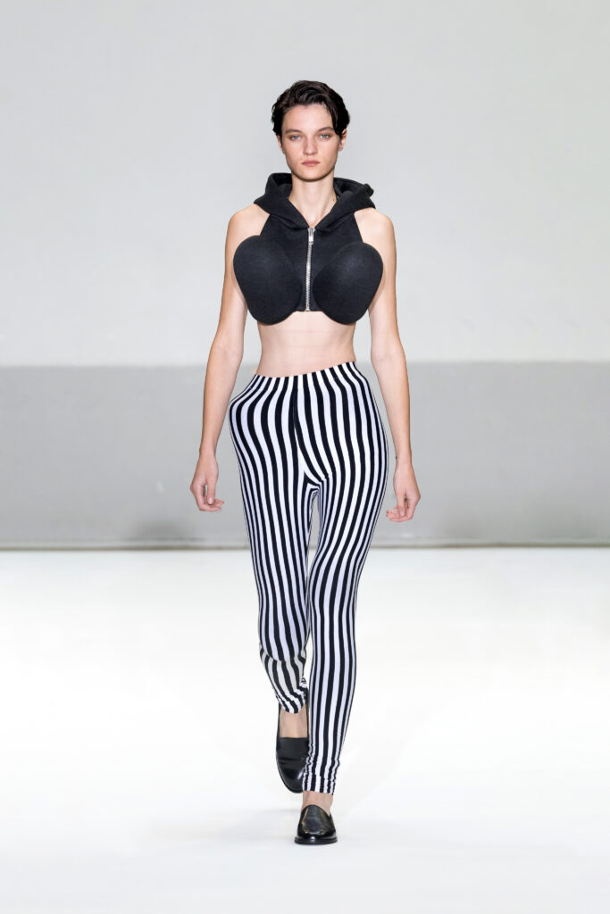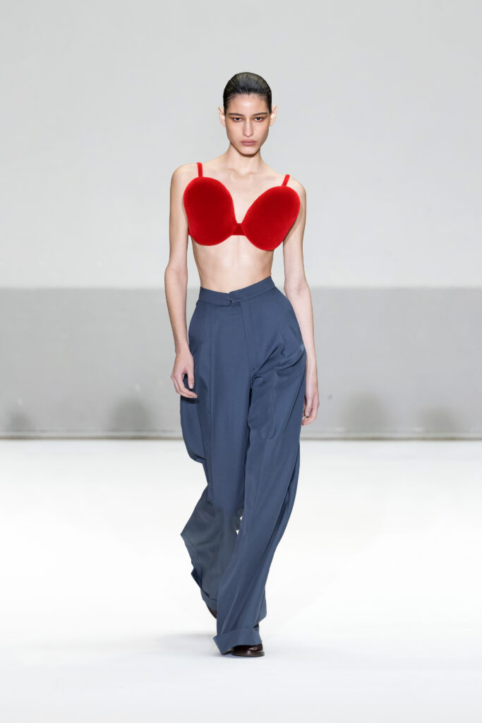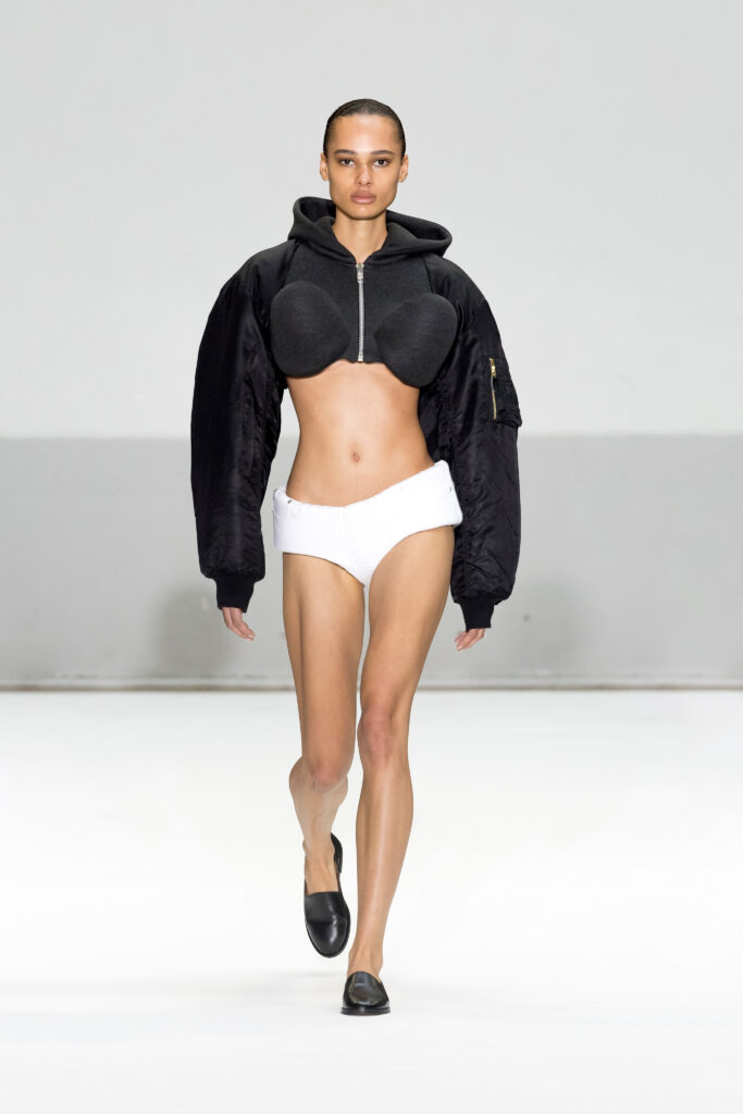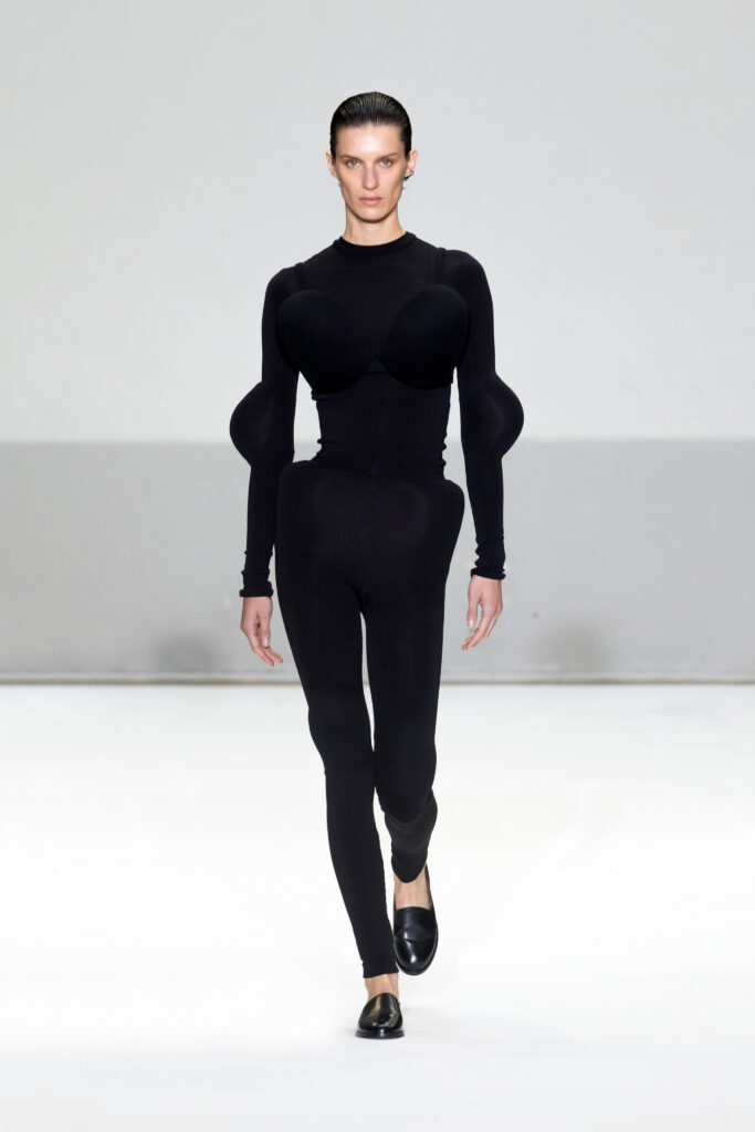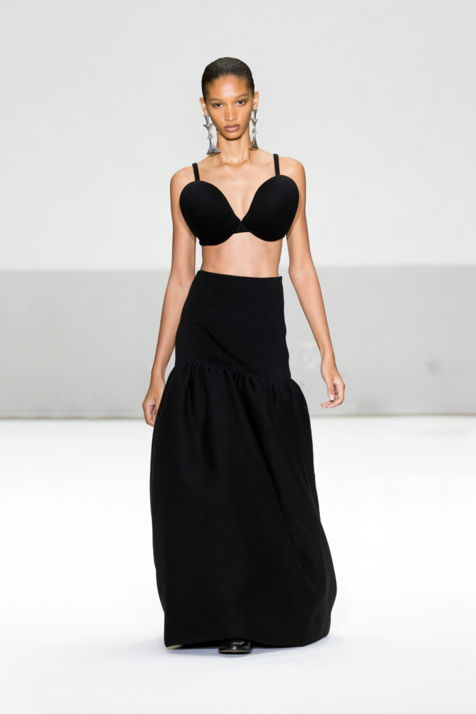 - Silhouettes audacieuses : Soutiens-gorge coniques et volumes exagérés, centrés sur les hanches et les articulations, avec une interprétation subtile et moderne.