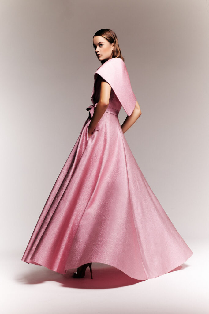 - Grande robe portefeuille en satin lamé rose et or : Parfaite pour capturer l’essence de la féminité moderne.