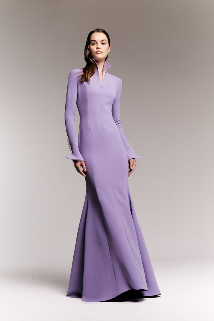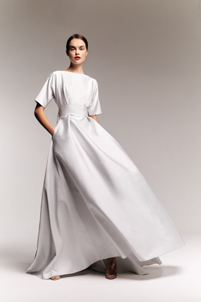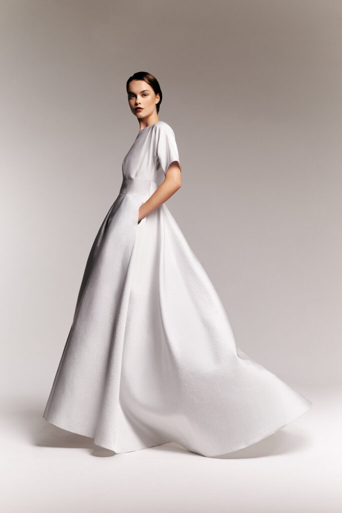 Matières : Les crêpes légers, lamés scintillants, et dentelles délicates s’associent pour refléter la lumière et la subtilité des premières lueurs du jour.