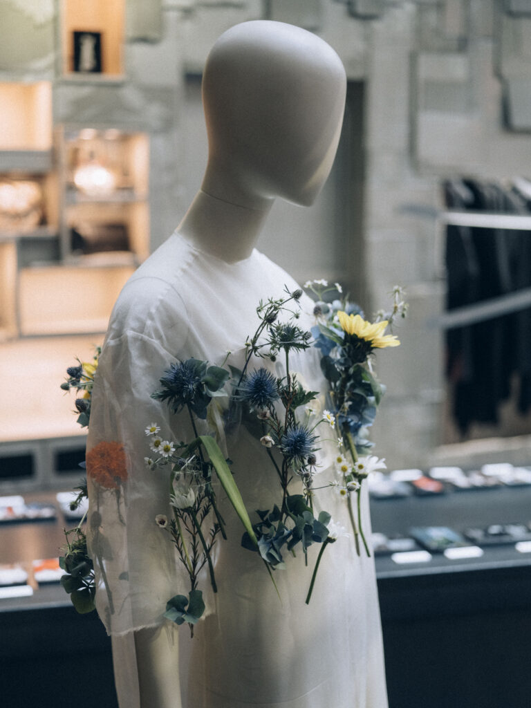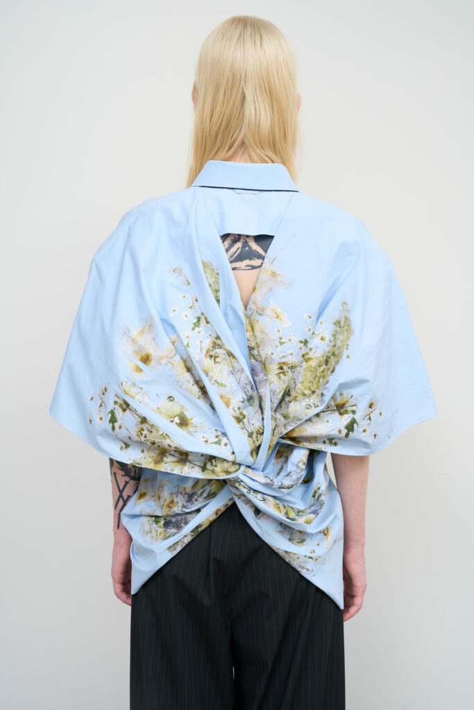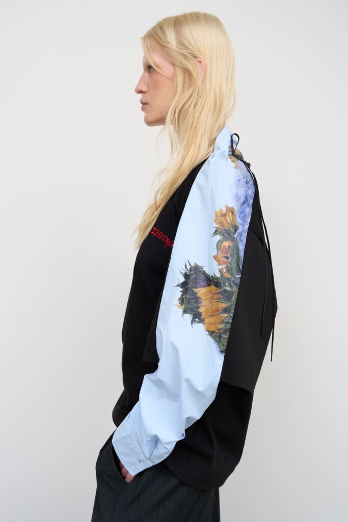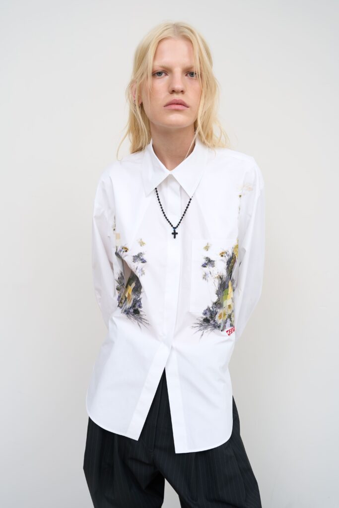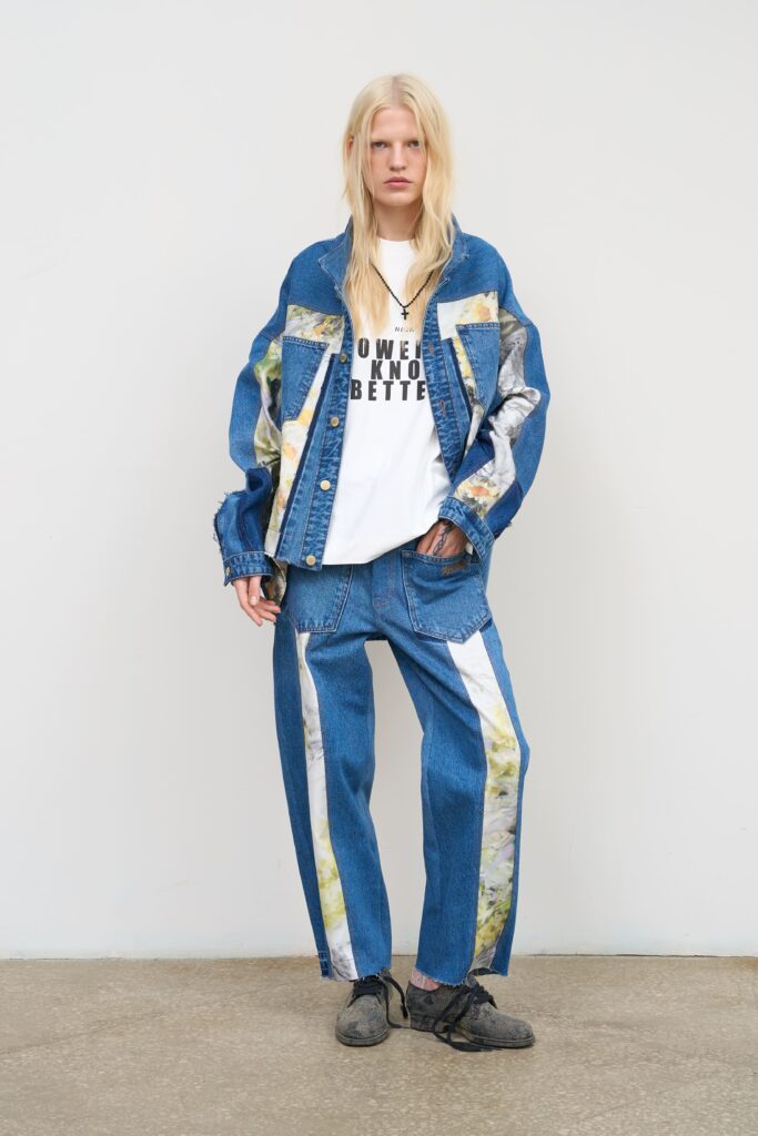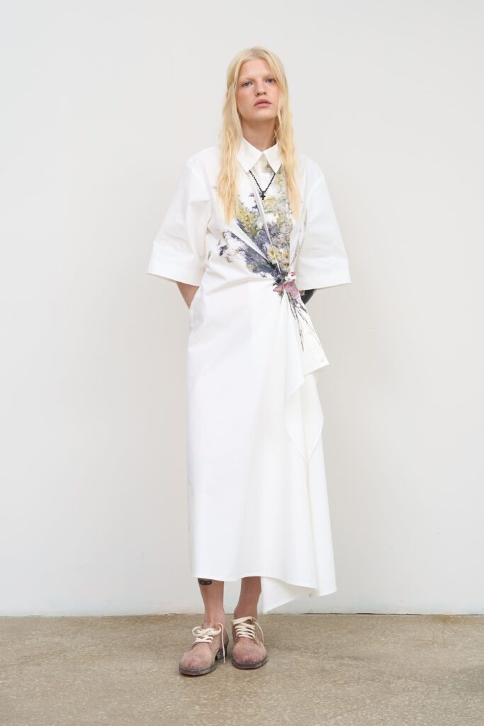 La collection met également à l’honneur une capsule spéciale, Flowers Know Better, en collaboration avec le directeur de SHOWstudio, Nick Knight. Les images florales créées par Knight sont déconstruites, brodées et appliquées sur des vêtements, symbolisant la force et la sagesse de la nature. Tous les bénéfices de cette capsule seront reversés pour soutenir les enfants ukrainiens affectés par la guerre, soulignant l’engagement de la marque envers des causes humanitaires.