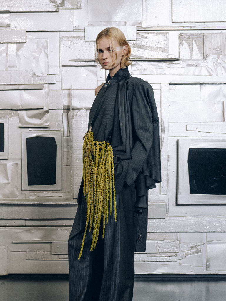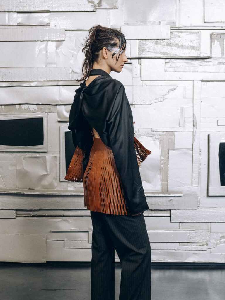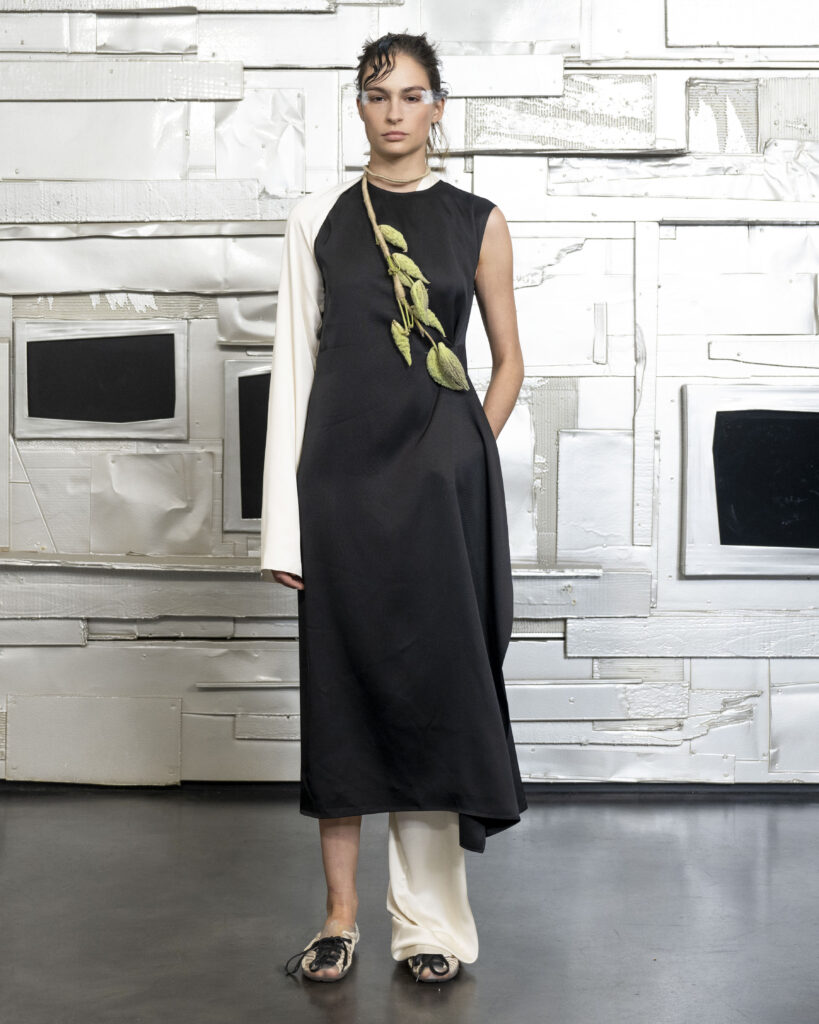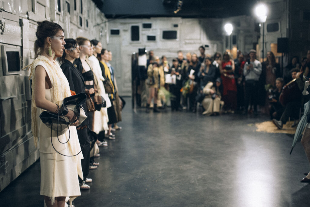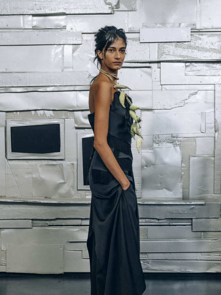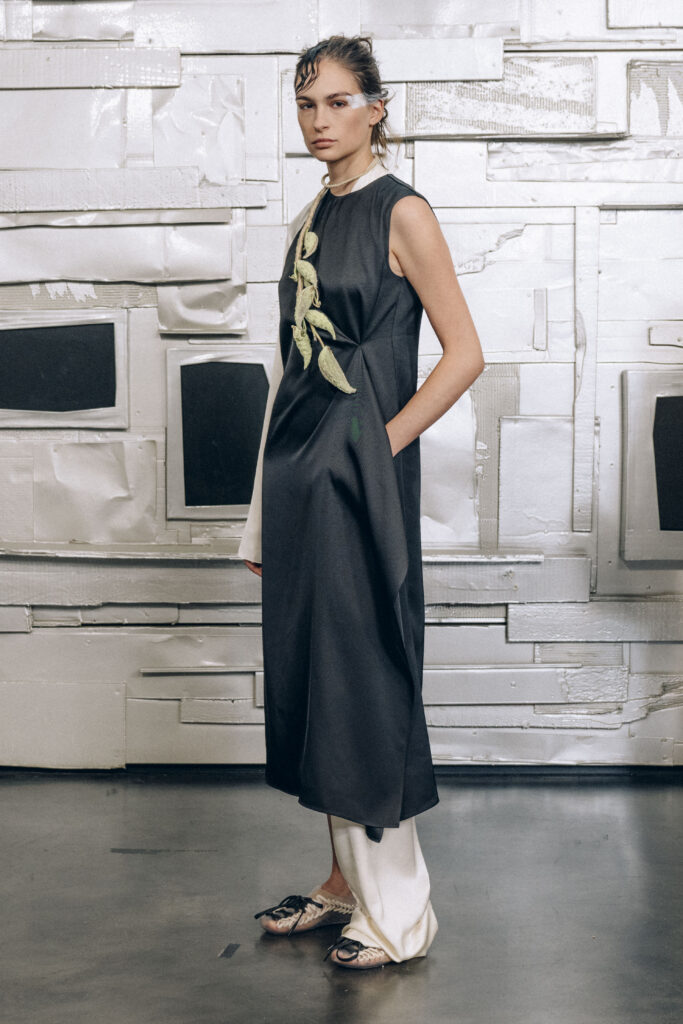 Née de quatre générations de tailleurs, Lilia Litkovska fait revivre les traditions à travers des pièces déconstruites mêlant textures, superpositions et détails métaphoriques. Hauts en maille évoquant des épis de maïs, robes asymétriques et ensembles en simili cuir brillant rappellent les cycles naturels et la gratitude envers la terre.