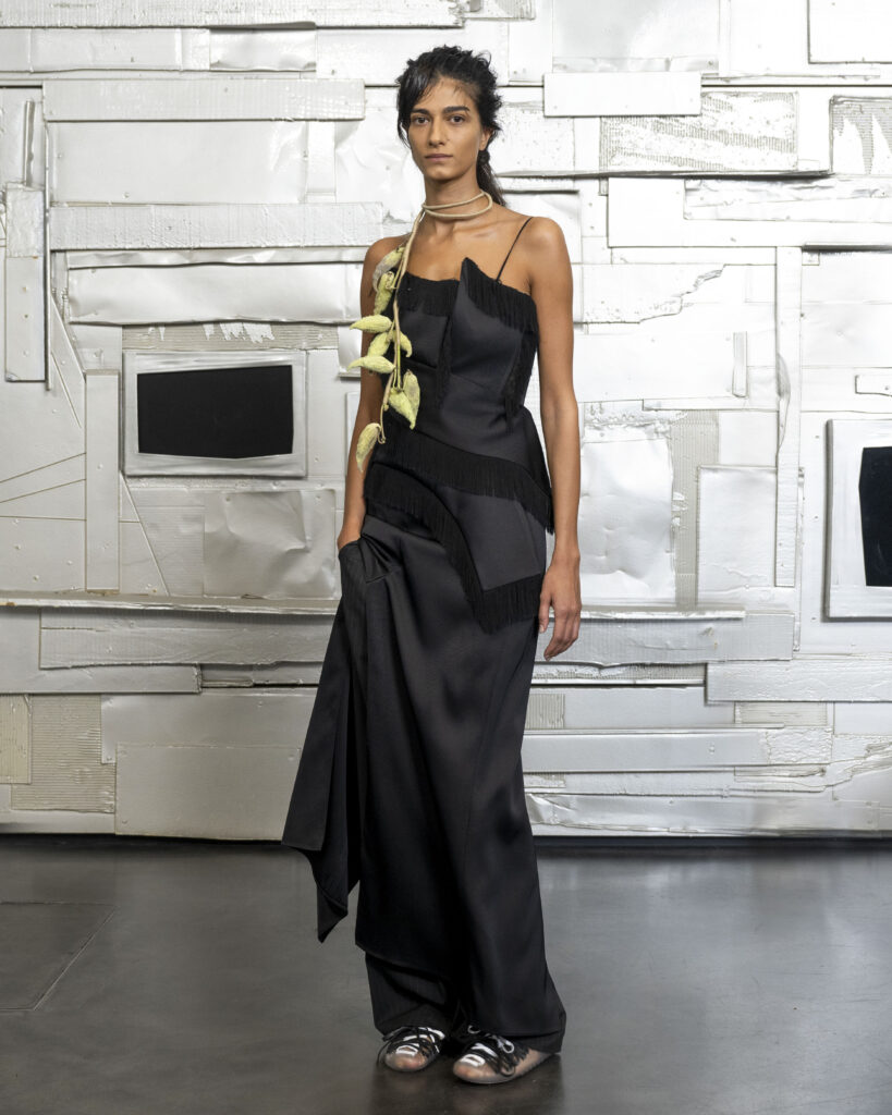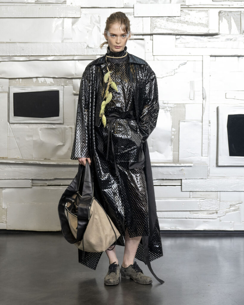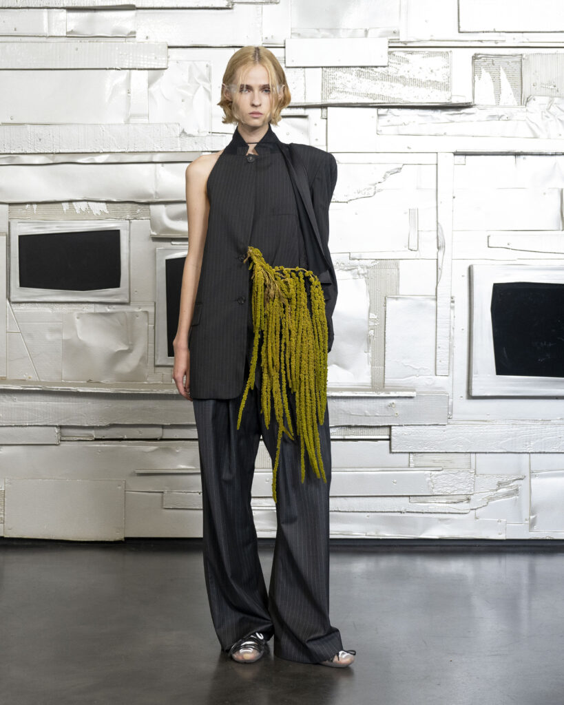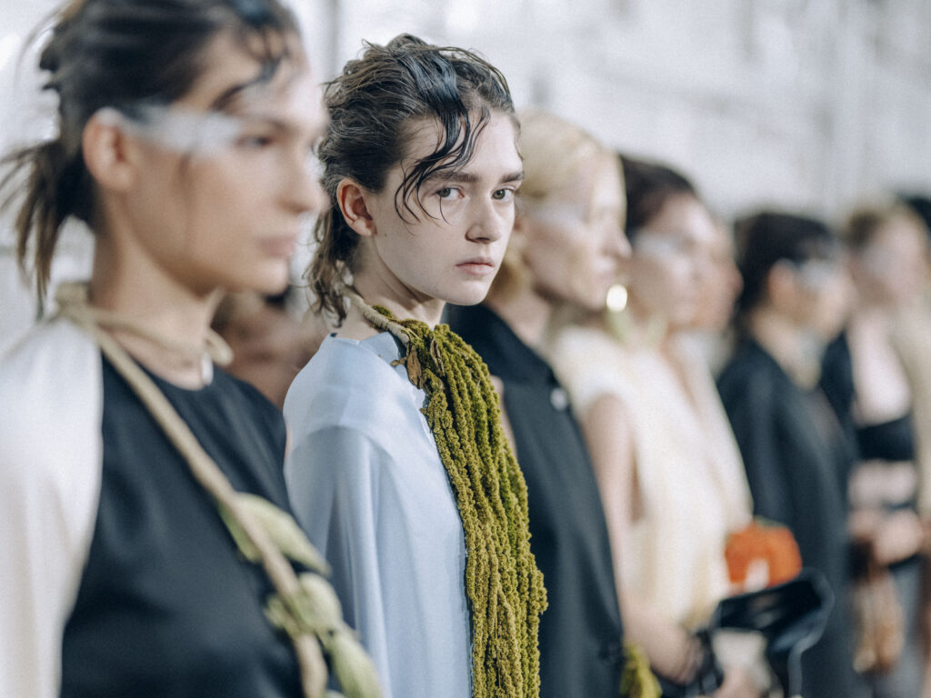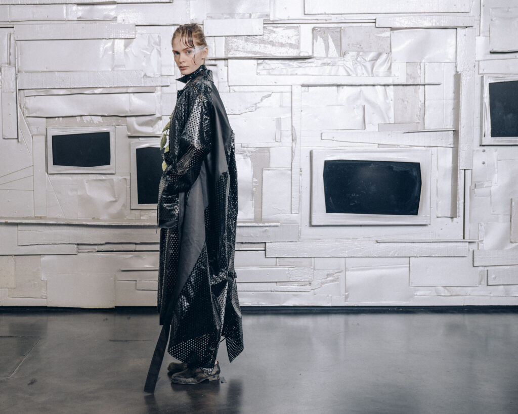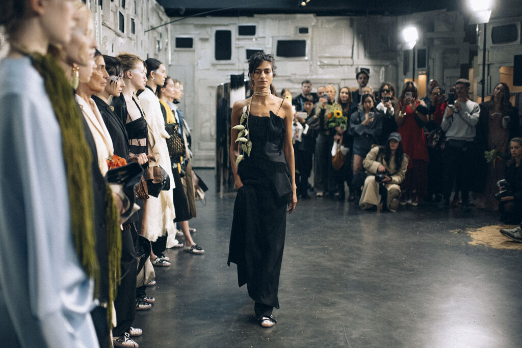 Née de quatre générations de tailleurs, Lilia Litkovska fait revivre les traditions à travers des pièces déconstruites mêlant textures, superpositions et détails métaphoriques. Hauts en maille évoquant des épis de maïs, robes asymétriques et ensembles en simili cuir brillant rappellent les cycles naturels et la gratitude envers la terre.