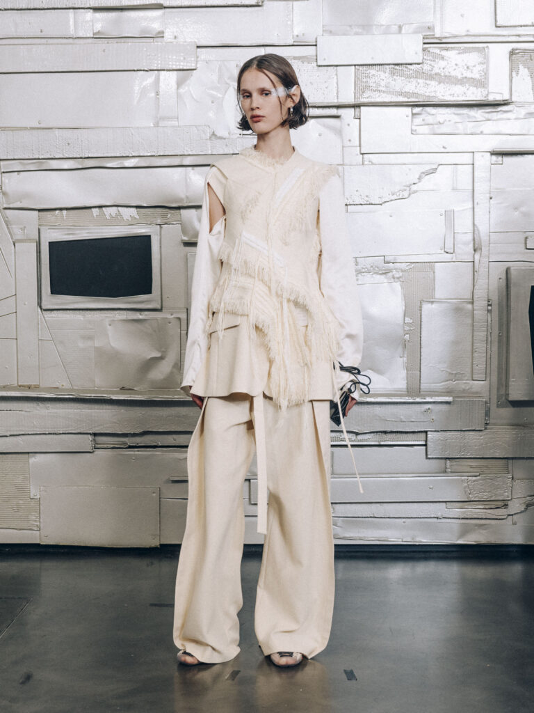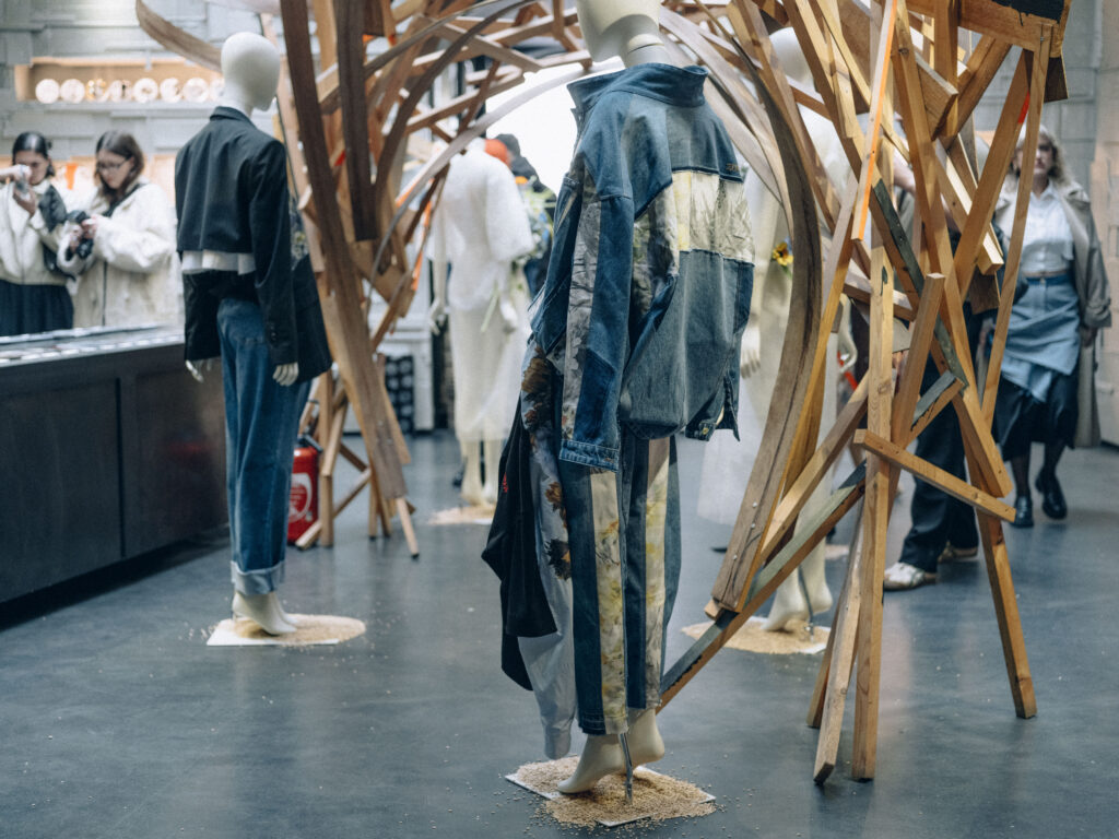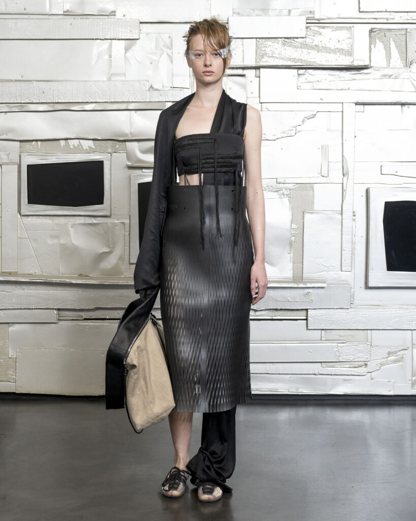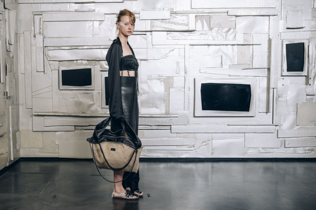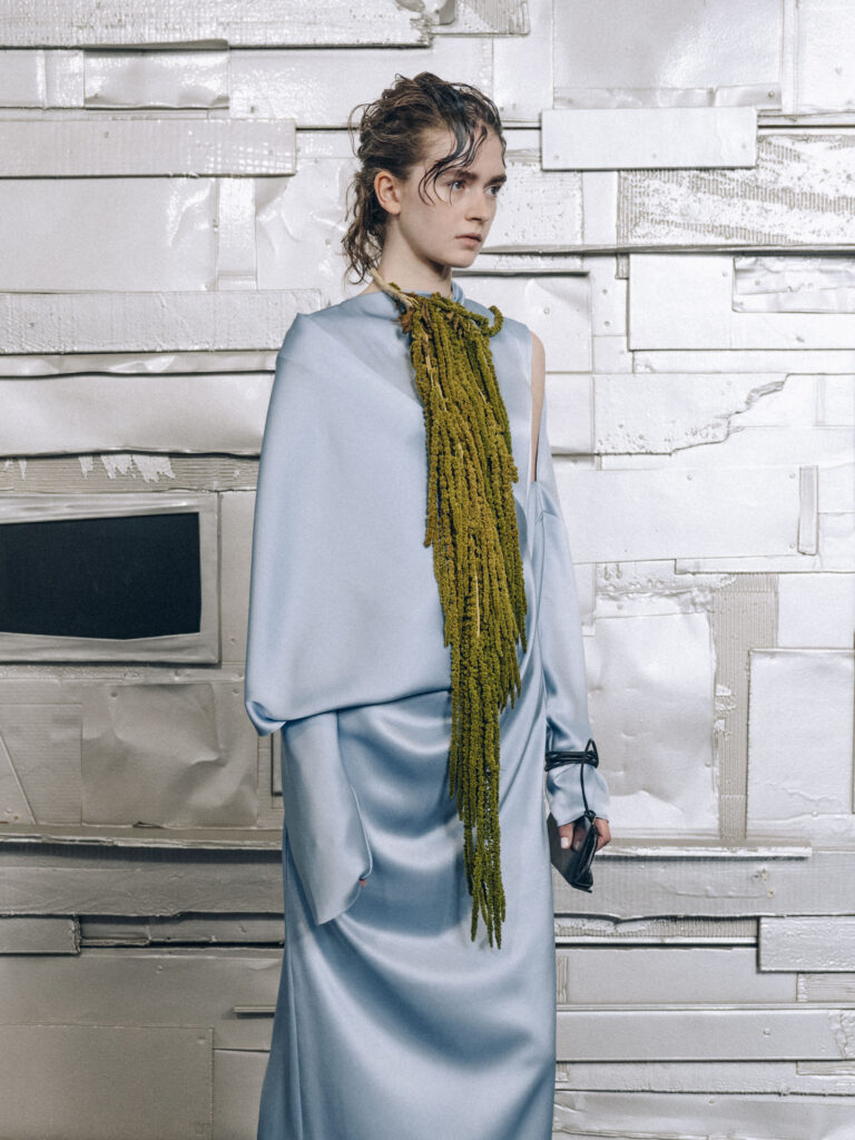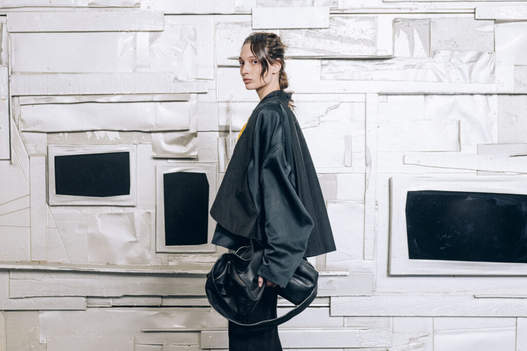 Née de quatre générations de tailleurs, Lilia Litkovska fait revivre les traditions à travers des pièces déconstruites mêlant textures, superpositions et détails métaphoriques. Hauts en maille évoquant des épis de maïs, robes asymétriques et ensembles en simili cuir brillant rappellent les cycles naturels et la gratitude envers la terre.