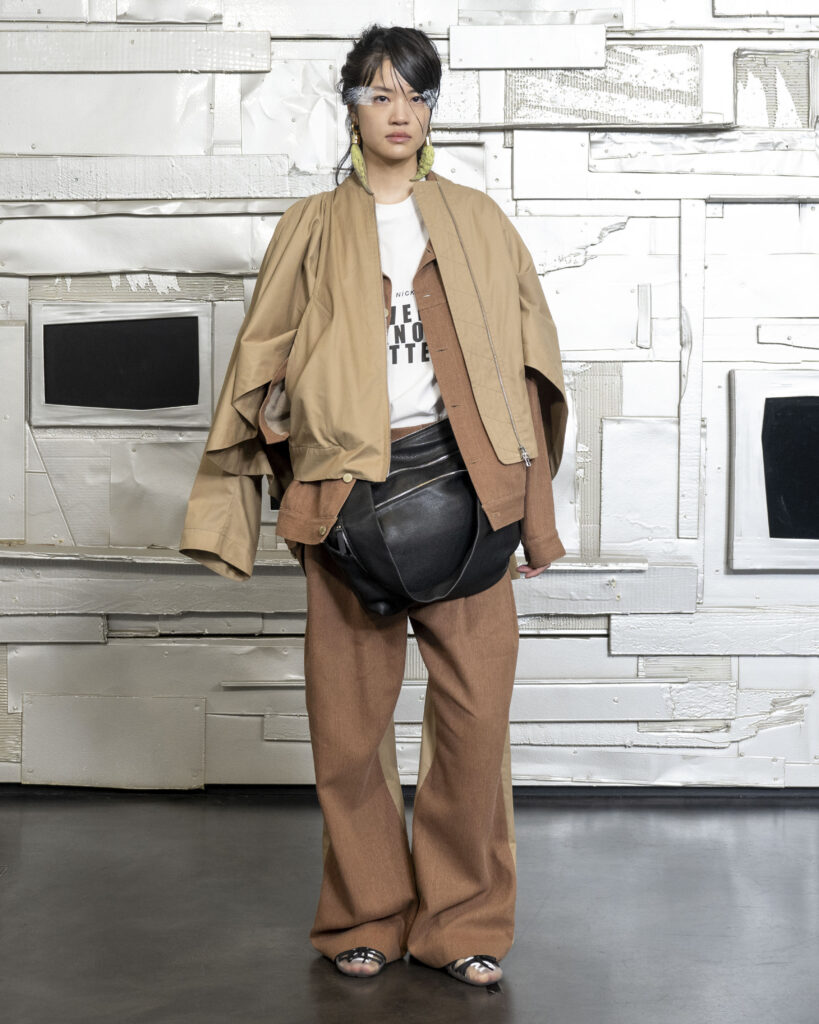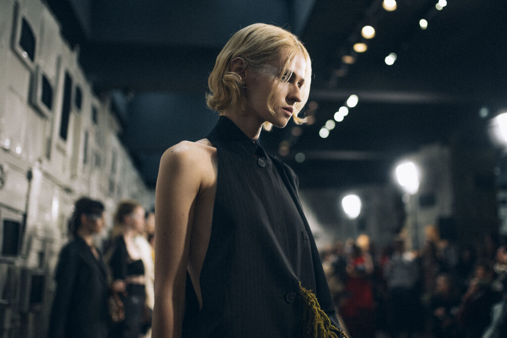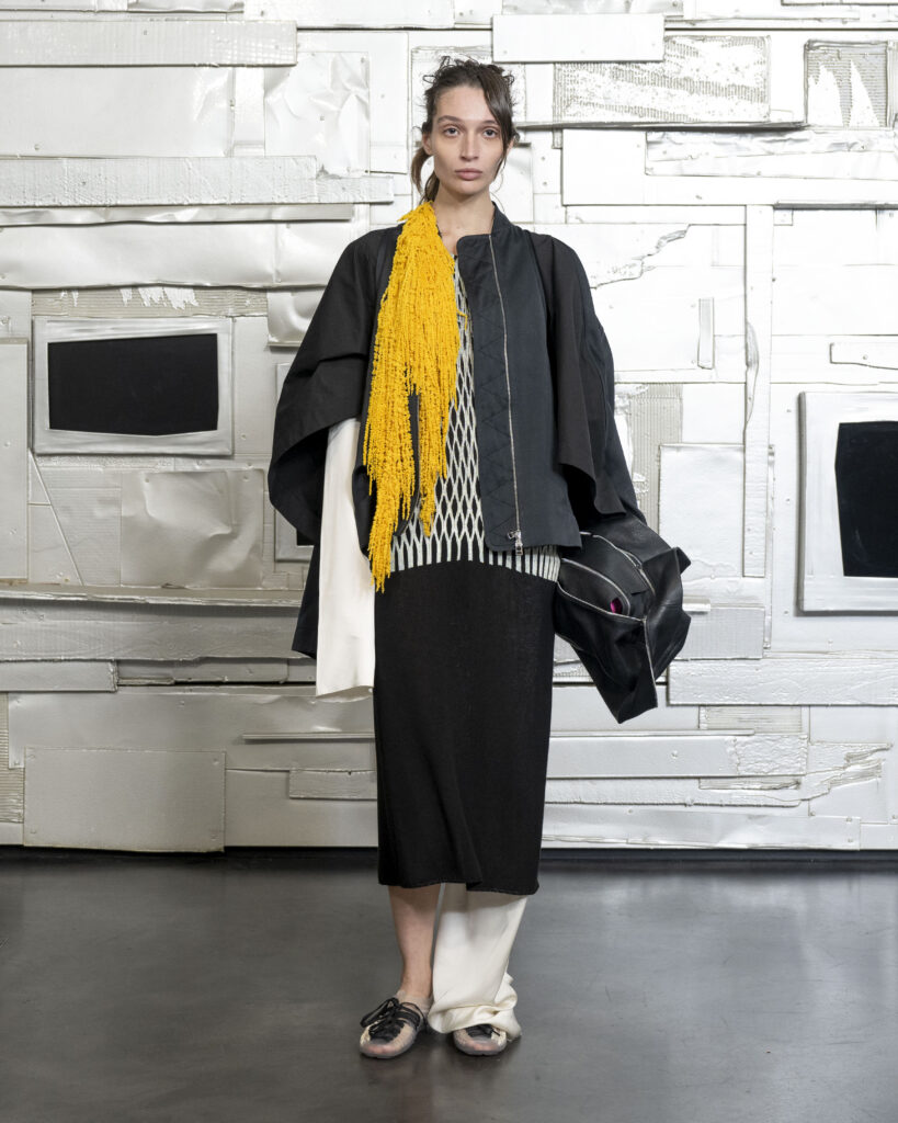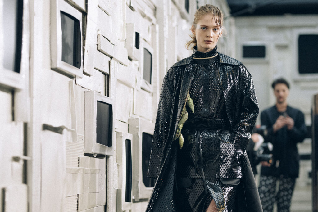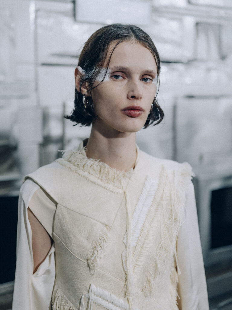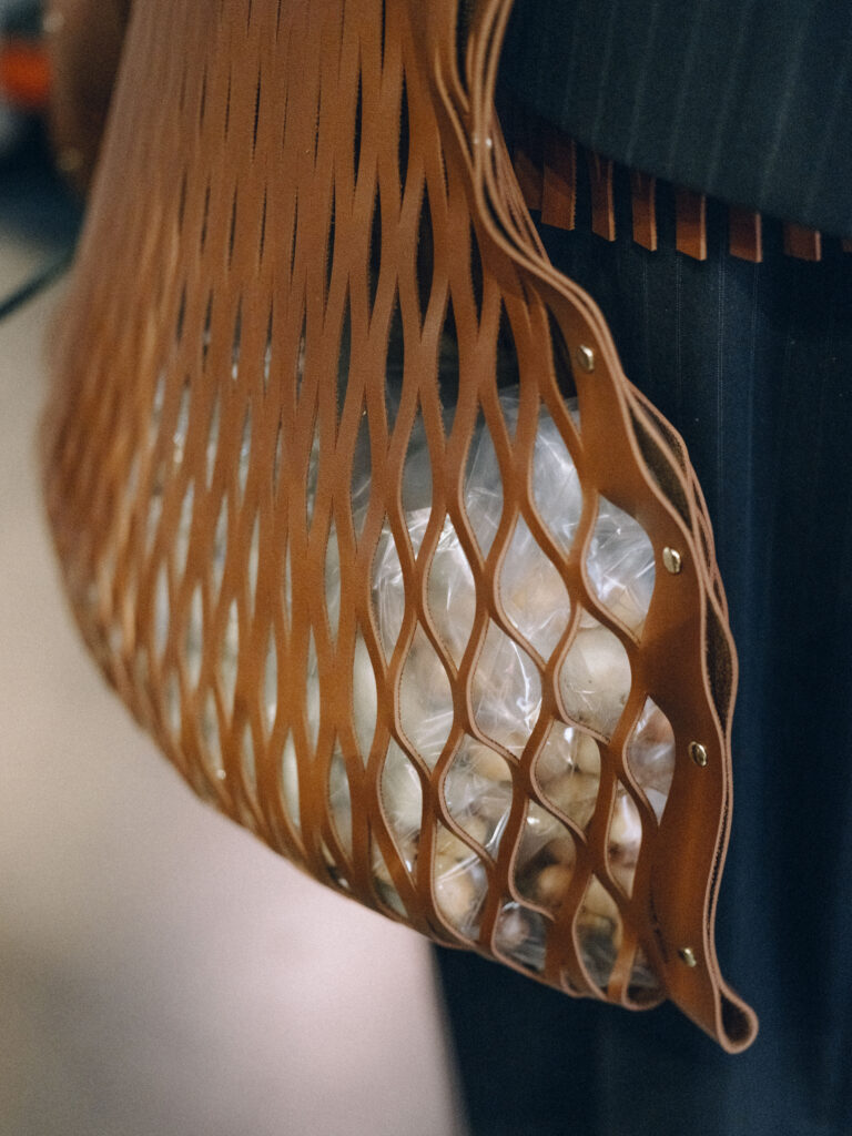 Née de quatre générations de tailleurs, Lilia Litkovska fait revivre les traditions à travers des pièces déconstruites mêlant textures, superpositions et détails métaphoriques. Hauts en maille évoquant des épis de maïs, robes asymétriques et ensembles en simili cuir brillant rappellent les cycles naturels et la gratitude envers la terre.