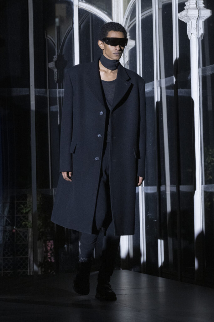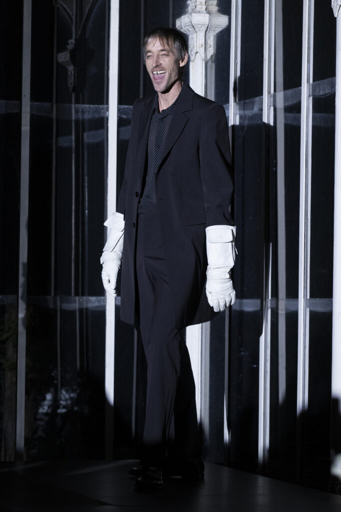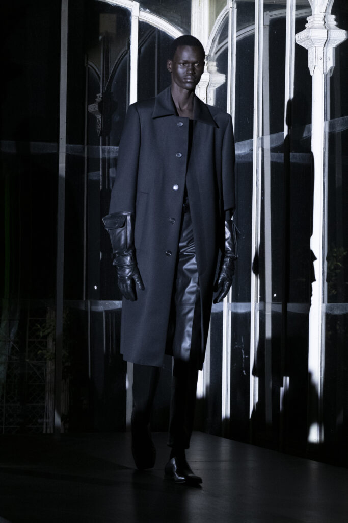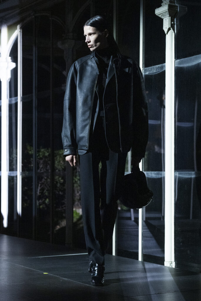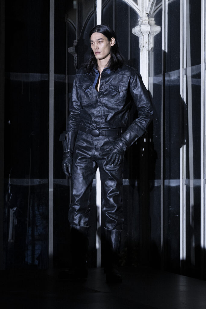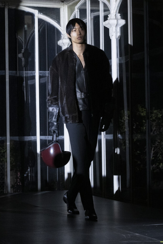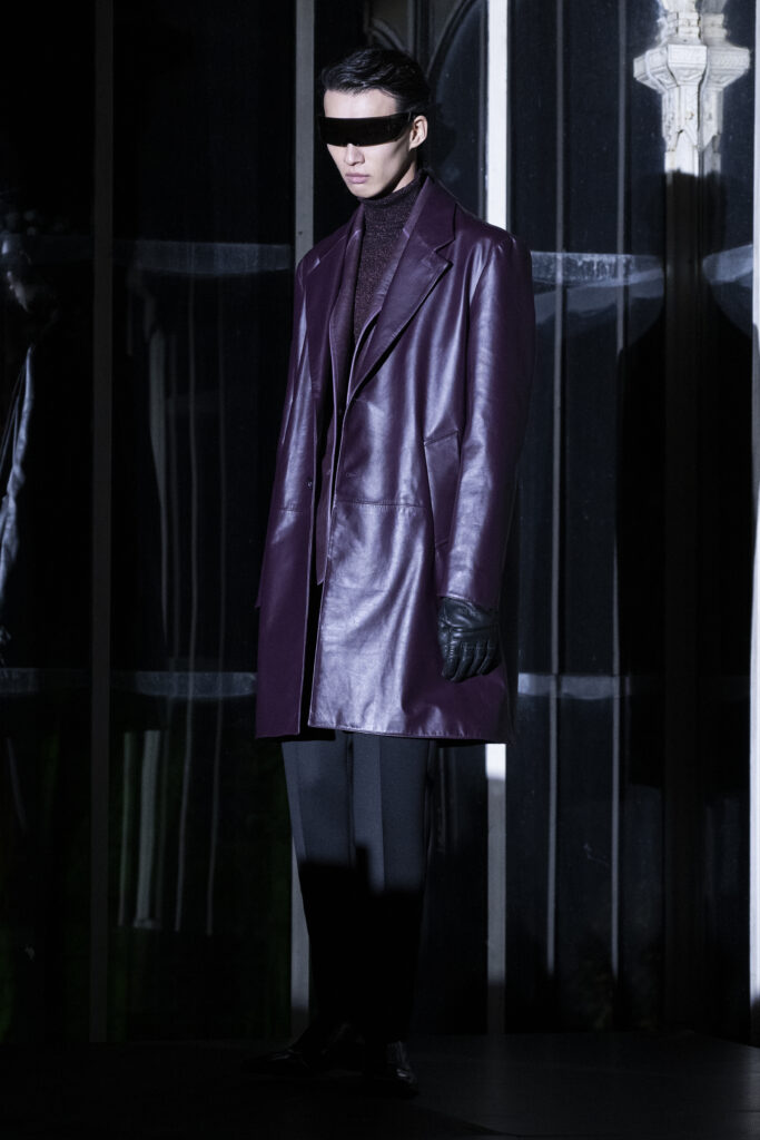 S’inspirant de l’icône jazz Miles Davis, chaque pièce a capturé une dualité : rigueur et liberté. Des trenchs et costumes revisités en textures plastifiées ou en fausse fourrure, aux bombers et vestes en daim usé, le langage stylistique s’est inscrit dans un univers où le fonctionnel côtoie le flamboyant. Les pagodes d’épaules et les imprimés étoilés, échos au style audacieux de Davis, ajoutent une touche narrative à cette collection, bien que l’esthétique globale reste ancrée dans une démarche « non narrative », selon l’ADN de la maison.