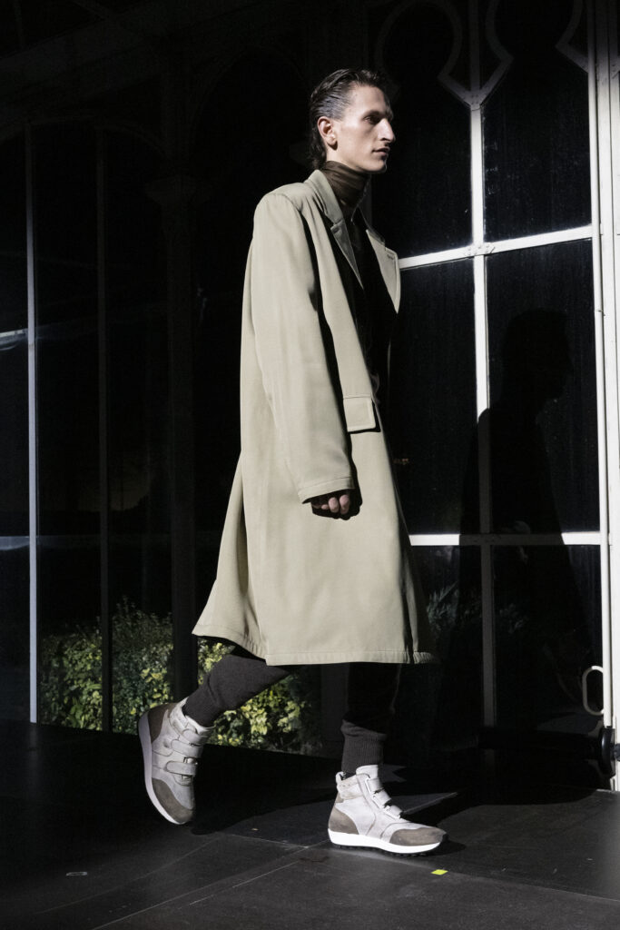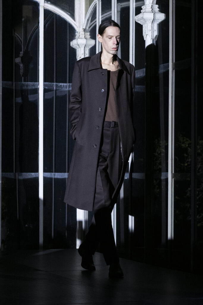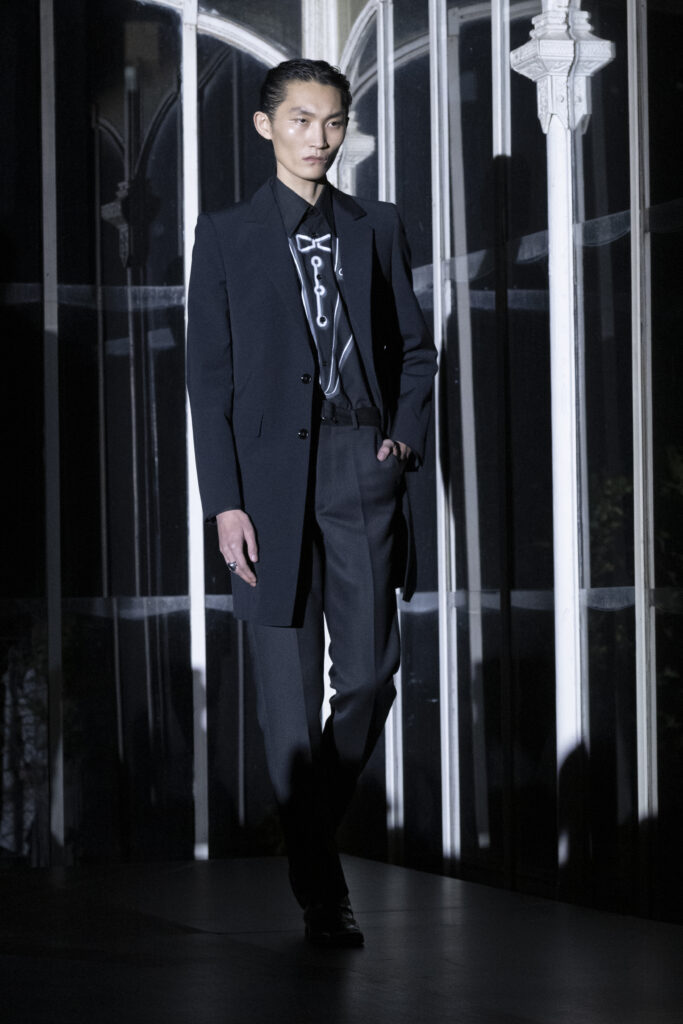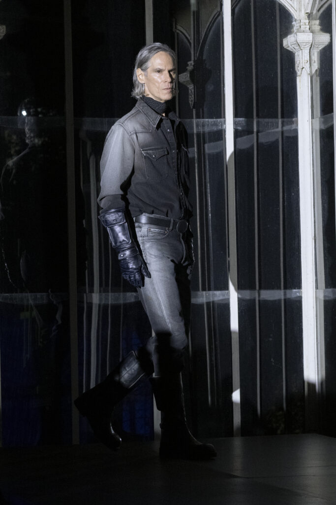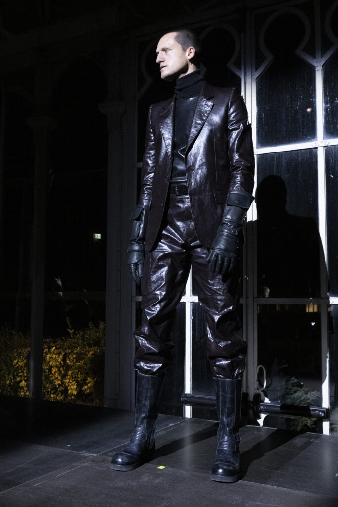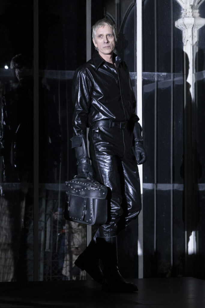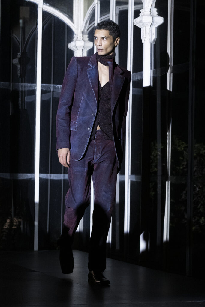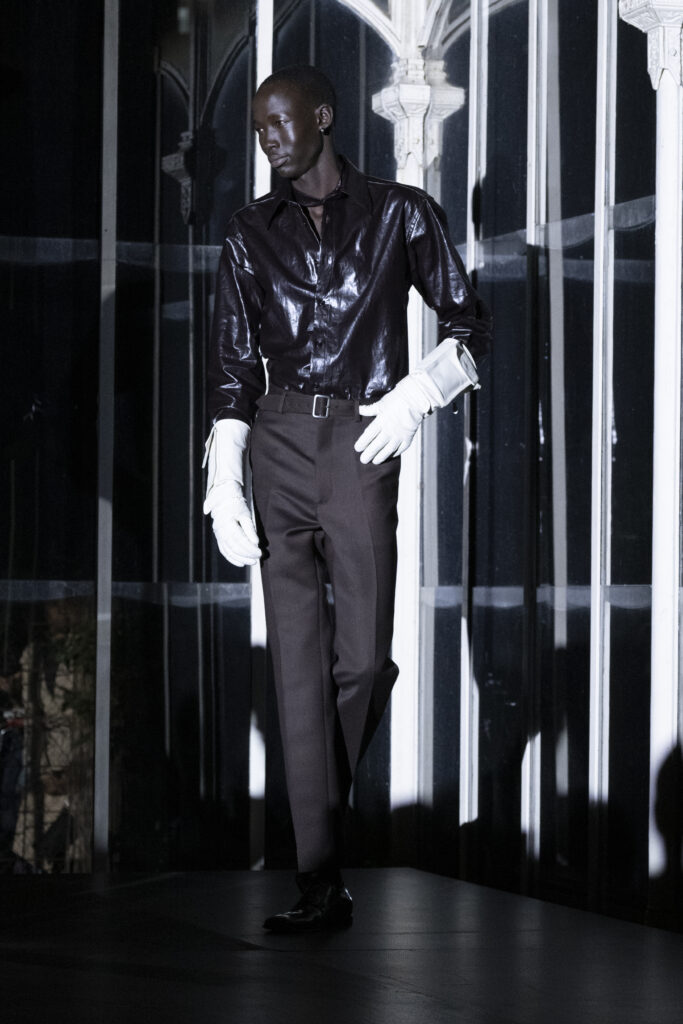 S’inspirant de l’icône jazz Miles Davis, chaque pièce a capturé une dualité : rigueur et liberté. Des trenchs et costumes revisités en textures plastifiées ou en fausse fourrure, aux bombers et vestes en daim usé, le langage stylistique s’est inscrit dans un univers où le fonctionnel côtoie le flamboyant. Les pagodes d’épaules et les imprimés étoilés, échos au style audacieux de Davis, ajoutent une touche narrative à cette collection, bien que l’esthétique globale reste ancrée dans une démarche « non narrative », selon l’ADN de la maison.