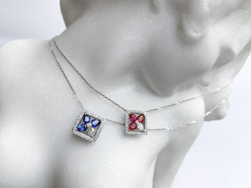 Chaque pièce de la collection Précieux s’impose par une esthétique graphique remarquable. Au cœur du design, un carré pavé de diamants capture une délicate fleur, dont les pétales jouent avec des teintes éclatantes et contrastées. Un pétale, orné d’un diamant taillé avec précision, illumine l’ensemble, tandis que les trois autres, sertis de saphirs ou de rubis taillés en poire, dansent sous la lumière.