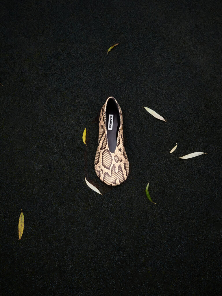 La collection met en avant l’héritage artisanal de Jil Sander, avec des pièces subtilement inspirées par le serpent, symbole de transformation et de résilience. Les matériaux et les détails incarnent cette idée : des cuirs de la plus haute qualité, imprimés pour imiter la texture sinueuse et élégante de la peau de serpent, et des nuances sophistiquées allant du crème au brun et noir, évoquent la puissance mystique de cet animal totem.