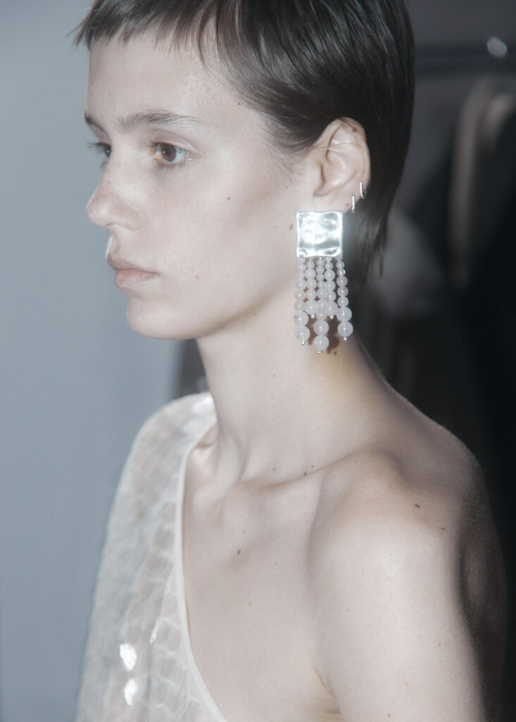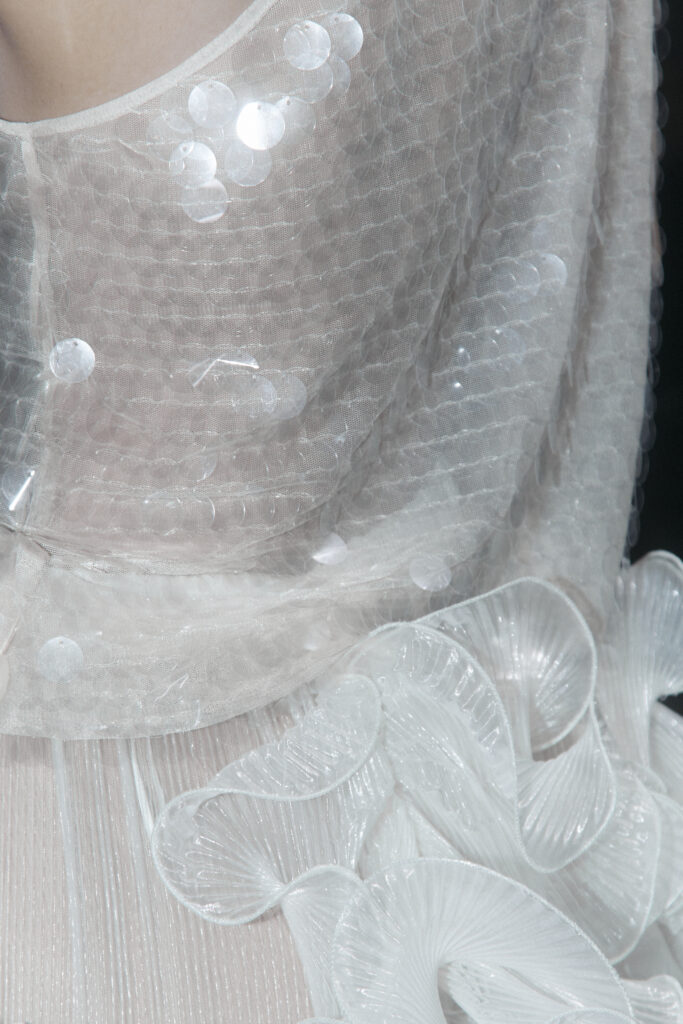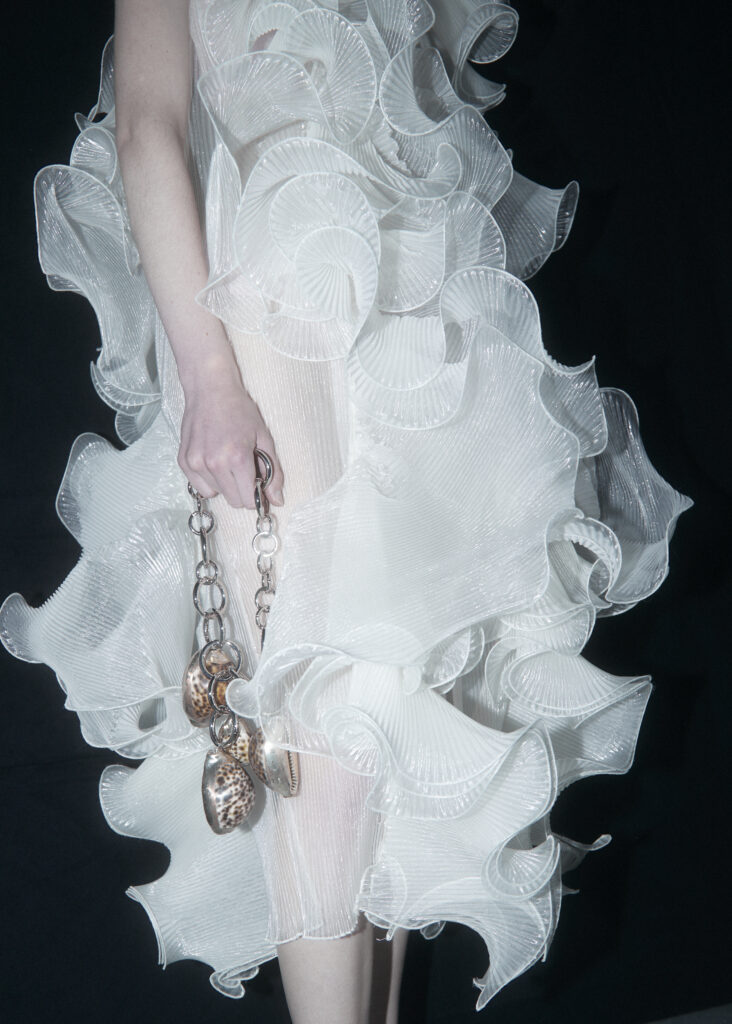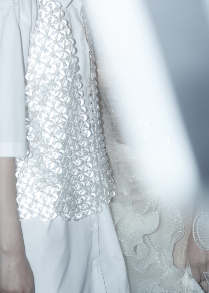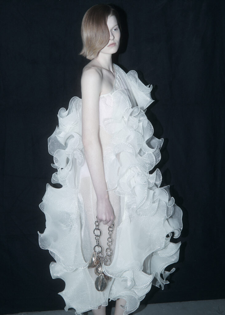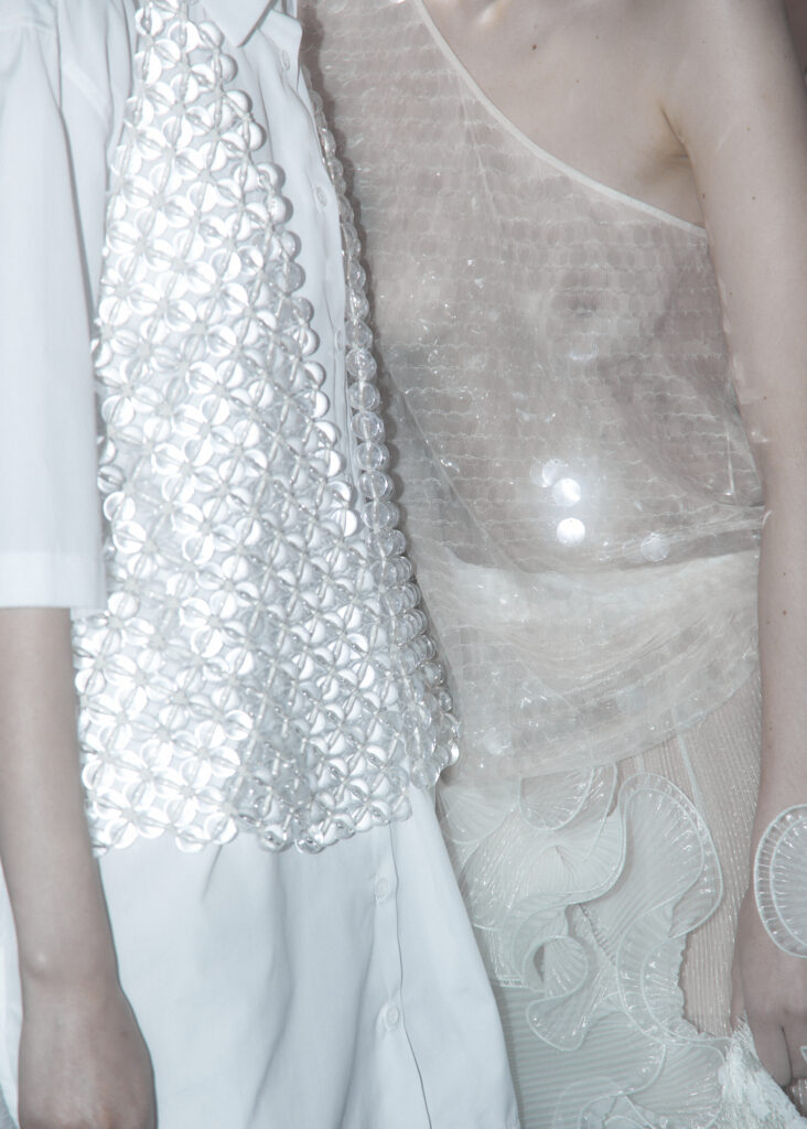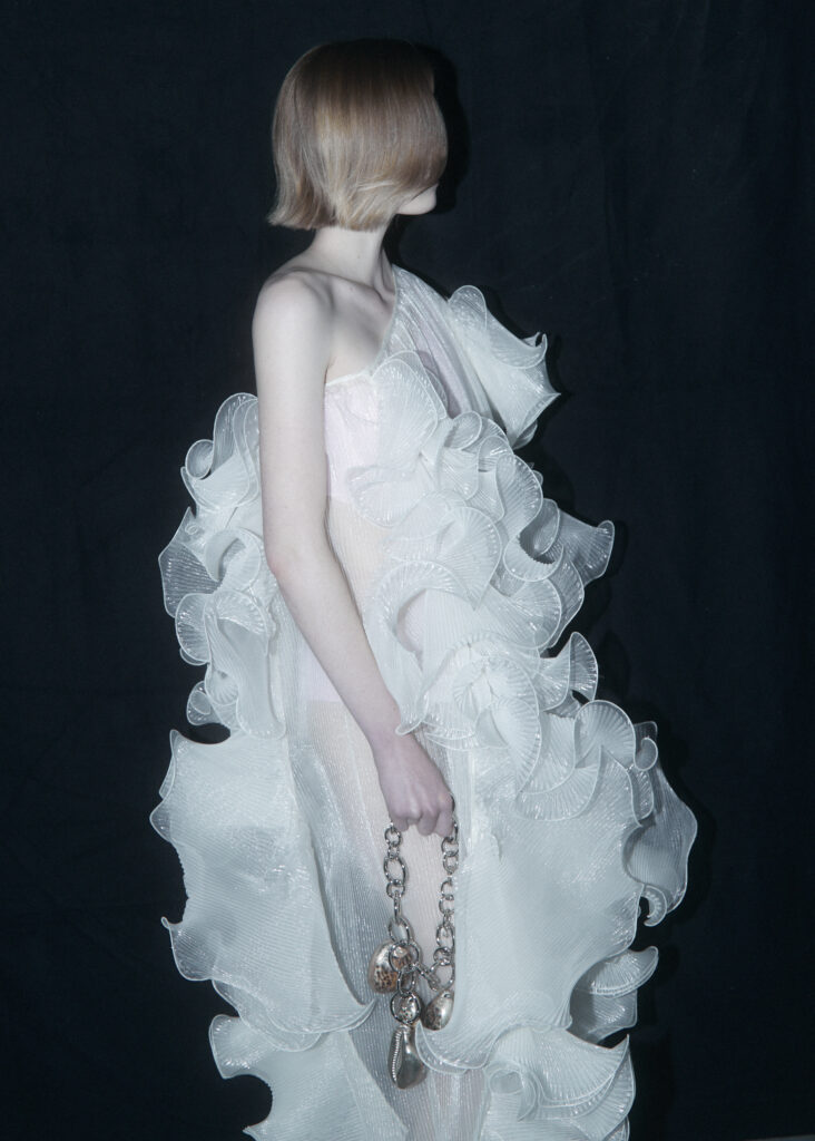 Pasqualetti s’inspire de l’élément aquatique, évoquant des sensations de pureté et de transformation. Des éléments inattendus tels que des coquillages attachés à des chaînes métalliques ou des gouttes de cristal suspendues, transforment les vêtements en souvenirs poétiques.