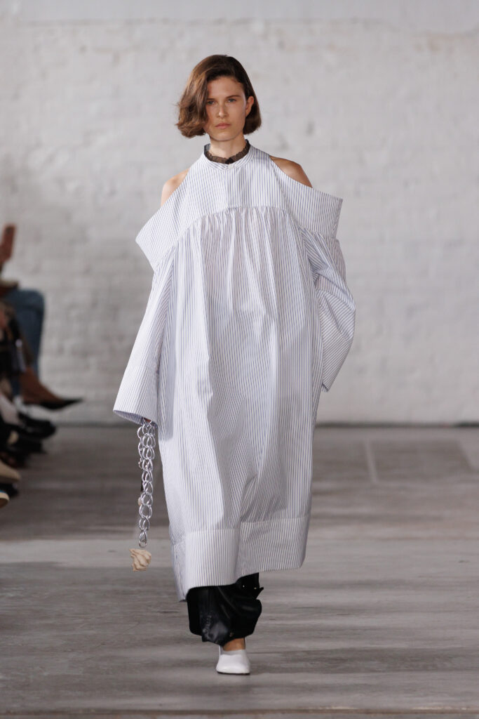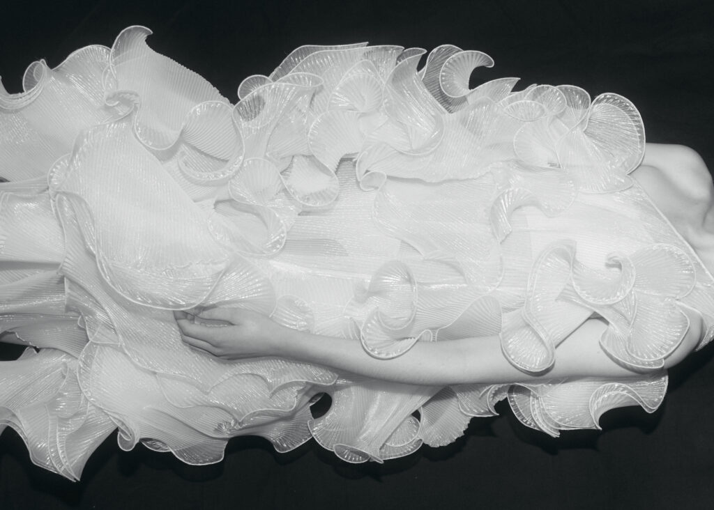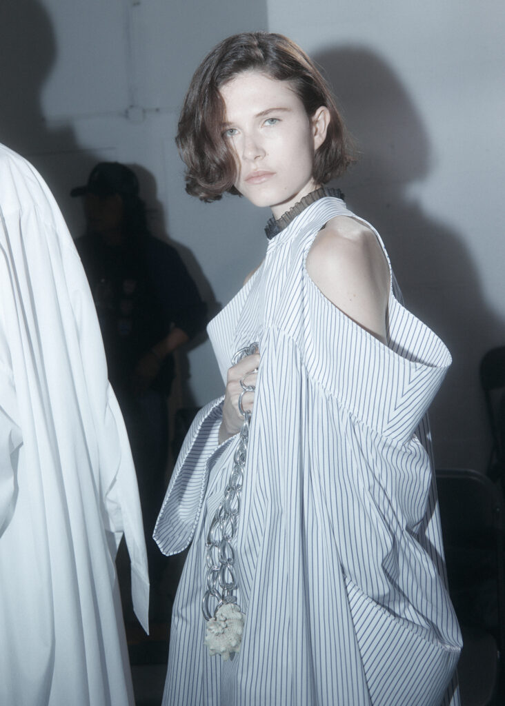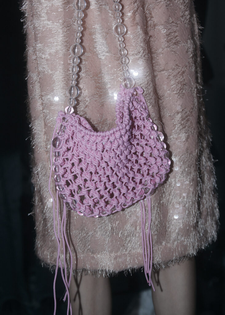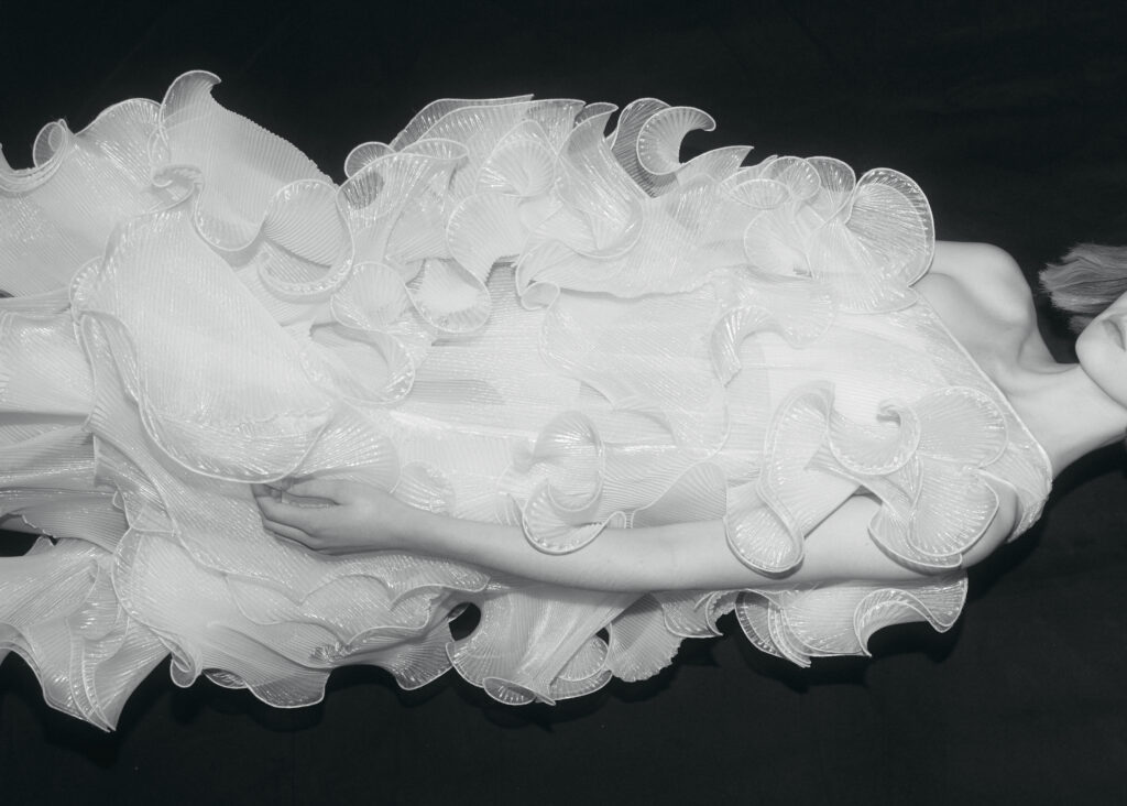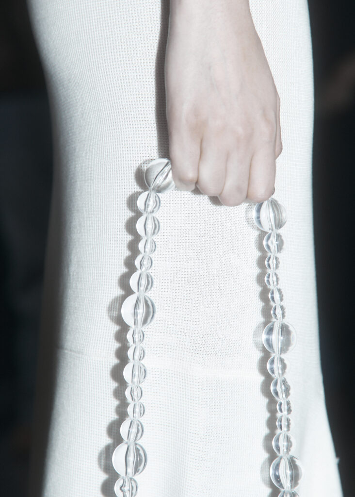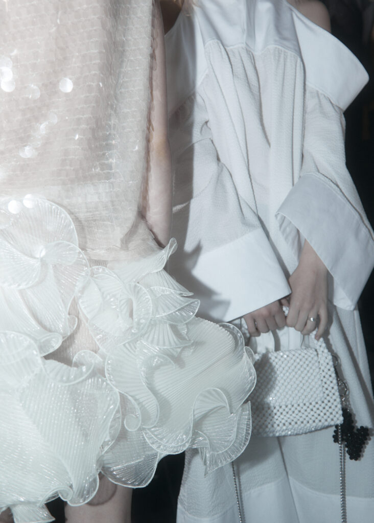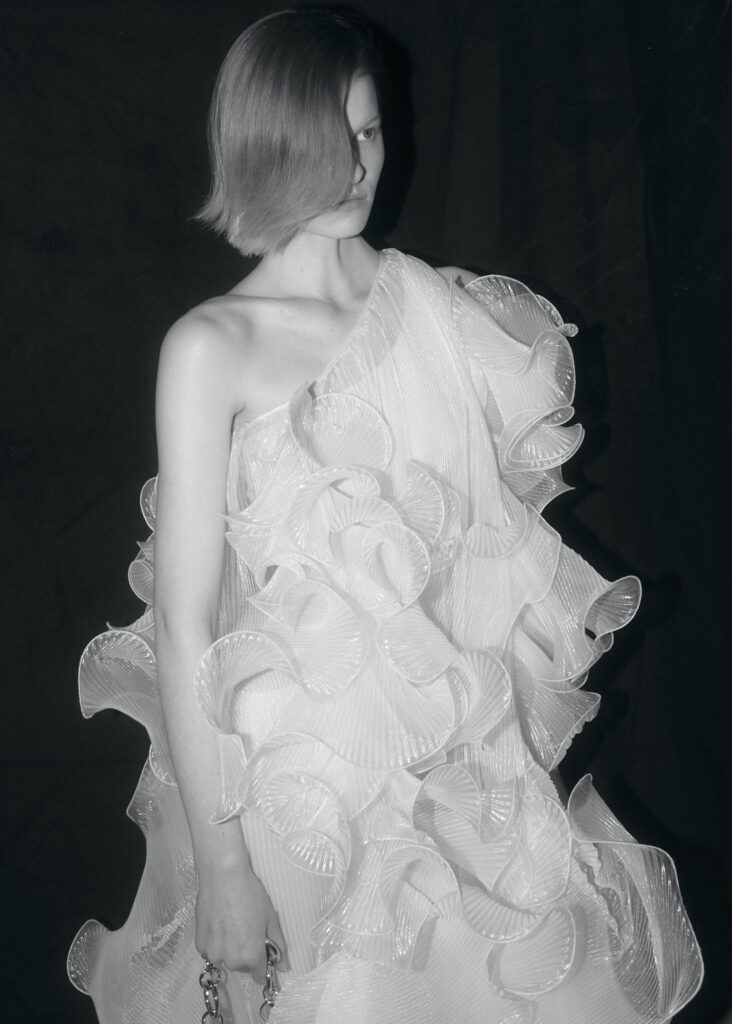 Pasqualetti s’inspire de l’élément aquatique, évoquant des sensations de pureté et de transformation. Des éléments inattendus tels que des coquillages attachés à des chaînes métalliques ou des gouttes de cristal suspendues, transforment les vêtements en souvenirs poétiques.