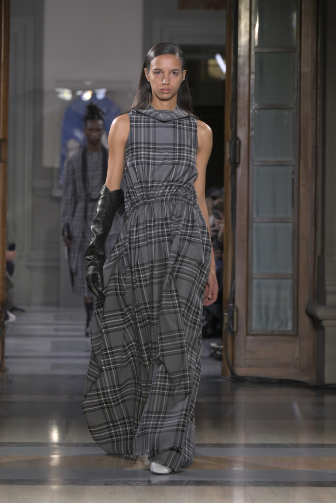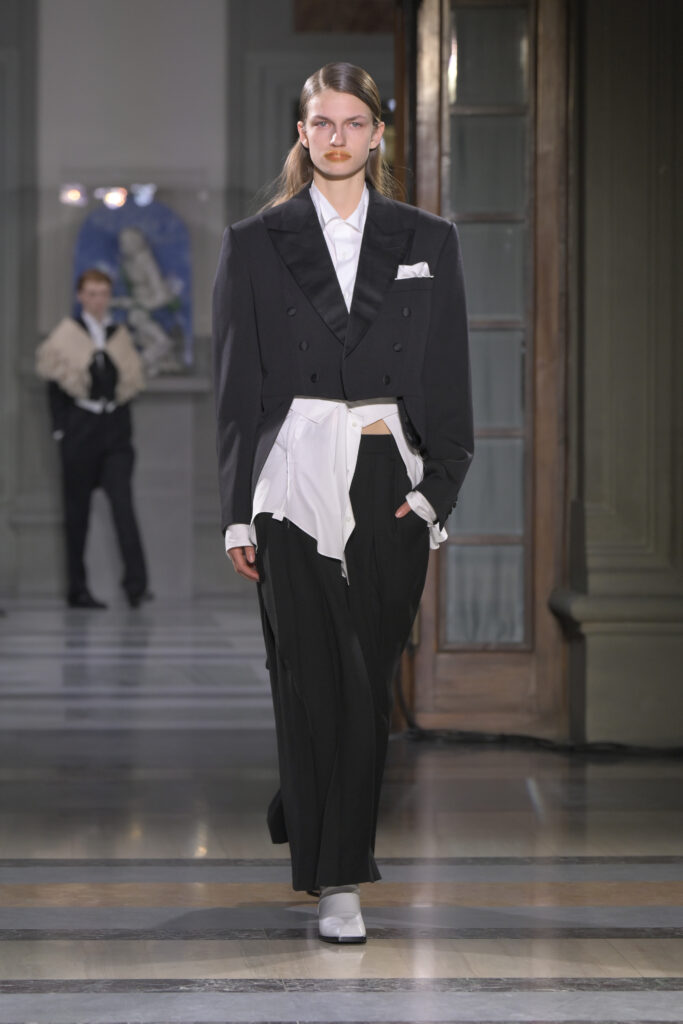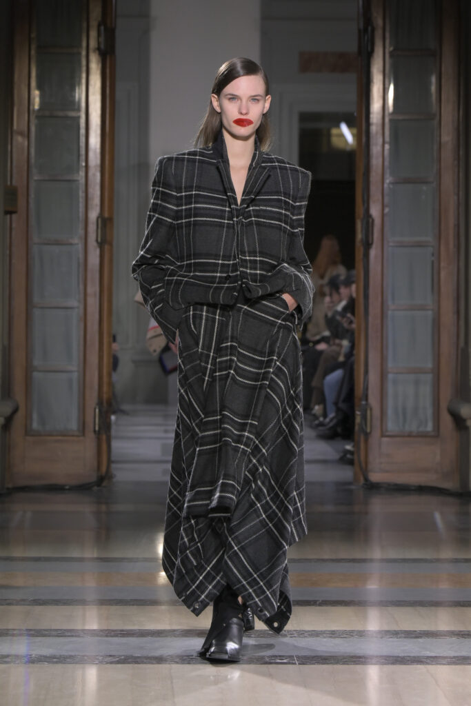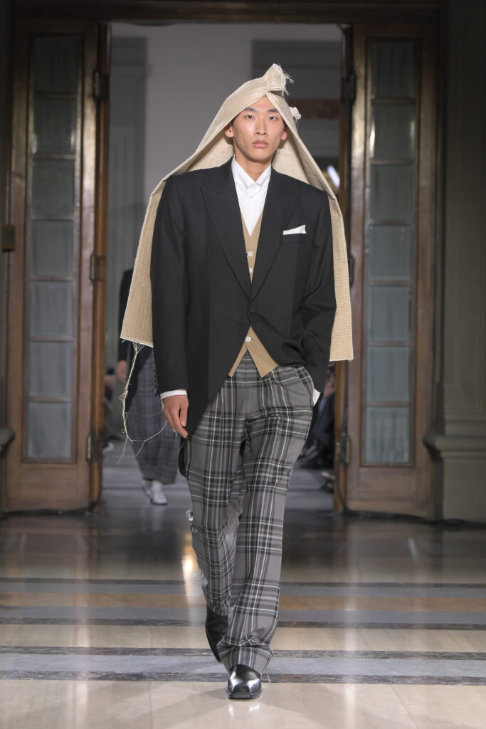 À partir d’un carré plié, la collection évolue en silhouettes ingénieuses. Les vestes safari et les manteaux se raccourcissent, les blazers s’étendent en panneaux, et les queues de frac peuvent être rentrées. Les couleurs monochromes – noir, blanc et gris – évoquent la simplicité élégante de la télévision en noir et blanc, tandis qu’un tartan gris et noir sert de signature de saison.