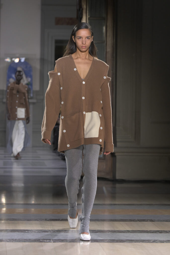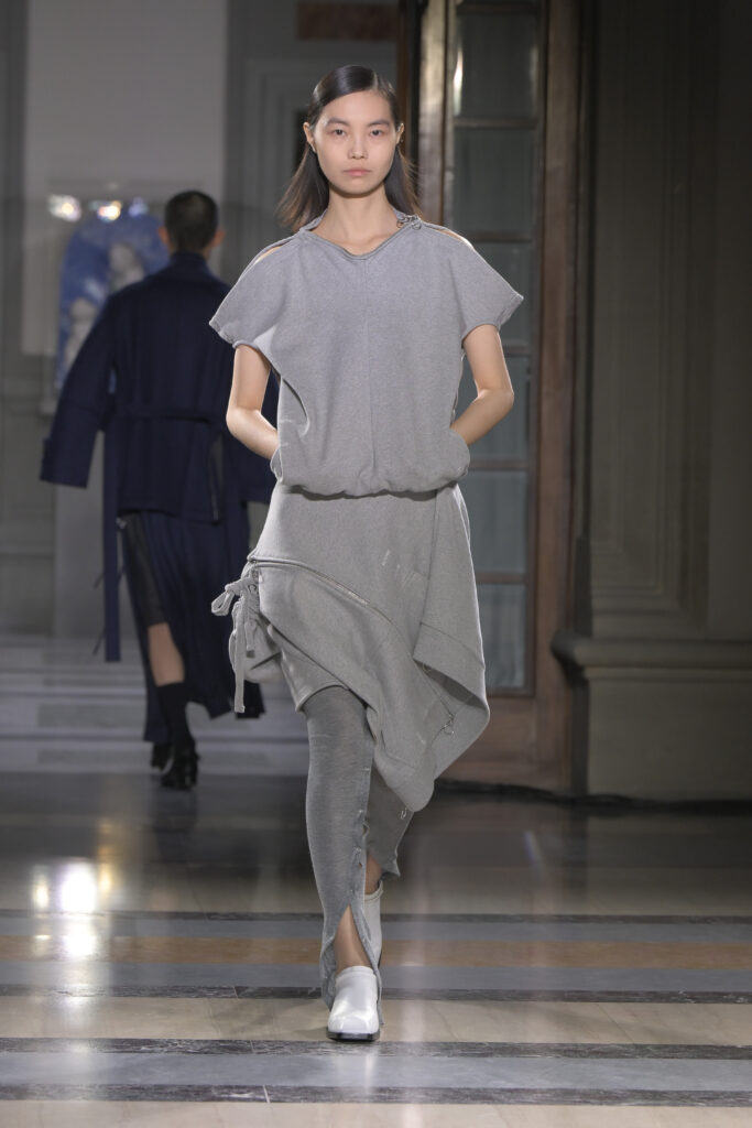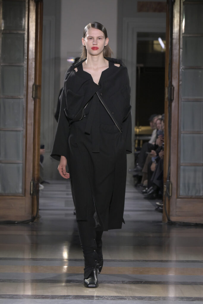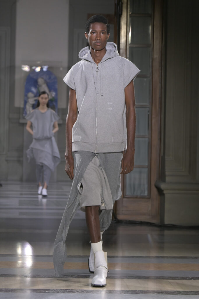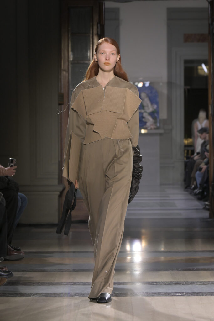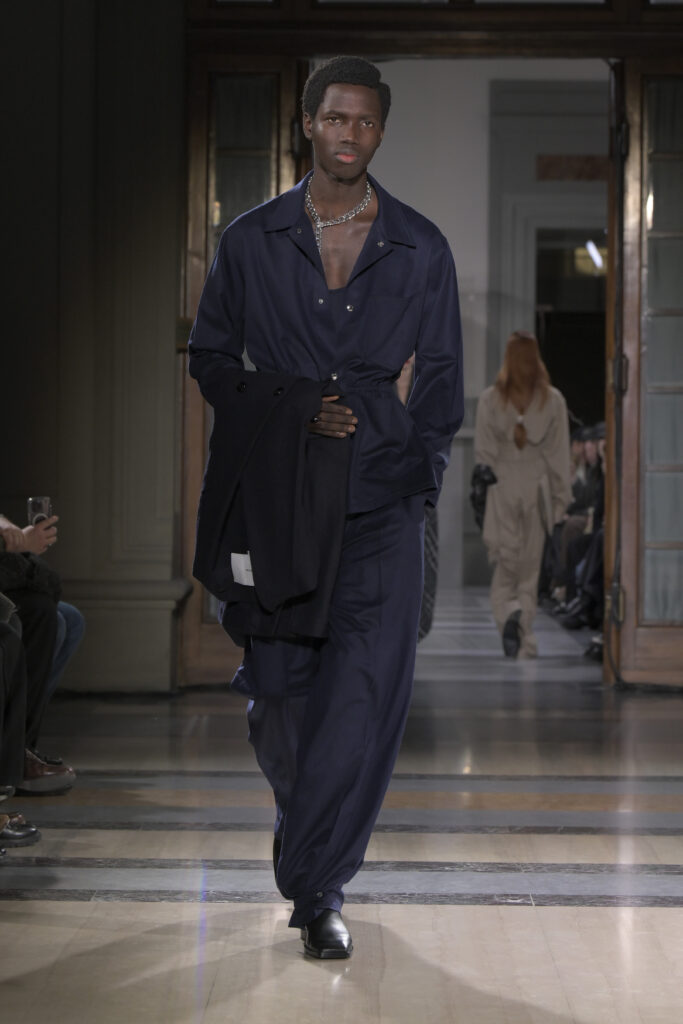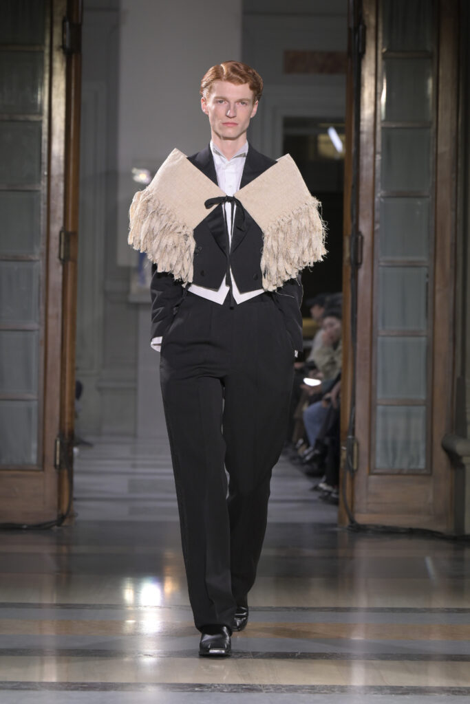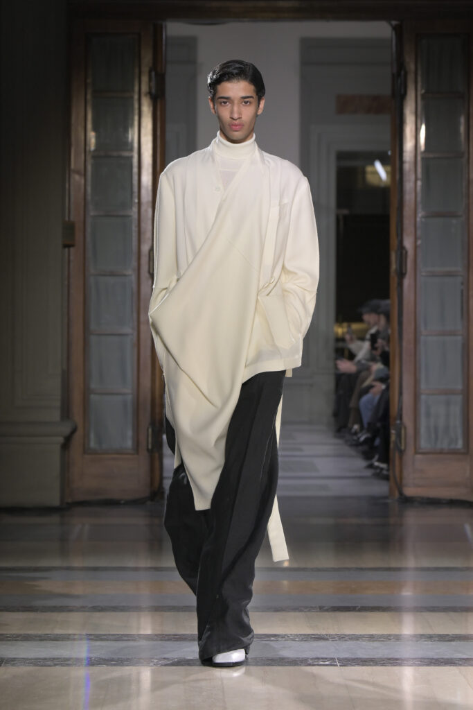 La collection Automne/Hiver 2025 de Setchu, dirigée par Satoshi Kuwata, se concentre sur l’idée de « moins pour plus ». Inspirée par l’origami, chaque pièce traduit la tension créative entre la culture japonaise et le tailoring occidental, fusionnant formes plates et volumes tridimensionnels. La multifonctionnalité est au cœur de cette philosophie : chaque vêtement peut être transformé selon les besoins ou les envies du porteur.