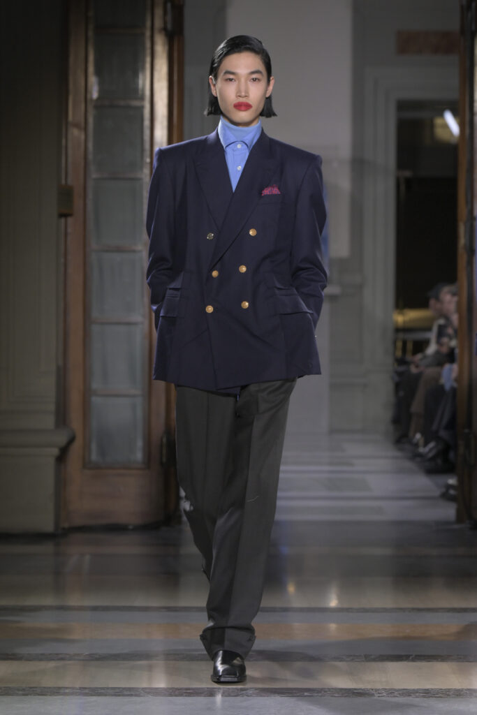 Des pièces clés, comme un habit de matin, une veste croisée bleue aux boutons dorés et une veste à queue, ont été réalisées en partenariat avec Davies & Sons, la plus ancienne maison de tailoring de Savile Row. Ces vêtements incarnent l’esprit Setchu : minimalisme et adaptabilité à travers une construction inspirée de l’origami.