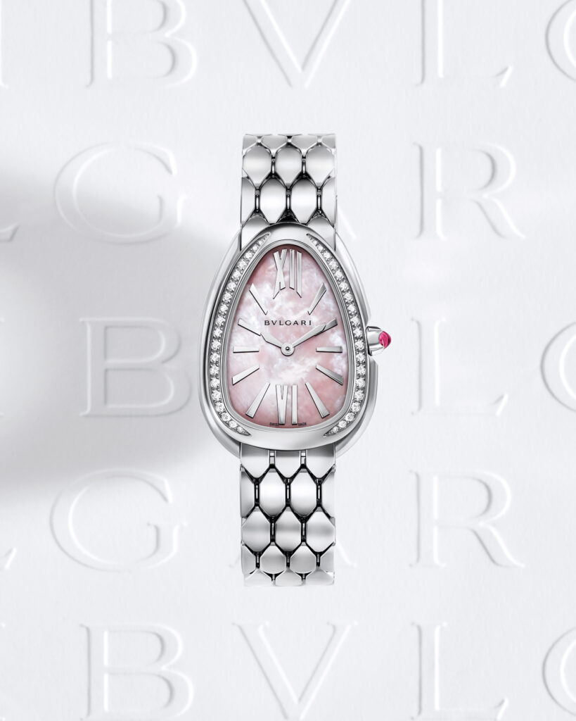 Limitée à 188 exemplaires, la montre Serpenti Seduttori affiche un cadran en nacre rose, un boîtier en acier inoxydable rehaussé d’une rubellite rose et un bracelet articulé en écailles hexagonales. Gravée de l’inscription Limited Edition, elle illustre l’élégance et l’innovation de la Maison romaine.