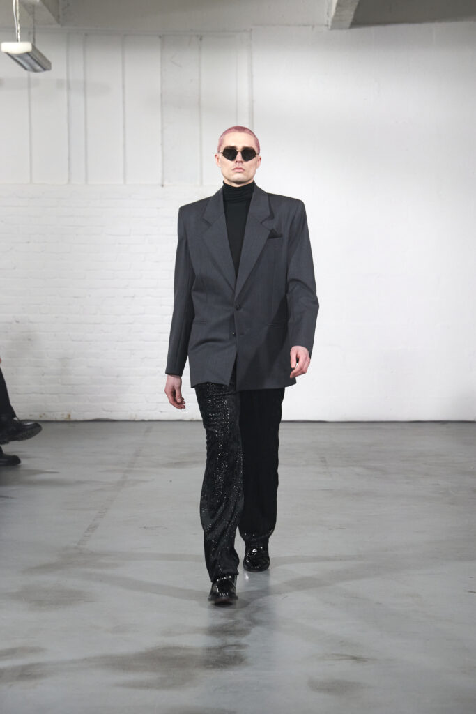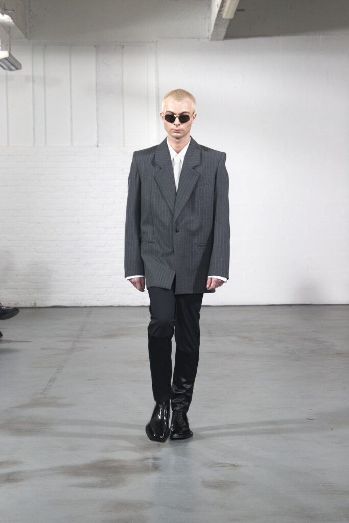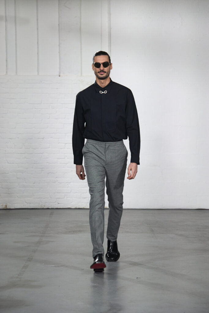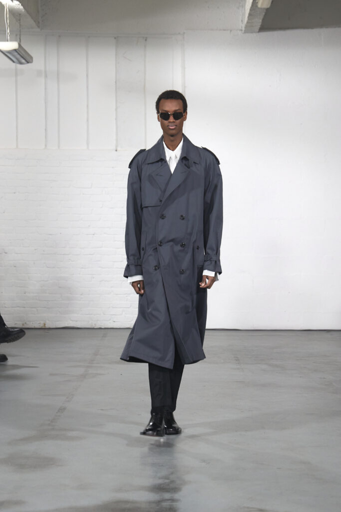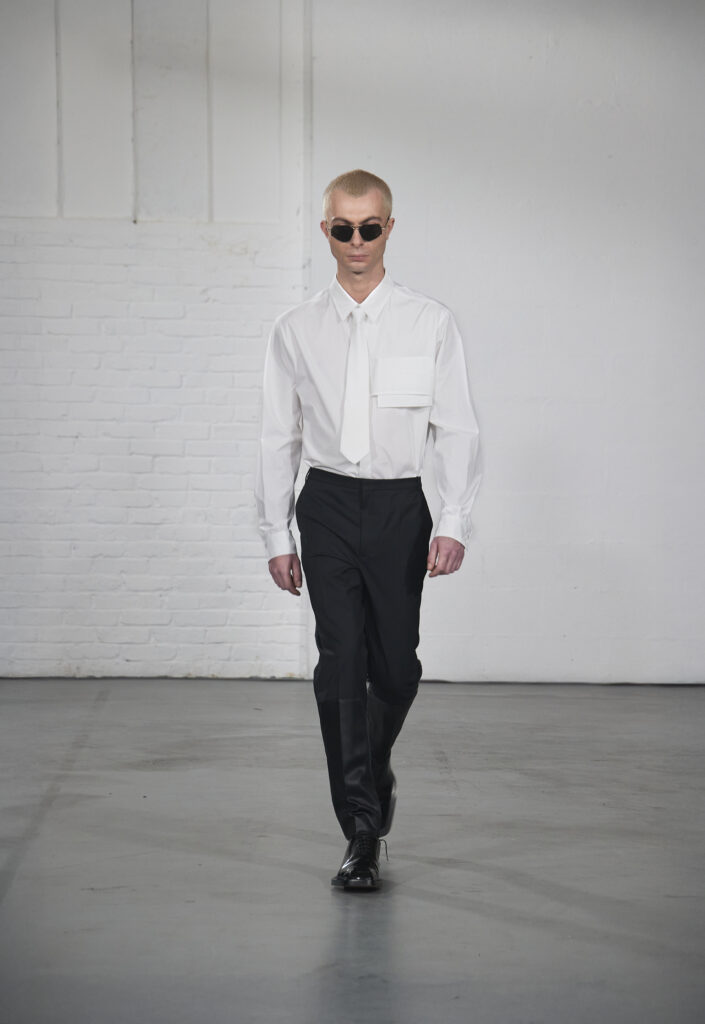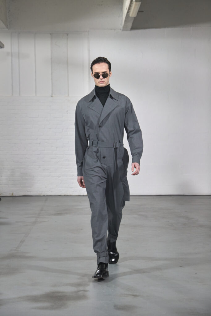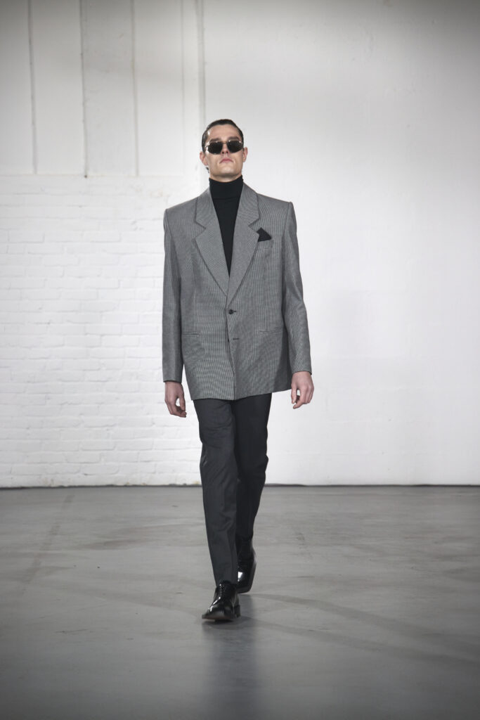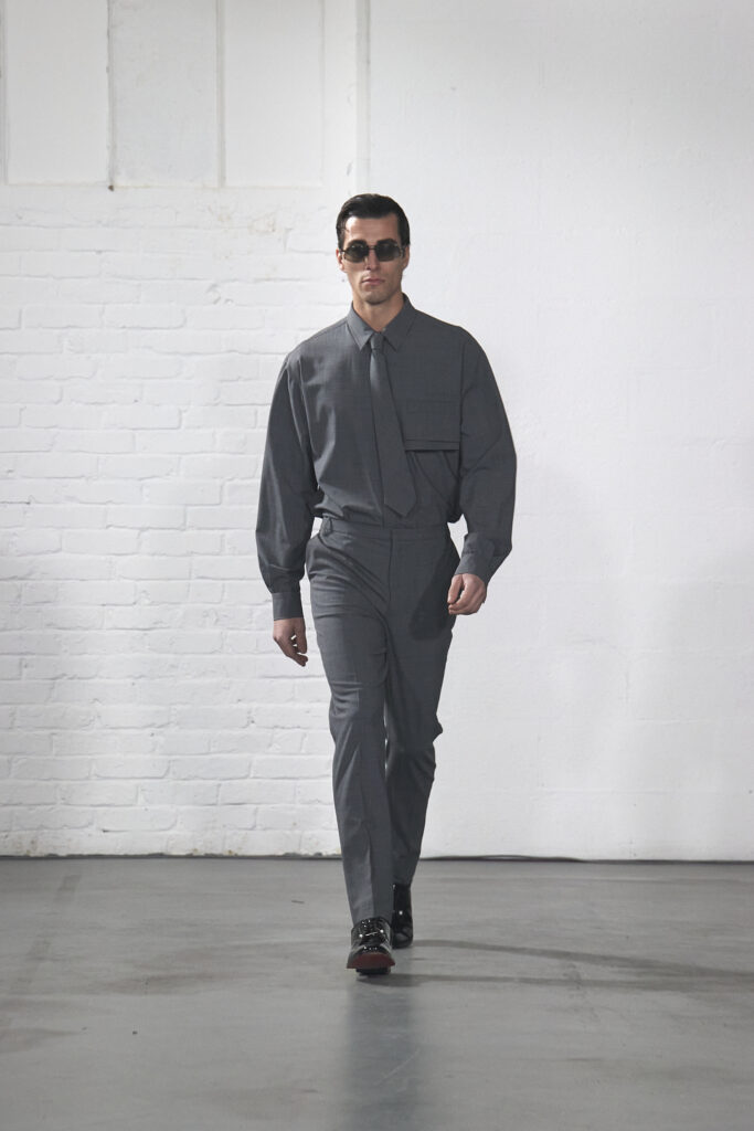 La palette chromatique, délibérément sobre, explore toutes les nuances de gris, du noir absolu au blanc néon. Un motif pied-de-poule et un imprimé inspiré du brouillard viennent dynamiser cette proposition austère et sophistiquée.