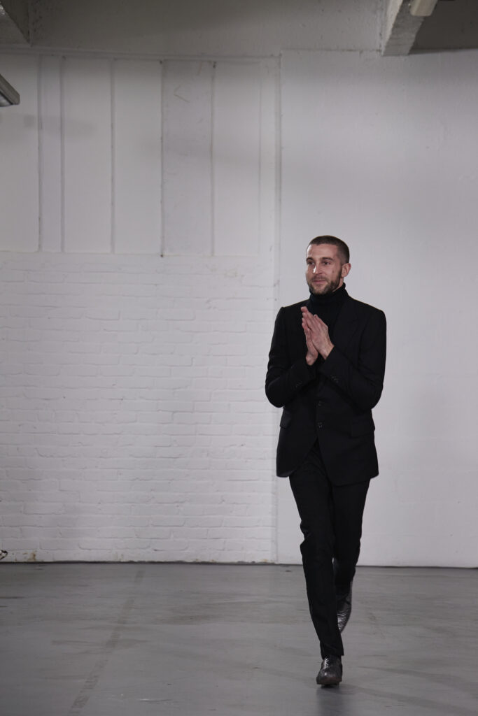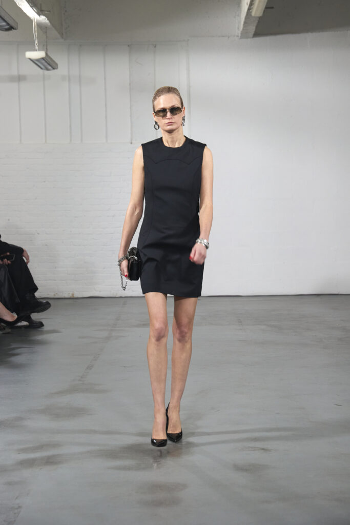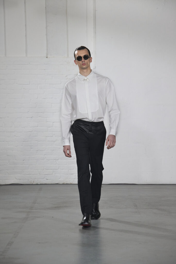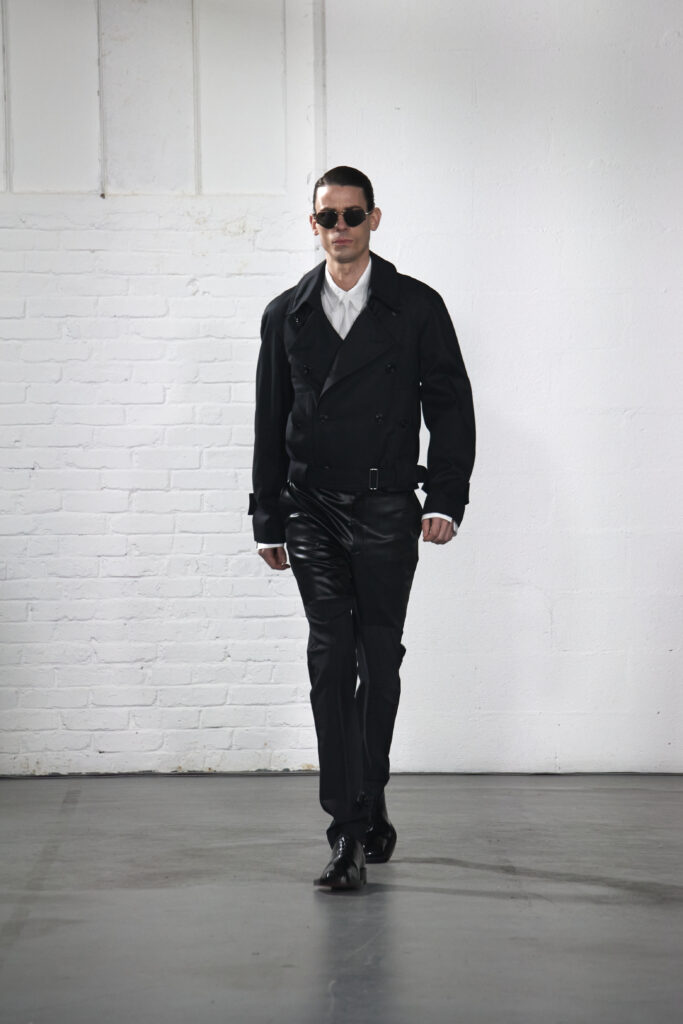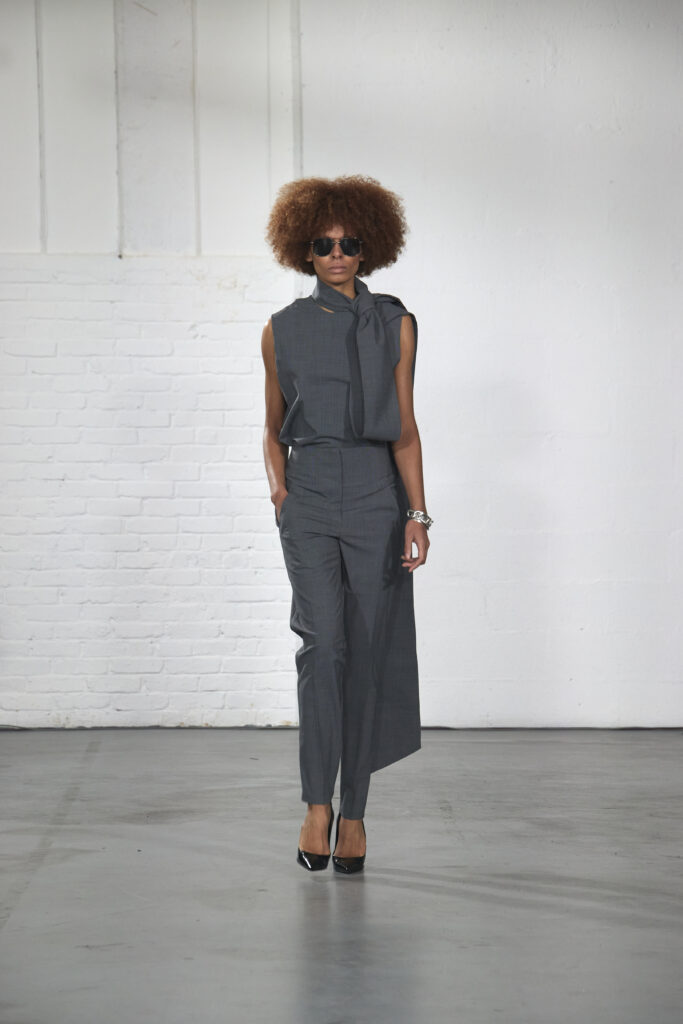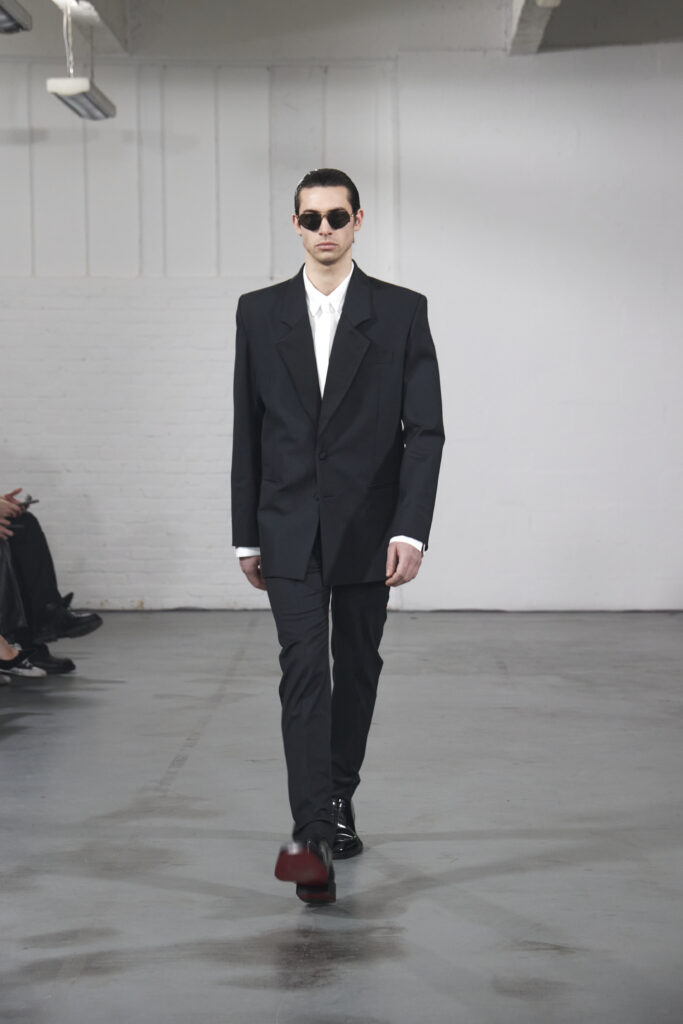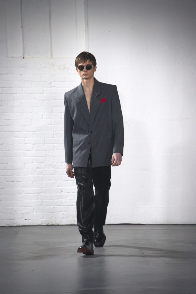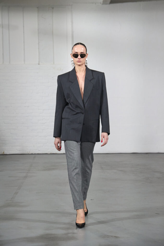 La palette chromatique, délibérément sobre, explore toutes les nuances de gris, du noir absolu au blanc néon. Un motif pied-de-poule et un imprimé inspiré du brouillard viennent dynamiser cette proposition austère et sophistiquée.