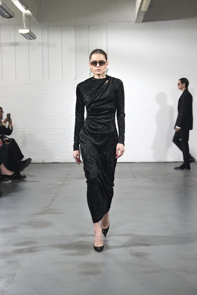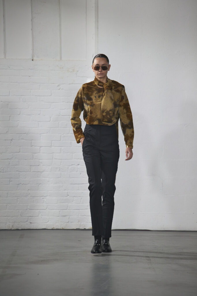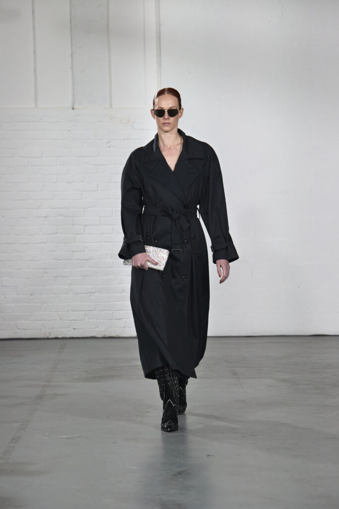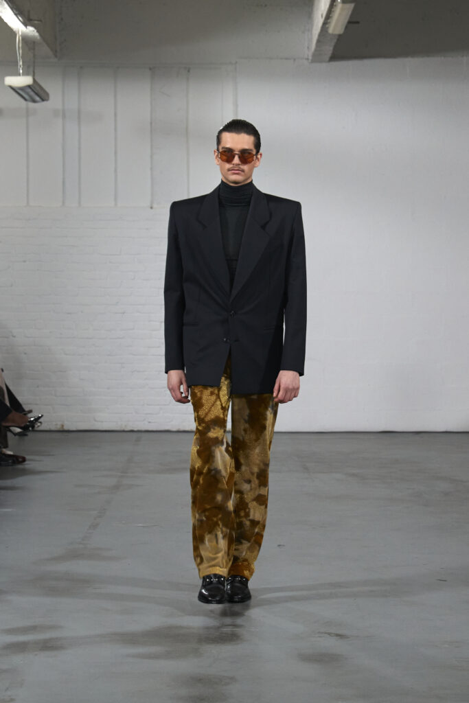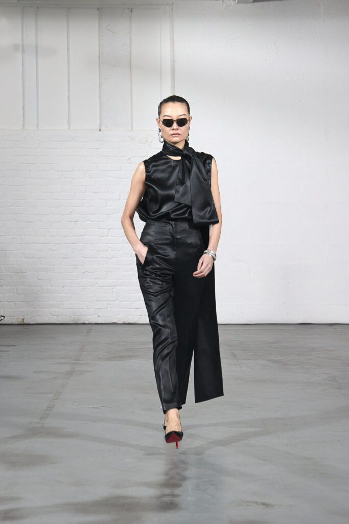 Les silhouettes, aux lignes acérées et structurées, oscillent entre masculin et féminin, à l’image d’un Bowie affranchi des genres. Le trench-coat se métamorphose en robe du soir, la veste en shearling se fait pièce maitresse, et la robe chemise sans manches s’impose comme un incontournable du vestiaire hivernal. Les coupes sont précises, les finitions raffinées, et les matières luxueuses. Laine technique infroissable, voile de laine, jersey de velours, velours dévoré sur denim… Valette Studio privilégie la qualité et le savoir-faire.