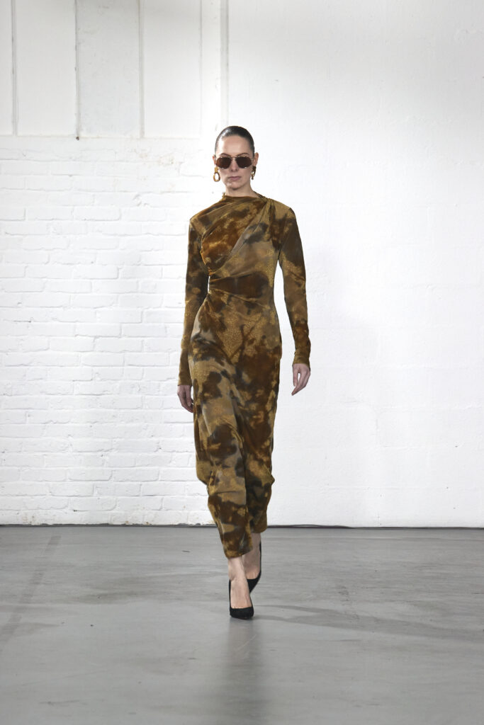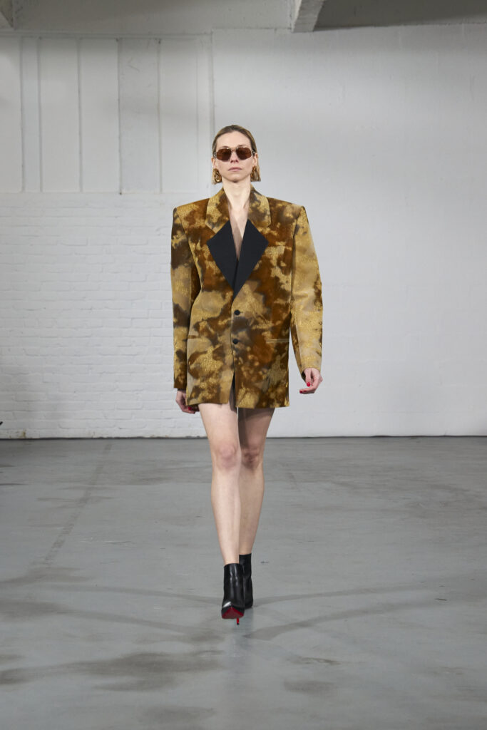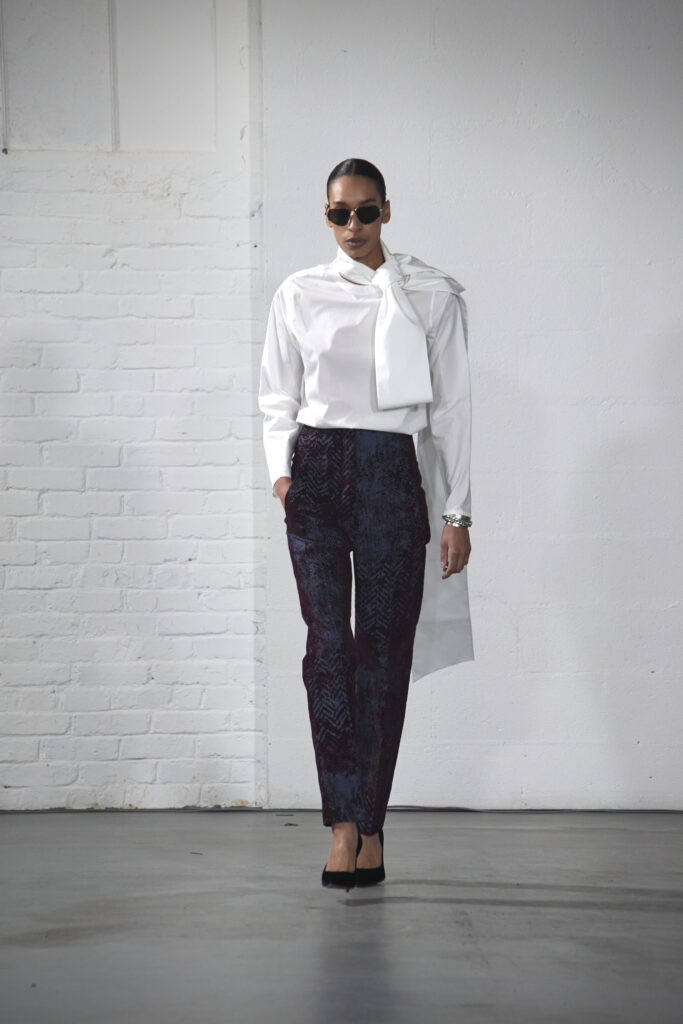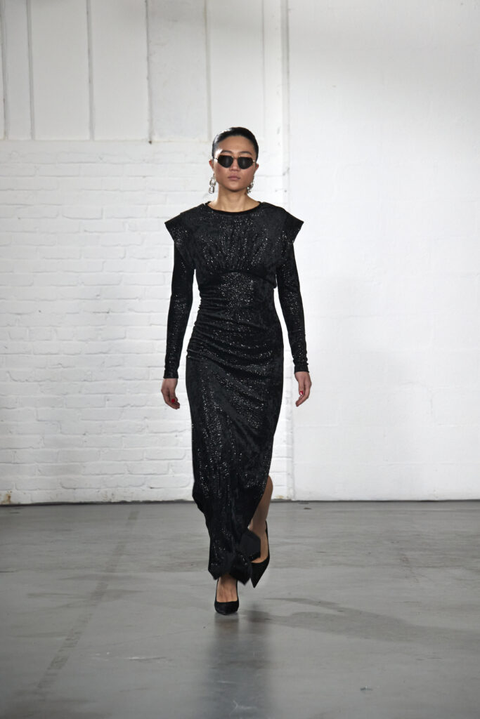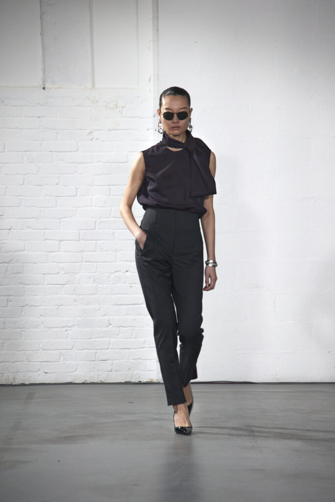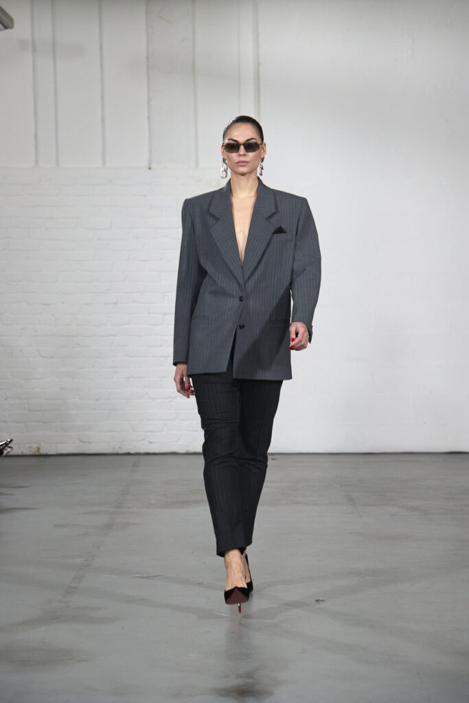 Les silhouettes, aux lignes acérées et structurées, oscillent entre masculin et féminin, à l’image d’un Bowie affranchi des genres. Le trench-coat se métamorphose en robe du soir, la veste en shearling se fait pièce maitresse, et la robe chemise sans manches s’impose comme un incontournable du vestiaire hivernal. Les coupes sont précises, les finitions raffinées, et les matières luxueuses. Laine technique infroissable, voile de laine, jersey de velours, velours dévoré sur denim… Valette Studio privilégie la qualité et le savoir-faire.
