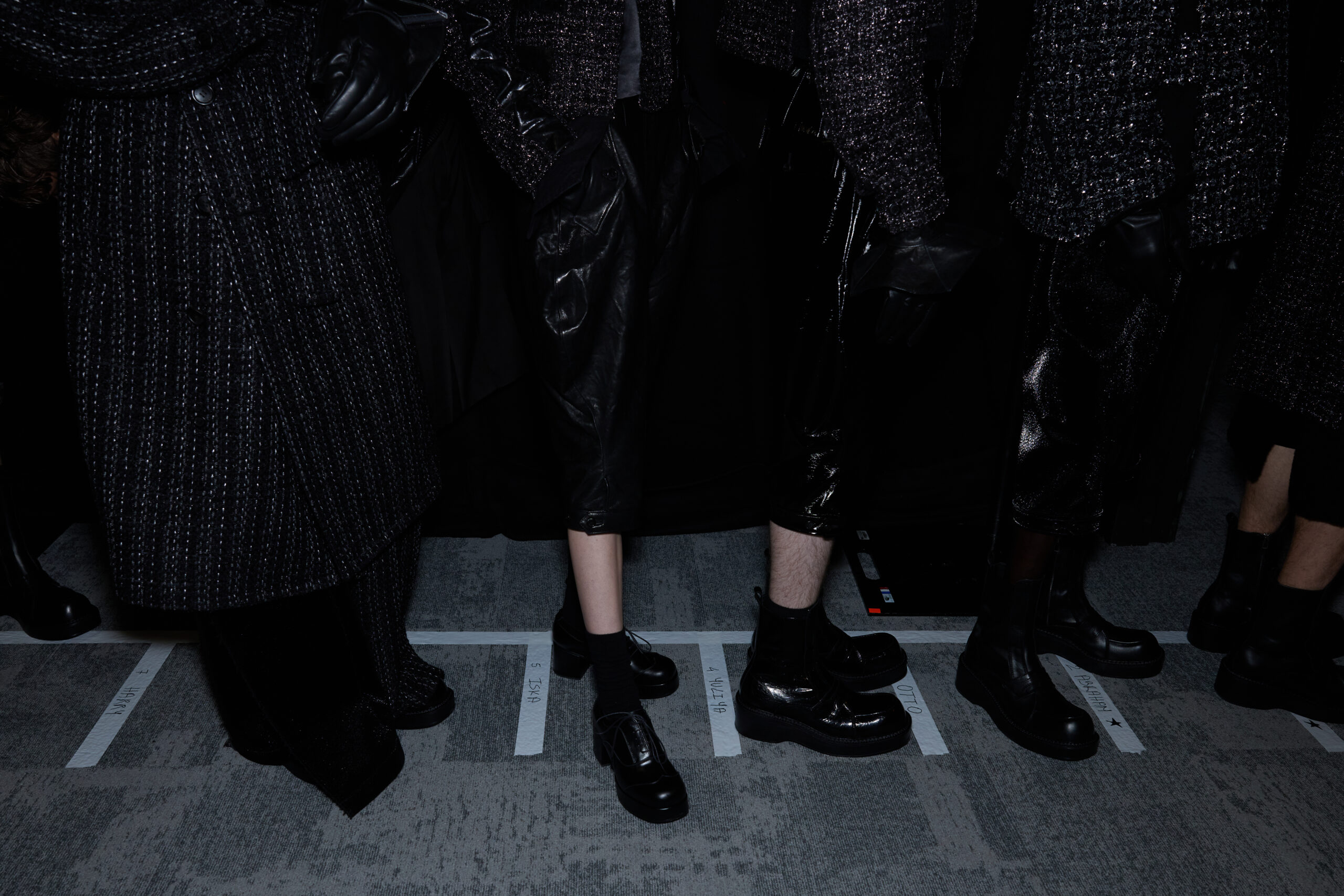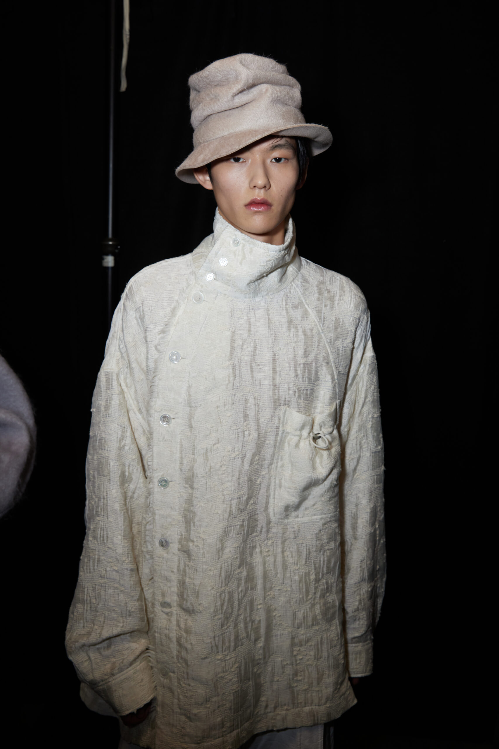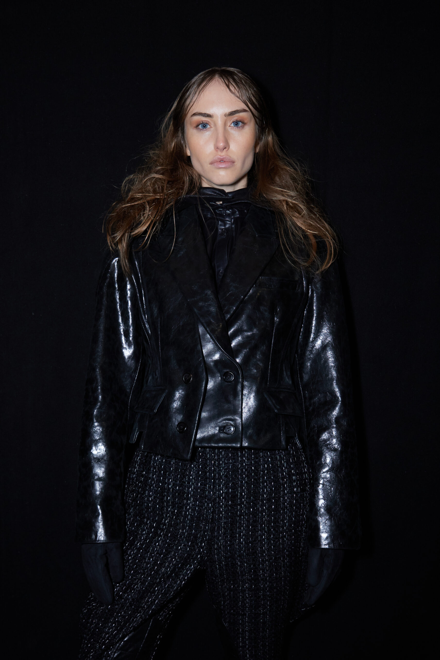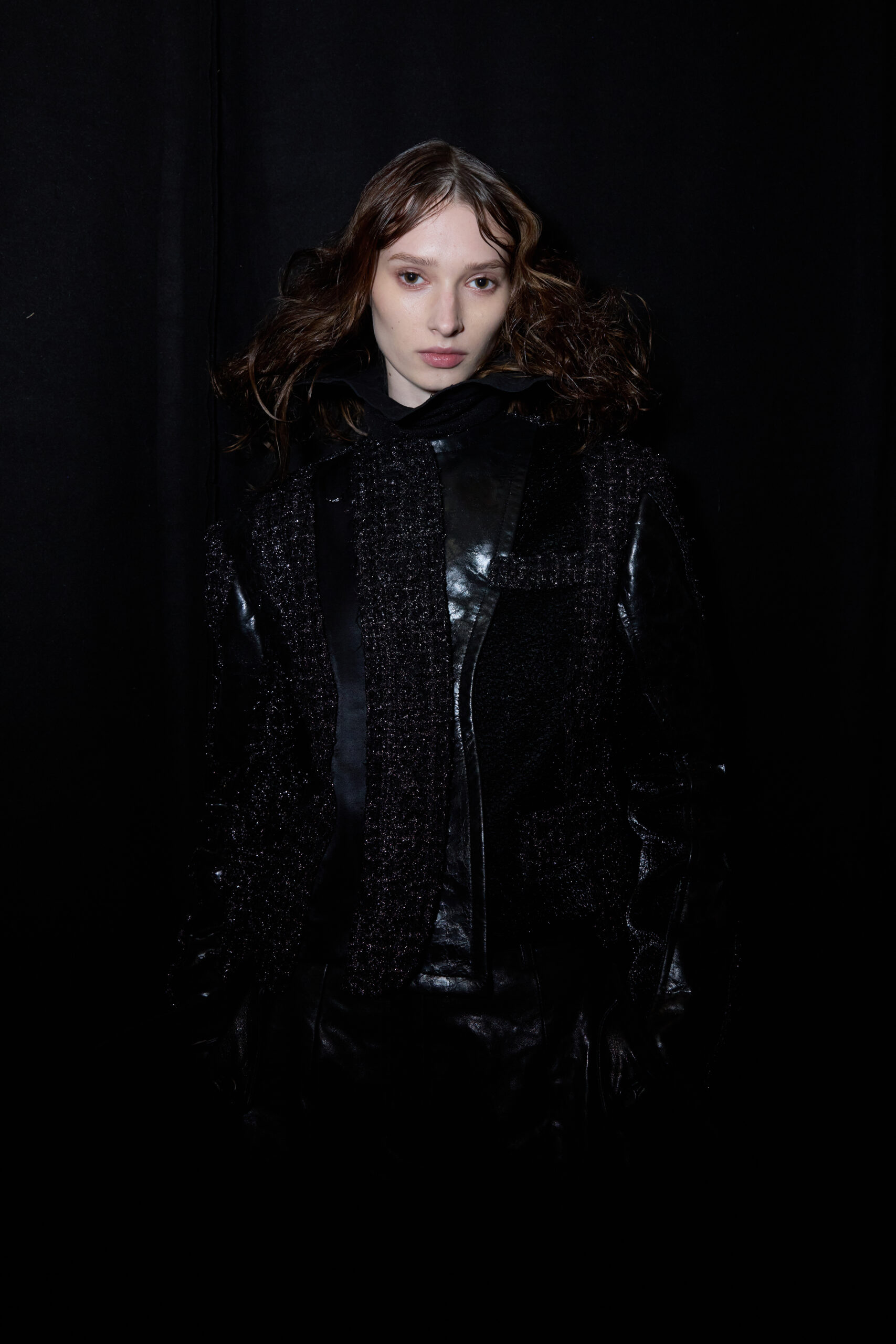 La présentation de la collection s’est accompagnée d’une performance sonore radicale, orchestrée par Joon Kwak, Max Frimout et Binkbeats, mêlant synthétiseurs modulaires et percussions en métal industriel. Cette bande-son immersive accentue le contraste entre structure et chaos, en écho à l’esthétique de la collection.