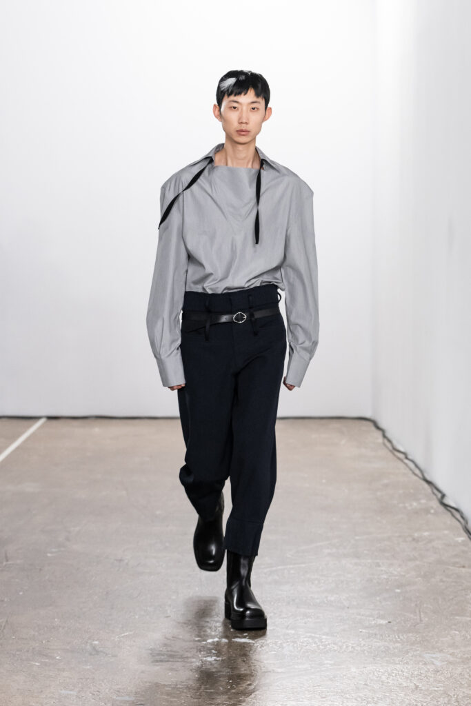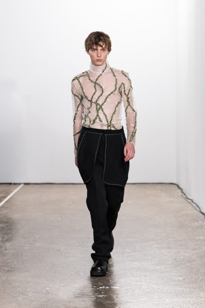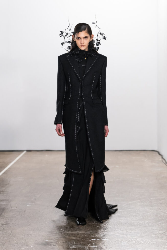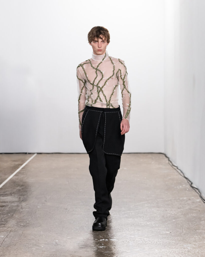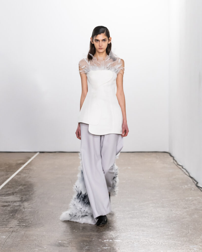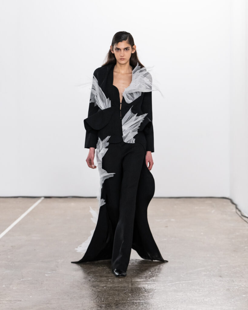 Des lignes structurées rencontrent des drapés romantiques, des textures superposées côtoient des coupes asymétriques, et des détails cachés révèlent une beauté faite d’imperfections. Ce dialogue stylistique illustre les tensions entre la vulnérabilité et la force, le romantisme et la résistance. « Cette collection célèbre les espaces de transition, là où la croissance prend racine », explique le créateur.