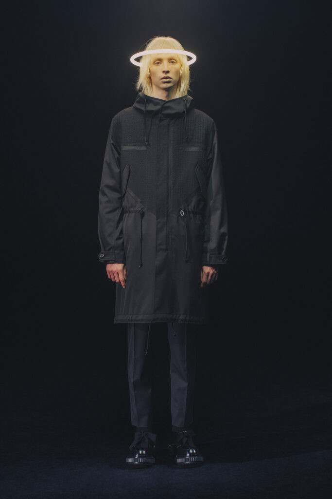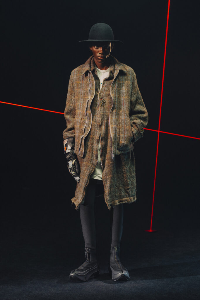 Jun Takahashi transcende cette inspiration en imaginant une tribu futuriste, oscillant entre décadence et sophistication. Ce mélange se traduit dans des pièces au design audacieux, intégrant des formes déstructurées et des textures variées, réminiscences du mouvement punk et de ses évolutions vers la new wave.