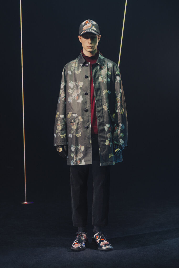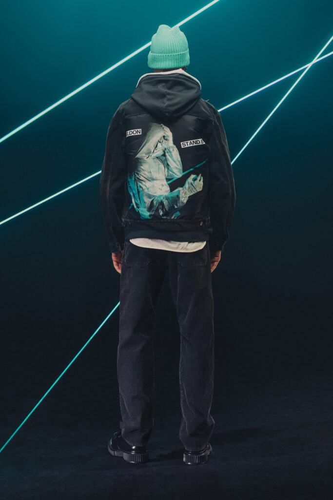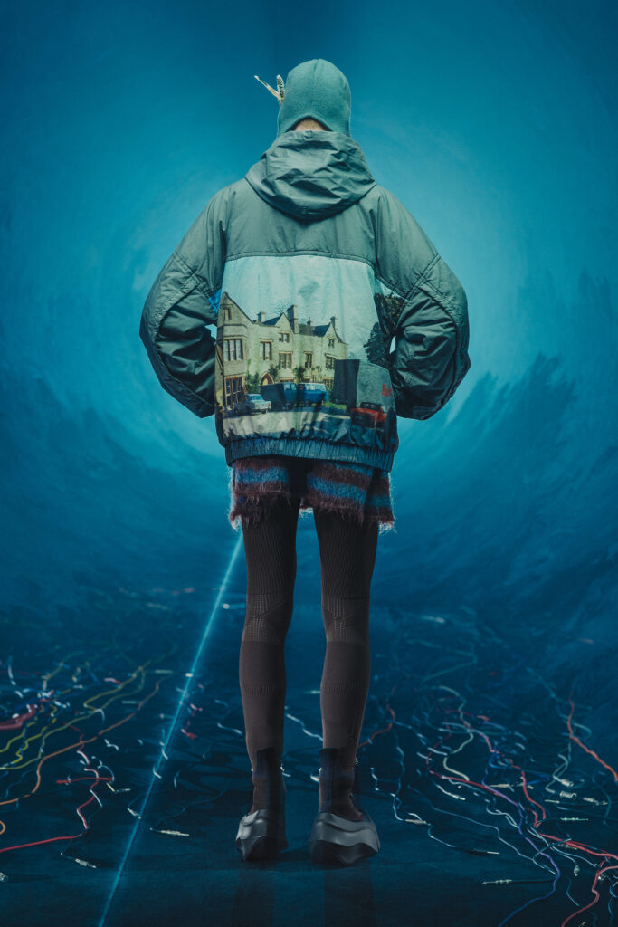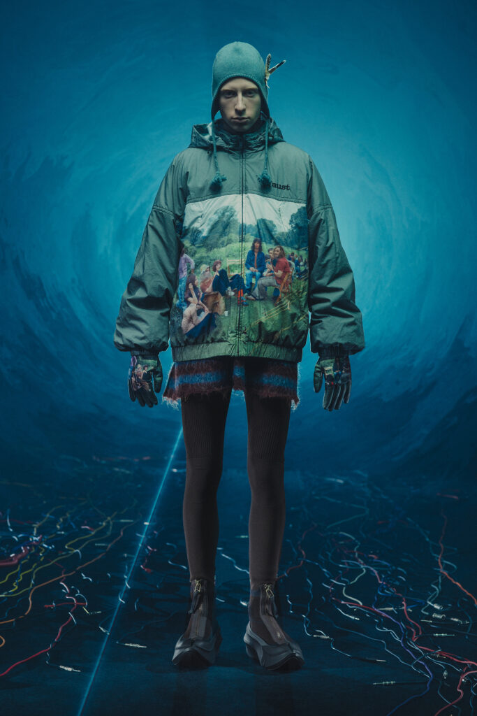 La collection fait également appel à l’univers graphique de Josep Baqué, artiste barcelonais renommé pour ses créatures fantastiques mi-humaines, mi-animales. Ces œuvres enrichissent l’imaginaire dystopique de la collection, tissant des récits visuels à travers les motifs et les imprimés.