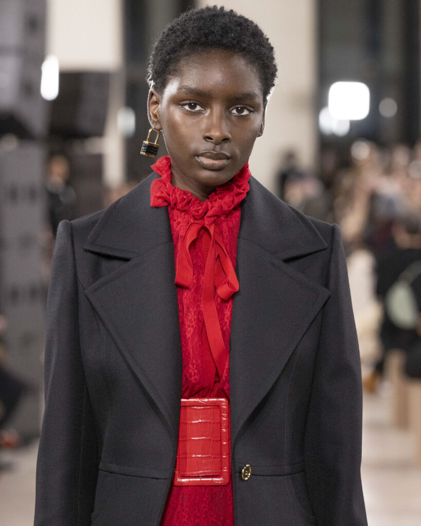 Le trio de couleurs noir, blanc et rouge domine, évoquant à la fois l’élégance classique et la tension contemporaine d’une femme en mouvement constant.