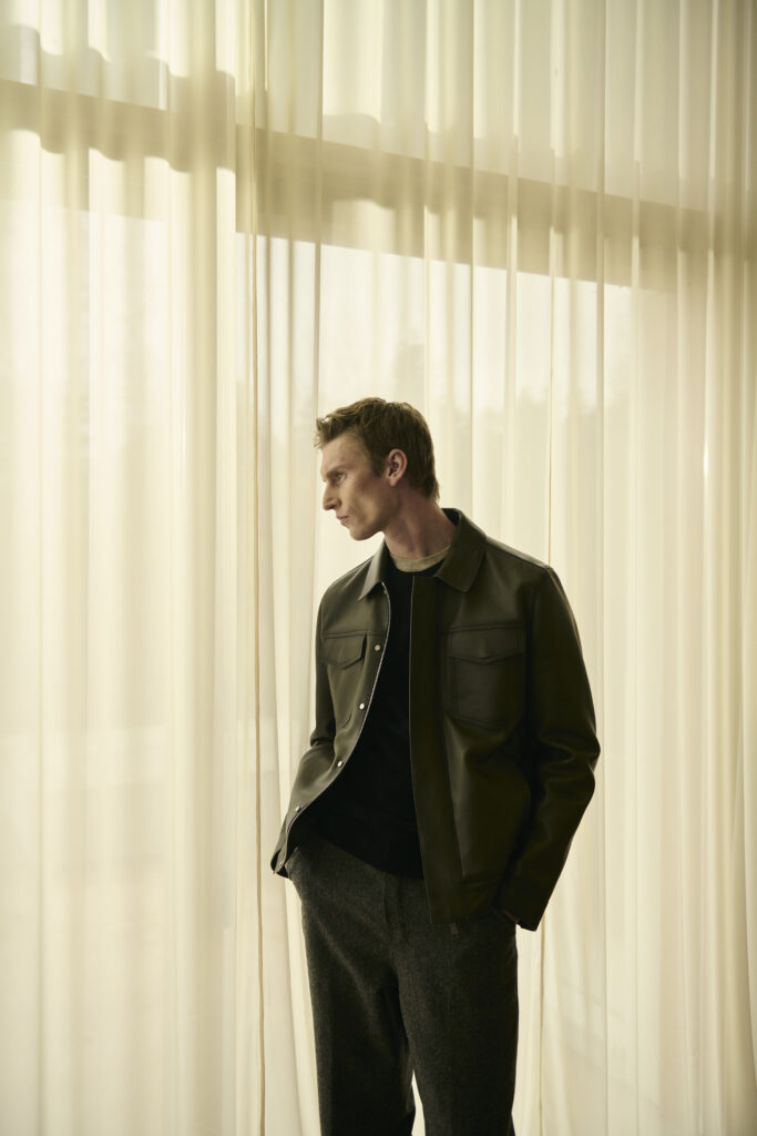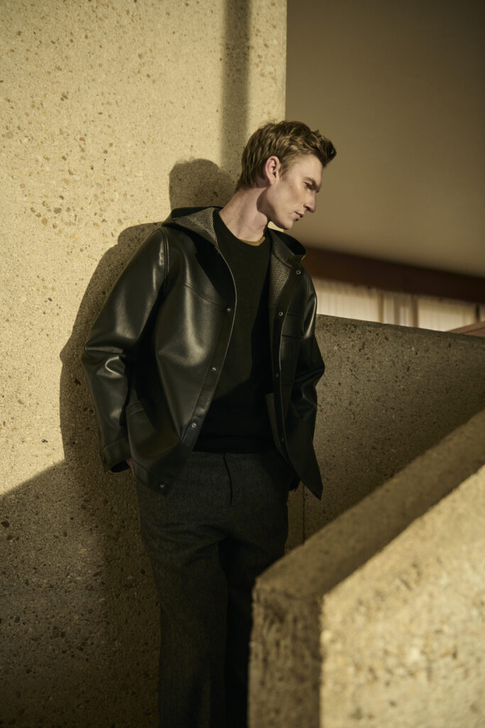 - Cuir en majesté : La Maison met à l’honneur des peaux d’agneau légères et souples, ainsi que du cuir de veau glacé, aux reflets uniques et finitions impeccables. Une innovation marquante : le cuir contrecollé sur un jacquard pied-de-poule, pour une texture et un esprit sartorial modernisés.
