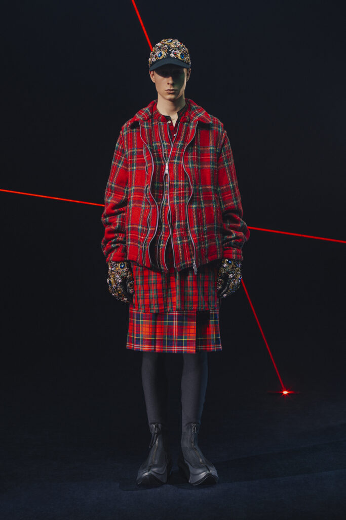 Un autre aspect de la collection explore le rêve pastoral britannique à travers des vestes, manteaux, kilts et pantalons cargo robustes mais élégants, confectionnés en patchworks de tweeds Harris et de tissus à carreaux, volontairement froissés et lavés pour leur donner une texture authentique. La douceur s’exprime dans un duffle-coat en cachemire double face, camel à l’extérieur et à carreaux à l’intérieur, ainsi que dans des pyjamas en coton et des chaussons en soie ornés des monstres colorés et comiques de Baqué.