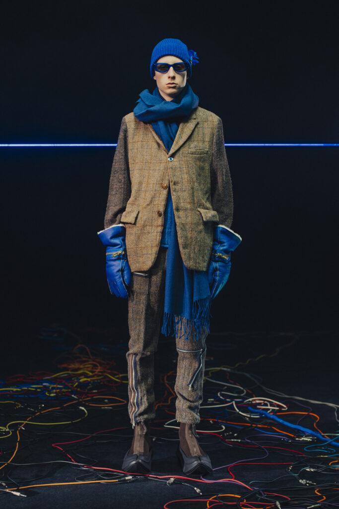 Les pochettes d’albums de l’époque occupent une place centrale dans la collection. Reproduites grâce à un tissage jacquard, elles ornent avec précision de longs manteaux noirs et des vestes sportives éclatantes. Takahashi a poussé l’inspiration électro-rock encore plus loin avec des accessoires théâtraux, tels que des gants dramatiques, des casquettes ornées de pierres précieuses étincelantes, et des brassards en laine modulaires évoquant une esthétique chevaleresque.