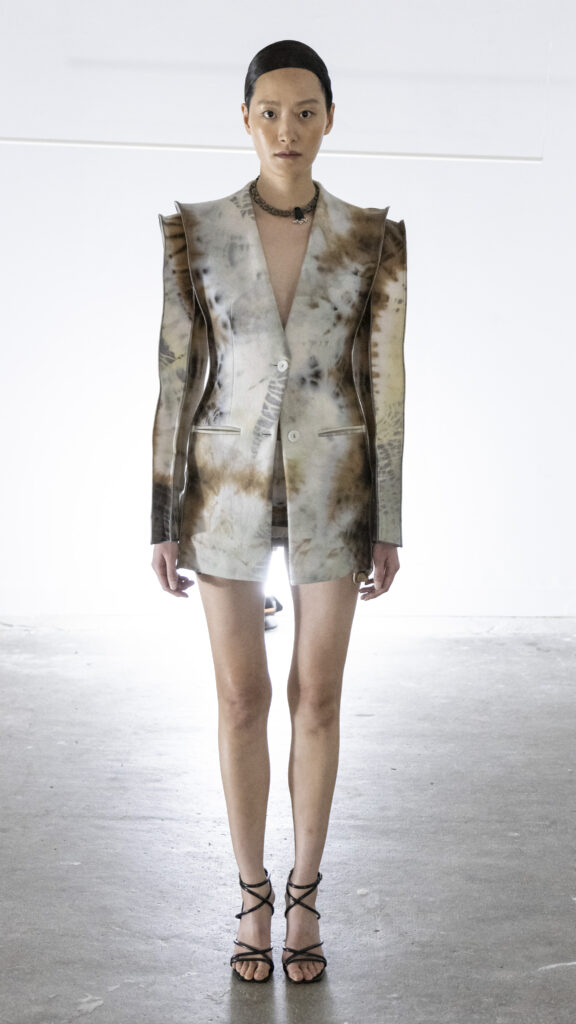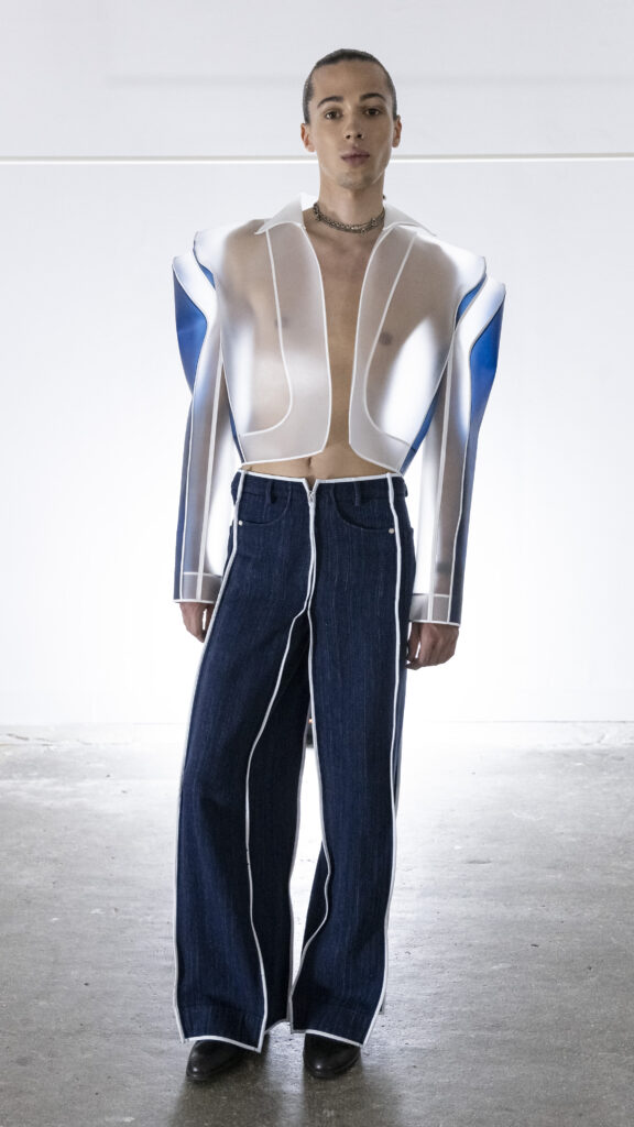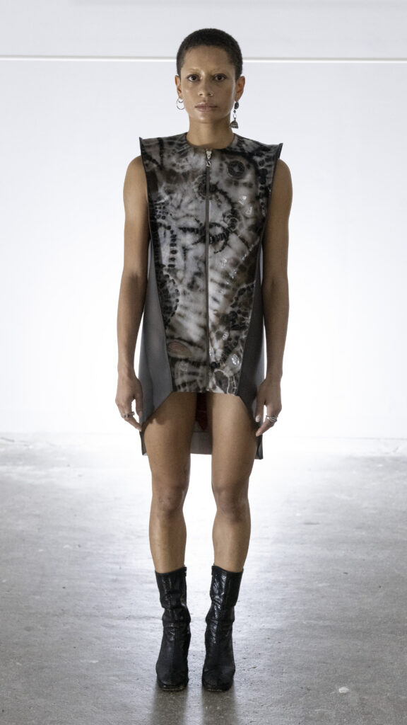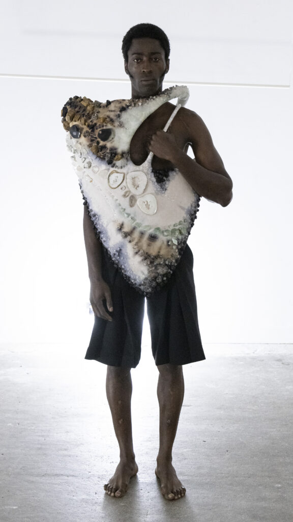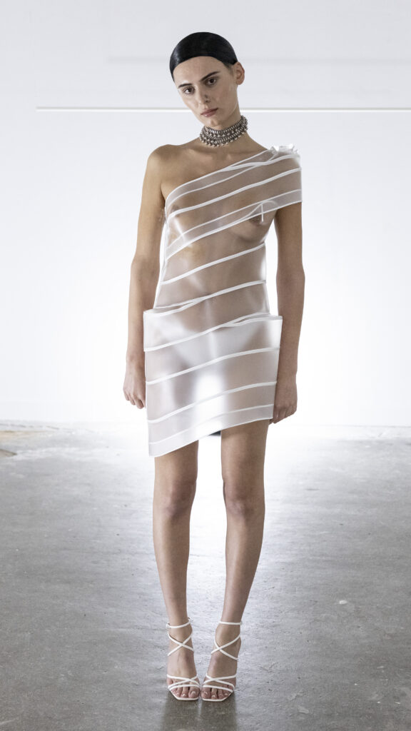 “Passages” explore une hybridité de formes et de types, incarnant une coexistence entre le naturel et l’artificiel, l’organique et le technologique. La collection réinvente l’anatomie et les contours à travers des silhouettes sculpturales et des matières brutes, telles que les cristaux non taillés et les éléments terrestres. Chaque pièce, loin d’être un simple vêtement, devient un objet interactif, engageant le regard et le porteur dans une expérience multisensorielle.