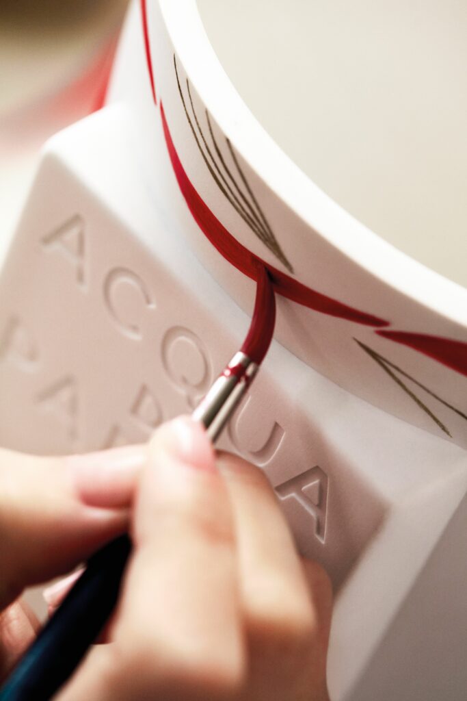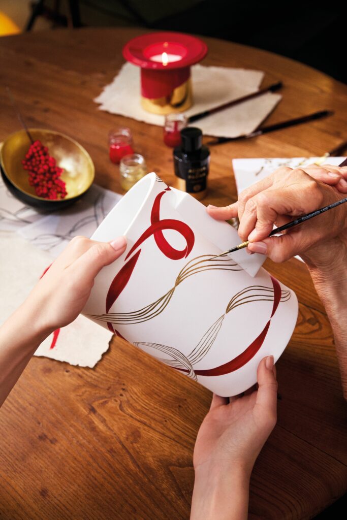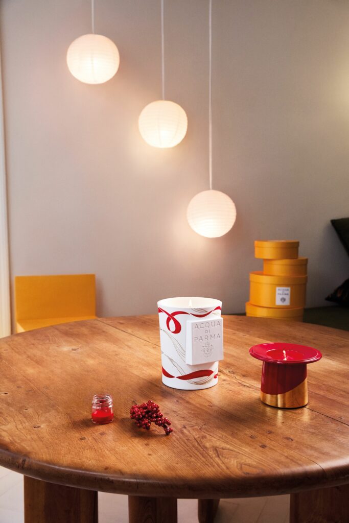 L’objet en lui-même est un chef-d’œuvre. Baptisé « Legàmi Chapeau! », il reprend la forme iconique du flacon Art Déco d’Acqua di Parma, sublimé par un jeu de couleurs contrastées et de textures raffinées. Le couvercle en céramique se transforme en une bougie à la fragrance intense de Zafferano, tandis que le corps du flacon abrite une bougie à cinq mèches, diffusant les notes délicates de Luce di Rosa. Un motif de lignes entrelacées, imaginé par le Laboratorio Paravicini et peint à la main par les artisans de La Scuola Cova, orne cette pièce d’exception, telle une broderie précieuse sur un écrin de porcelaine.