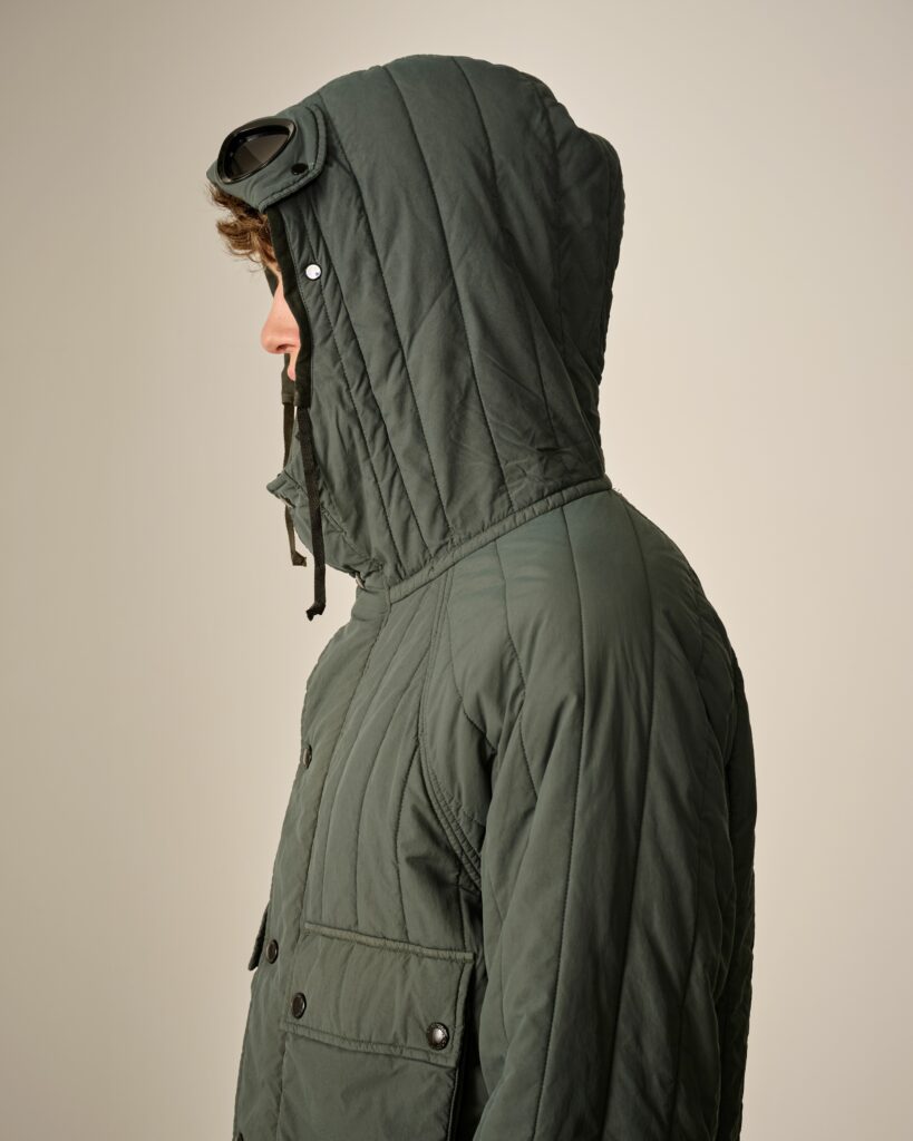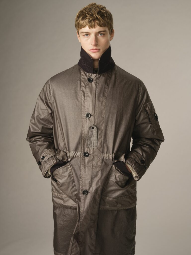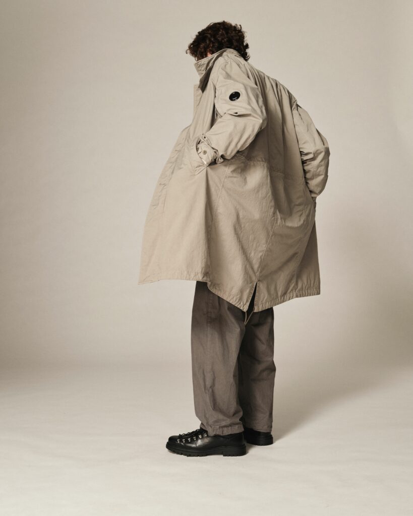 Le Twill, un sergé de nylon taslan teint en pièce, structure des pièces comme le manteau à queue de poisson. L’Opal, un nylon léger déperlant, lui, habille la Goggle Jacket et deux manteaux doublés de duvet. Et le C.P. Duffel, inspiré du Duffle Coat, utilise une laine vierge italienne issue de moutons néo-zélandais pour allier chaleur et résistance.