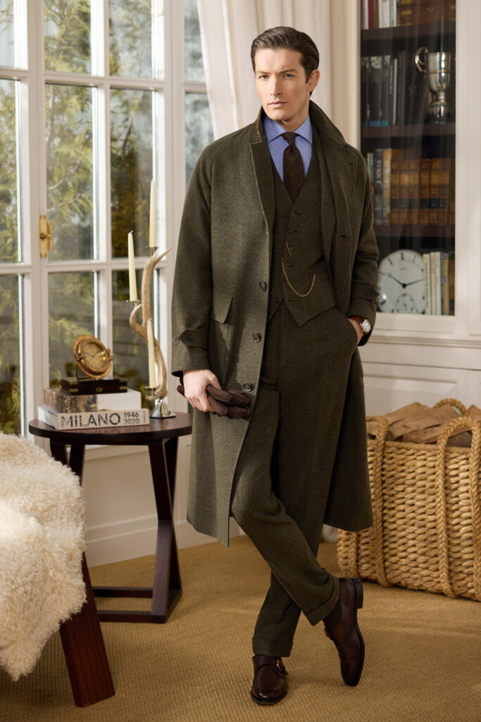 - Matières opulentes : Cachemire œil-de-perdrix, molleton moelleux et cuir cousu main se déclinent en vêtements d’extérieur et en pièces de tailoring artisanal.