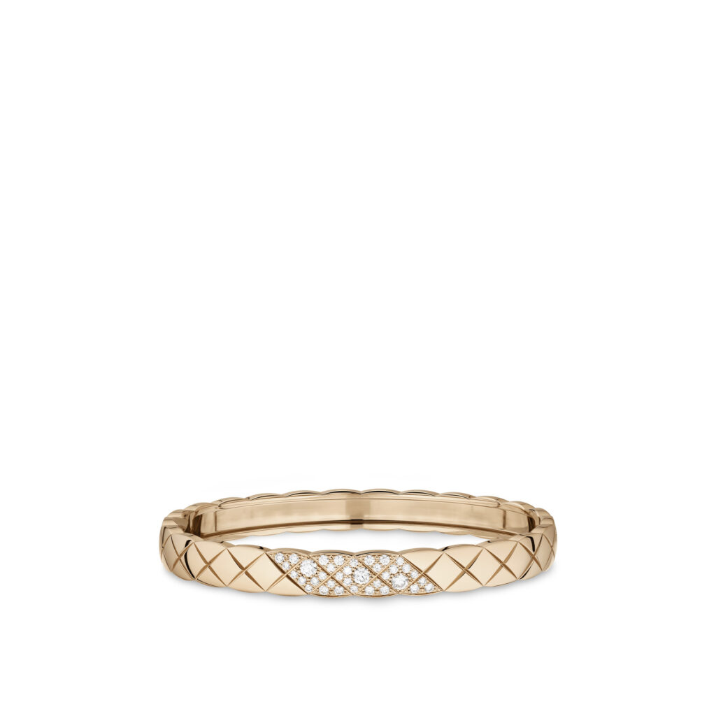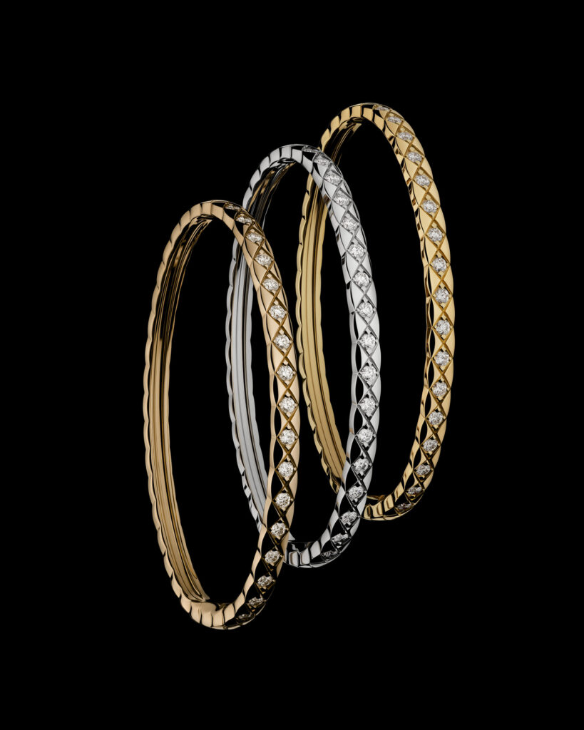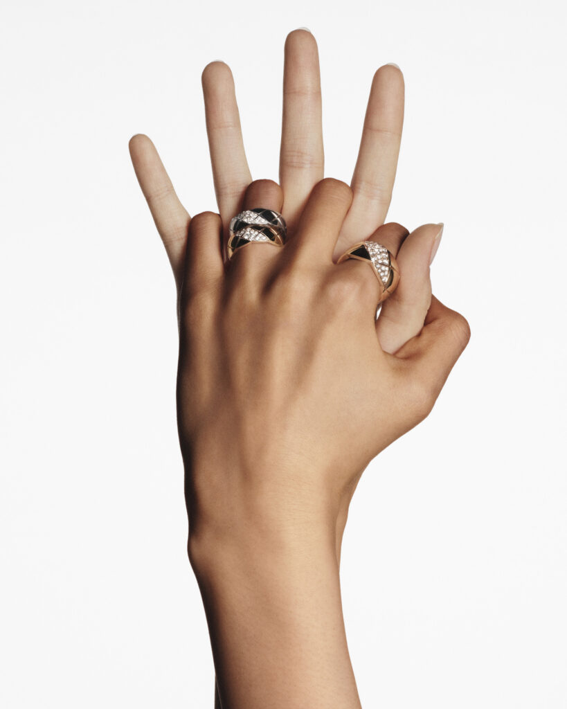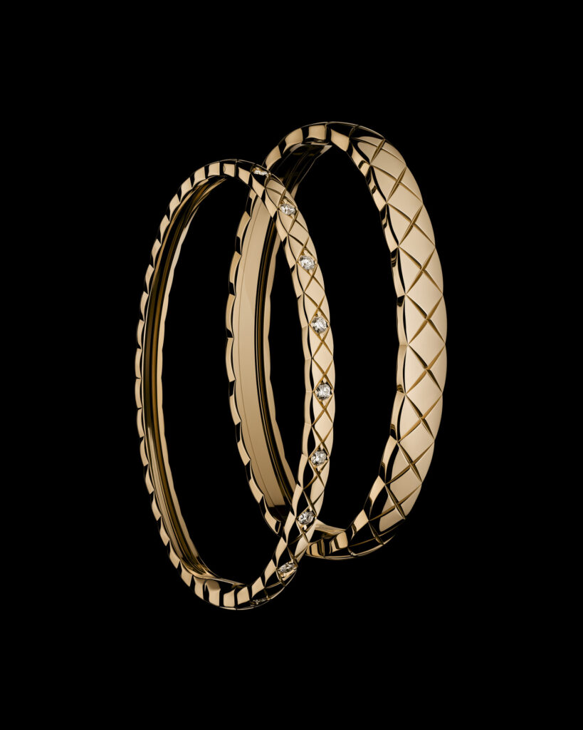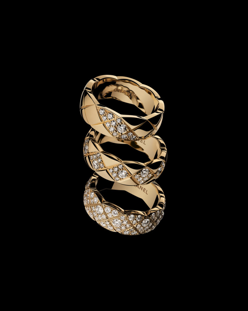 Inspiré par les vestes des lads sur les champs de courses et les couvertures des chevaux d’Étienne Balsan, amant de Gabrielle Chanel, le motif matelassé s’inscrit dans l’ADN de la Maison depuis les années 1920. Retranscrit dans l’or dès 2015 avec COCO CRUSH, il devient ici plus précieux que jamais. La rigueur du dessin contraste avec la rondeur du volume, dans une fusion parfaite entre force et douceur, maîtrise et spontanéité.