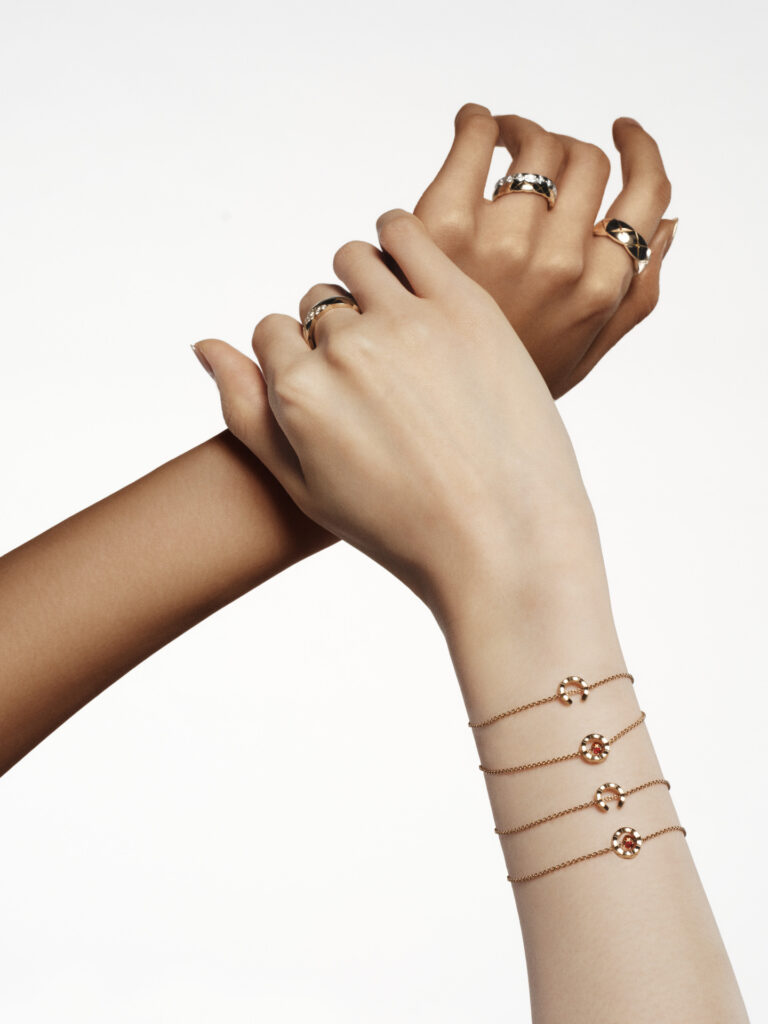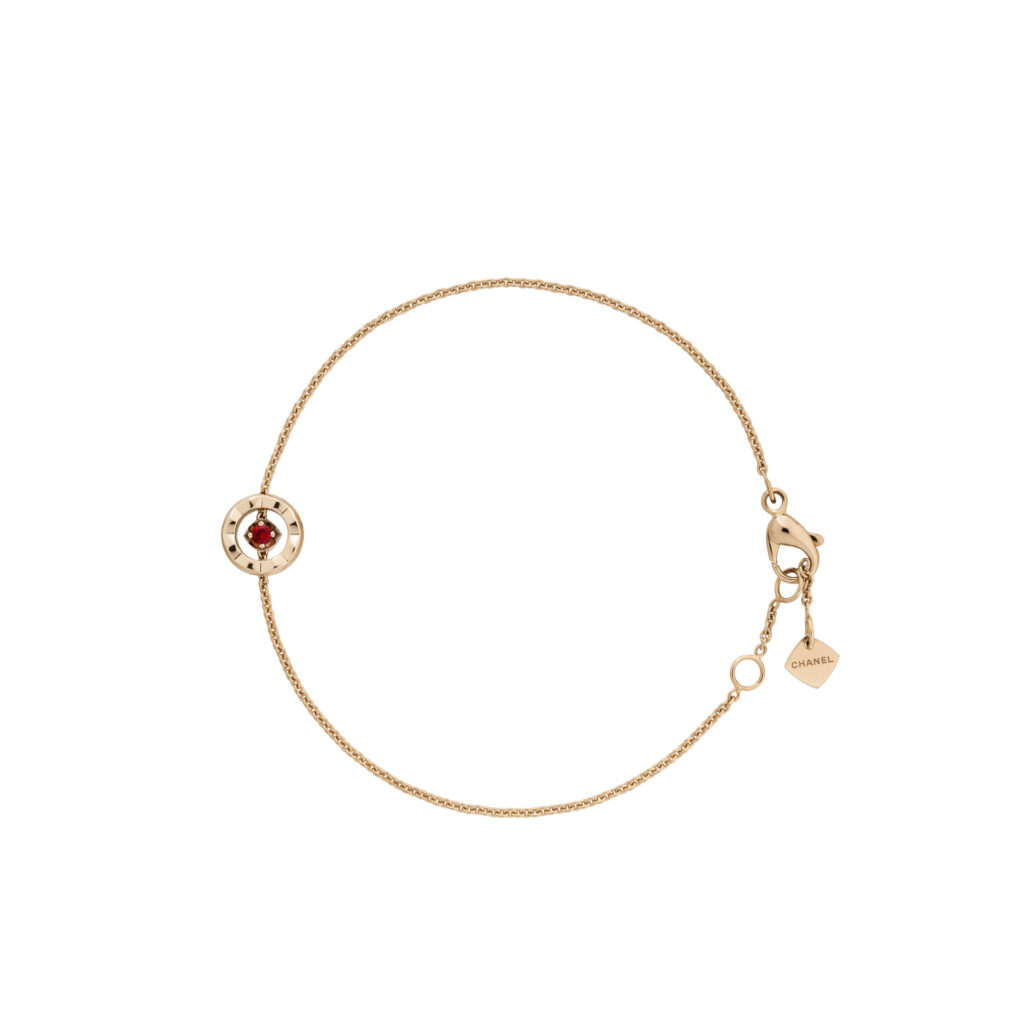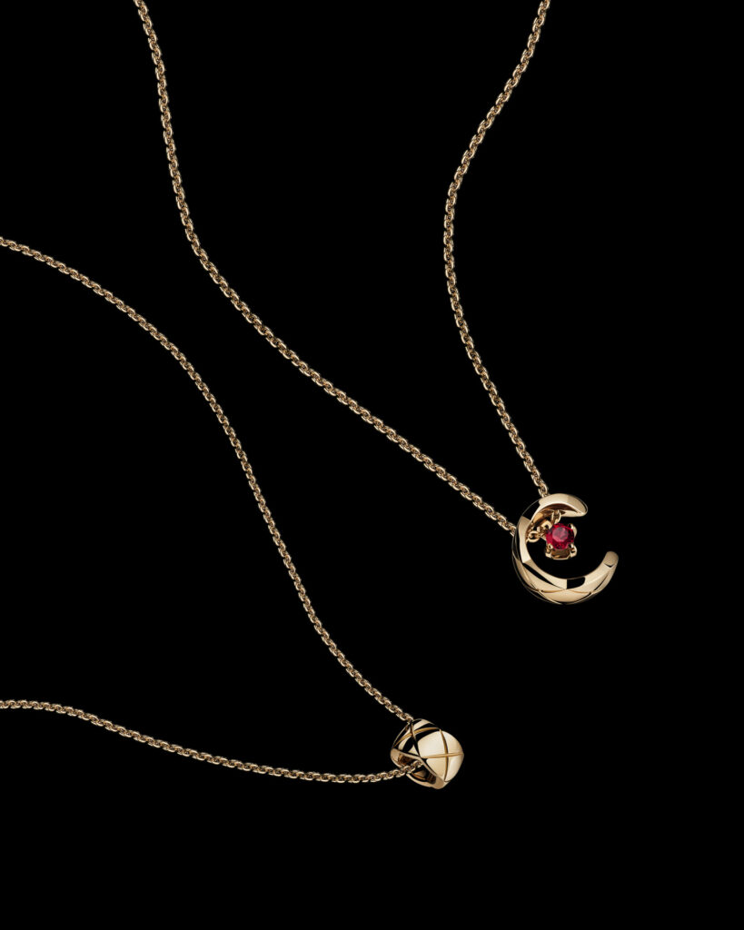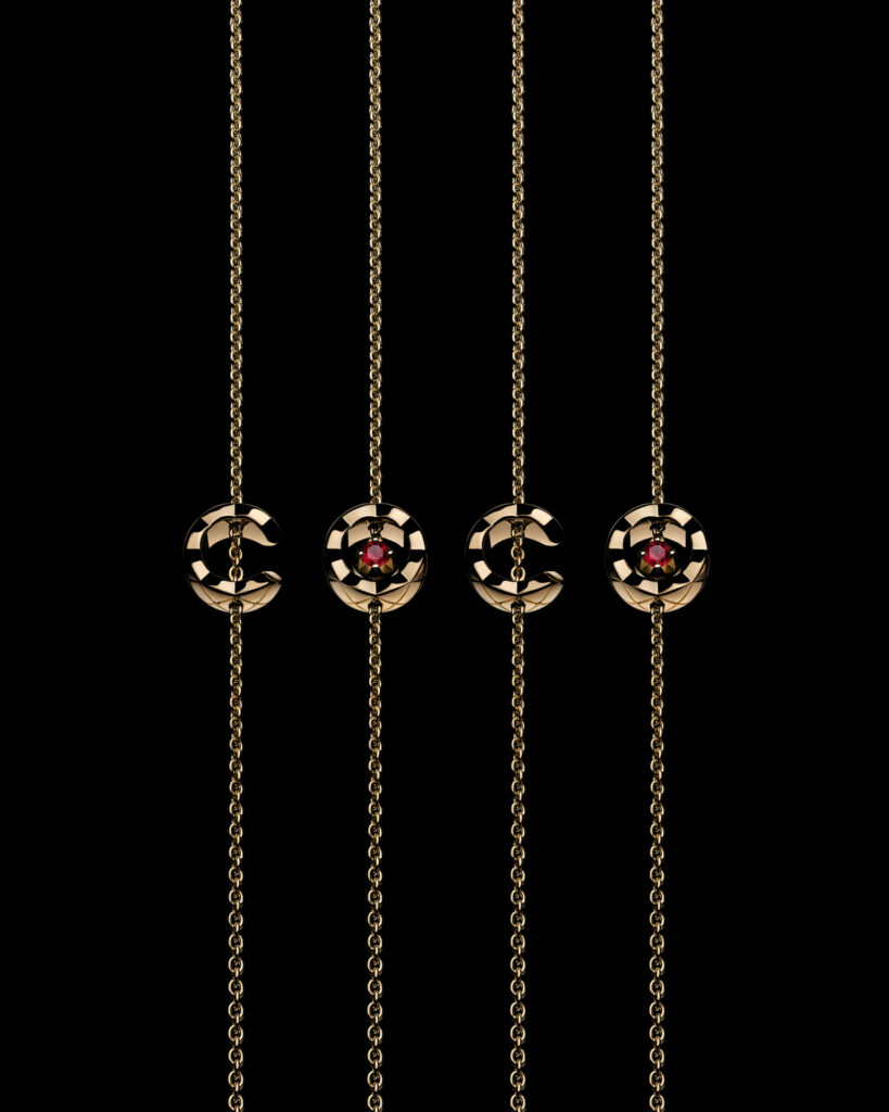 Pensée comme une ode à la légèreté et à l’accumulation, la collection s’enrichit de colliers, bracelets, boucles d’oreilles et bagues où le motif matelassé, signature intemporelle de CHANEL, se pare d’un éclat nouveau. Les rubis, subtilement logés dans les creux des lettres formant « C.O.C.O. », apportent un relief chromatique vibrant, transformant chaque pièce en un talisman à l’allure graphique et contemporaine.