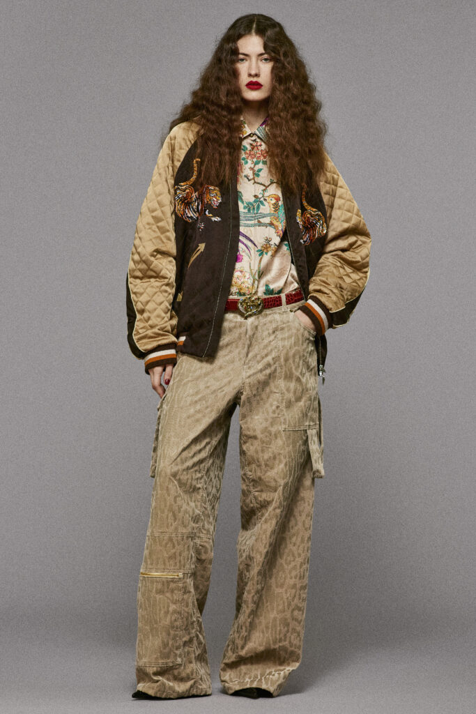 Les imprimés animaliers, essentiels à l’identité Cavalli, s’expriment pleinement à travers des motifs léopard et des éclats d’yeux de tigre vibrants. Ces motifs ornent des robes légères, des vestes ajustées et des trenchs masculins, associés à des jeans oversize décorés de brocarts indiens.