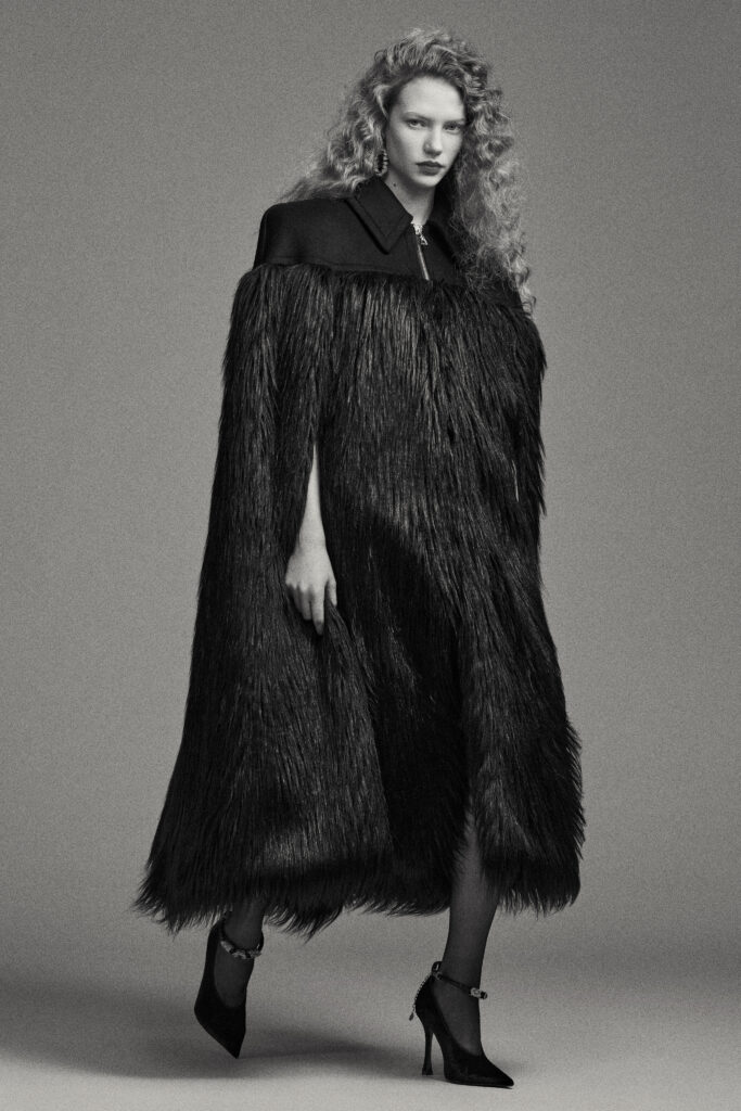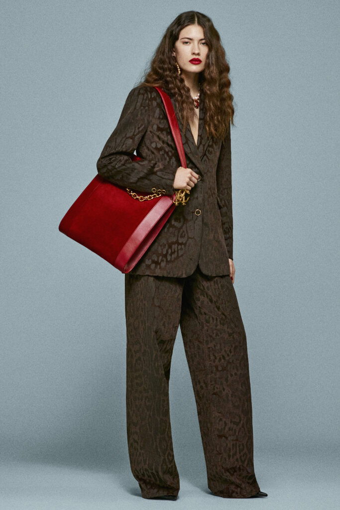 La féminité est accentuée par des accessoires sculpturaux : escarpins et sandales à talons métalliques, boucles d’oreilles imposantes, ainsi que des sacs à chaîne XXL. Le célèbre sac Roar fait un retour remarqué avec des finitions en cuir crocodile et serpent pour un effet spectaculaire.