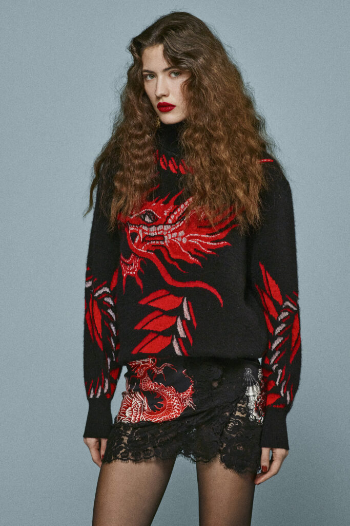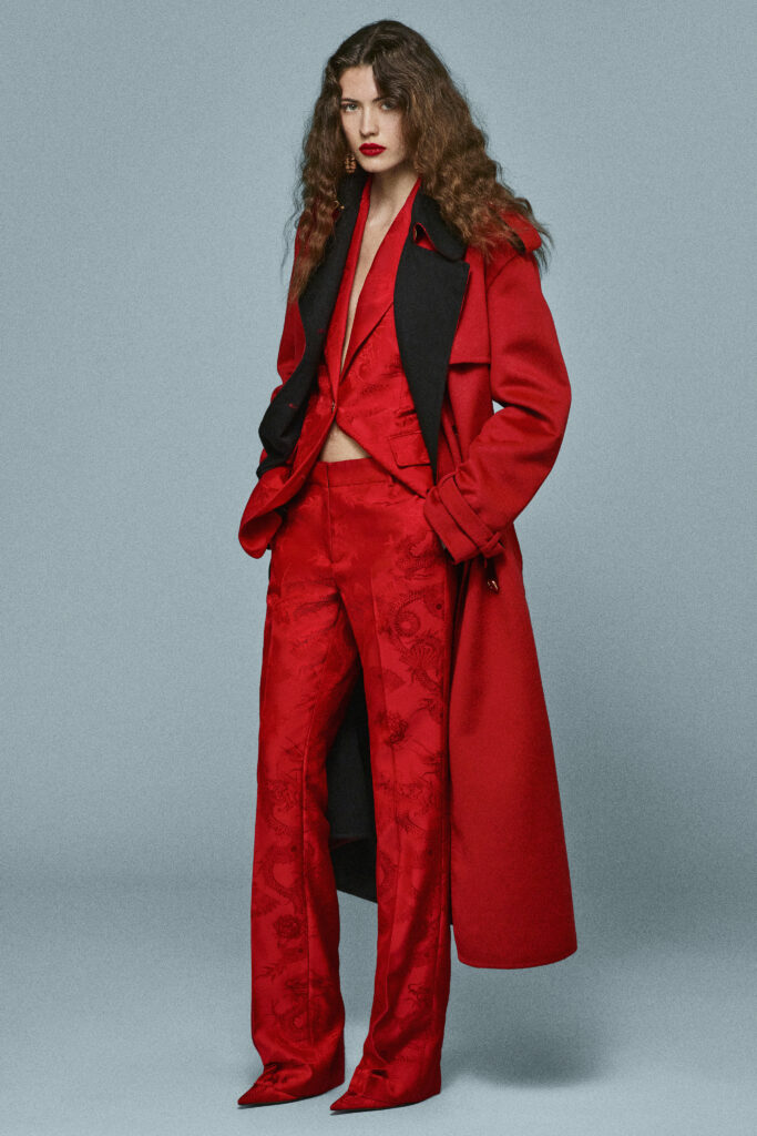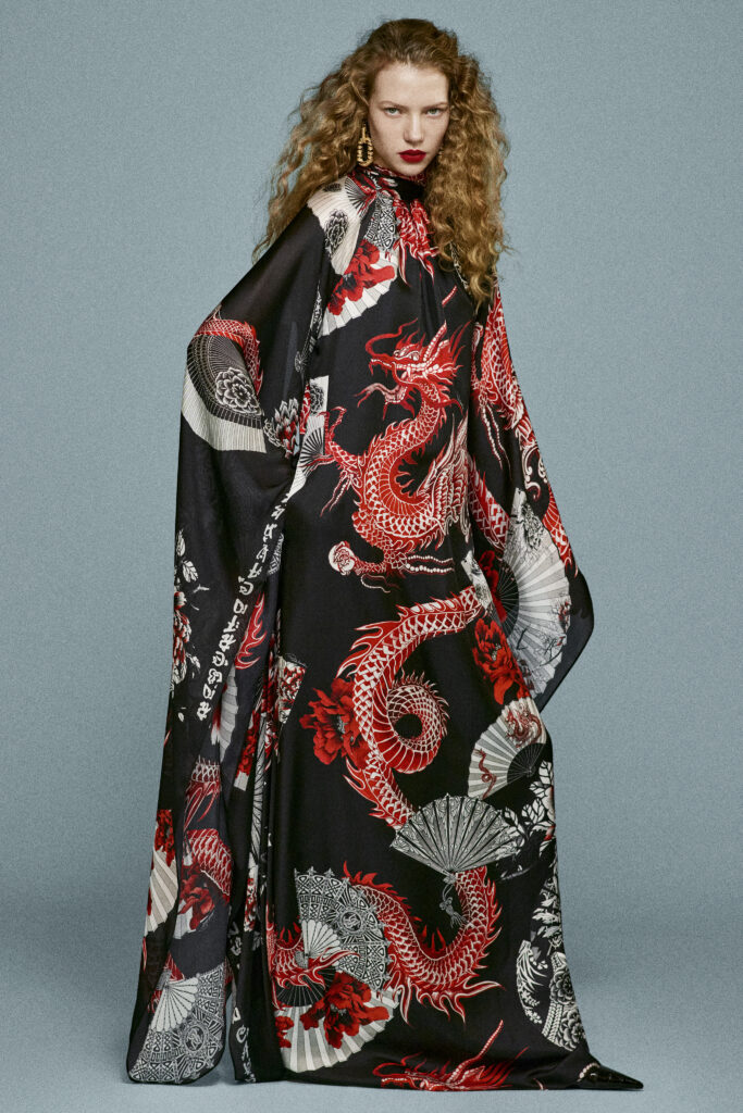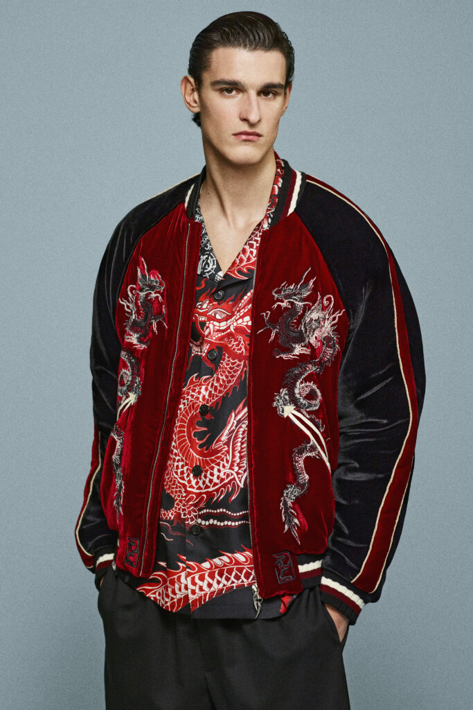 L’inspiration asiatique traverse la collection : des ceintures obi en velours structurent les silhouettes, et des motifs inspirés de la poterie chinoise ornent des mini-robes au style rétro des années 2000. Les dragons brodés sur des bombers en velours ou imprimés sur des kaftans fluides ajoutent une touche mystique et exotique.