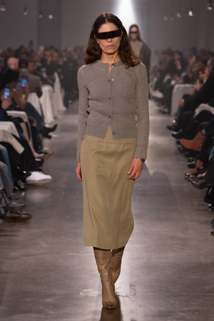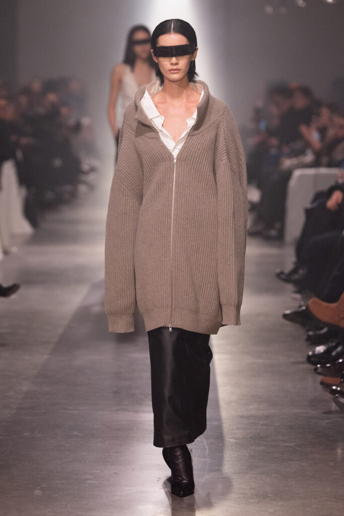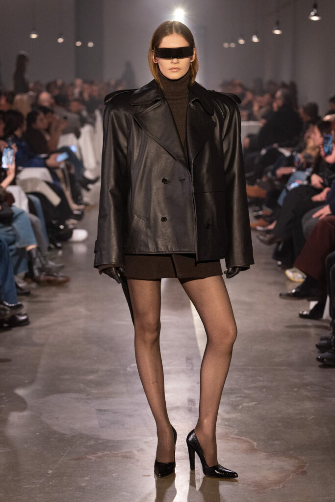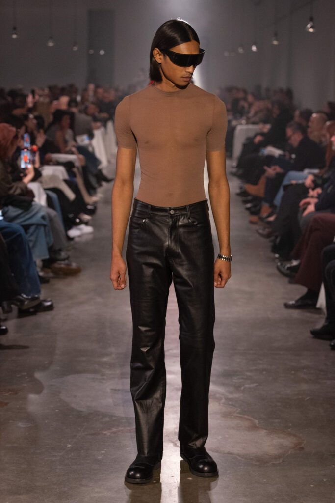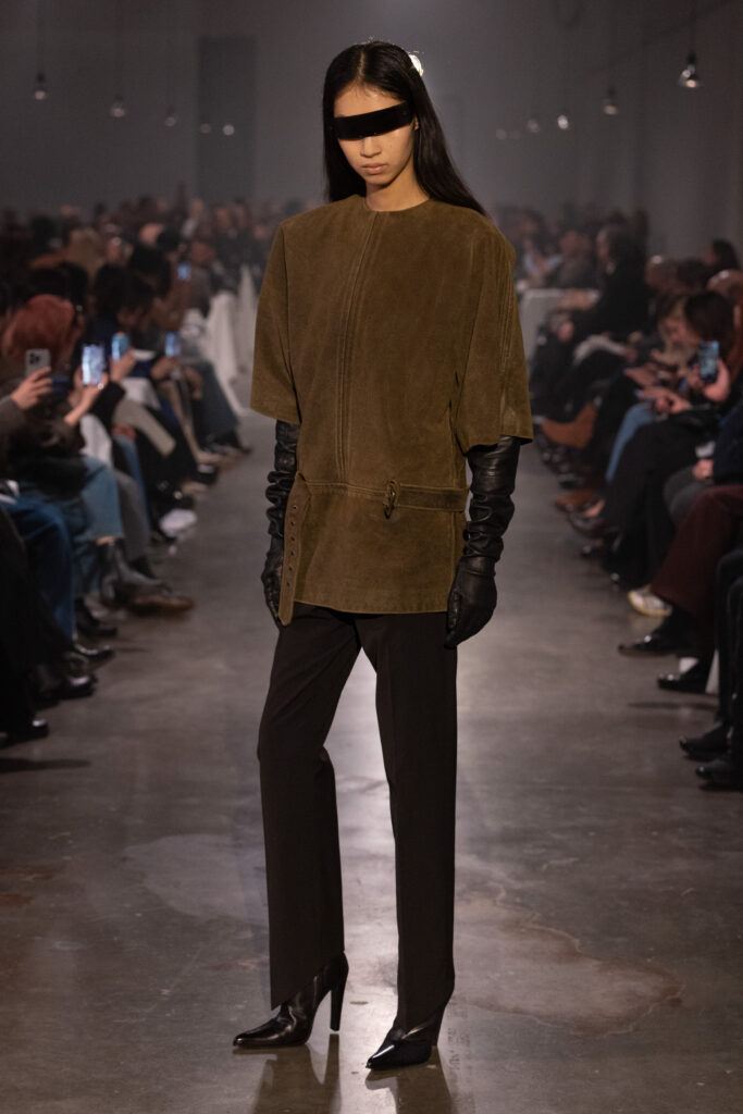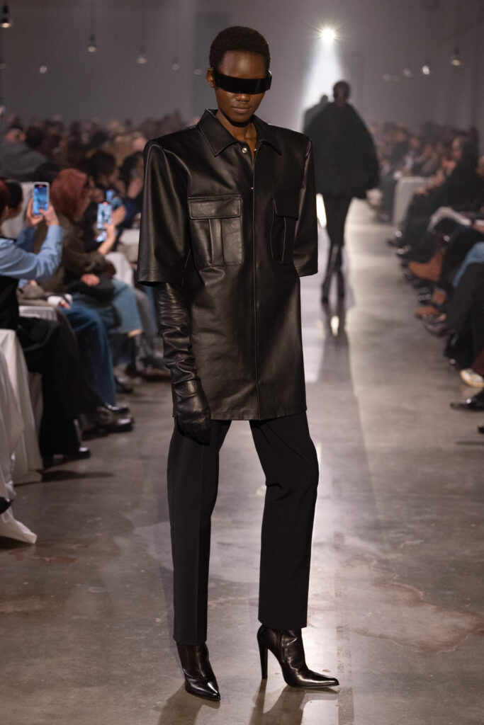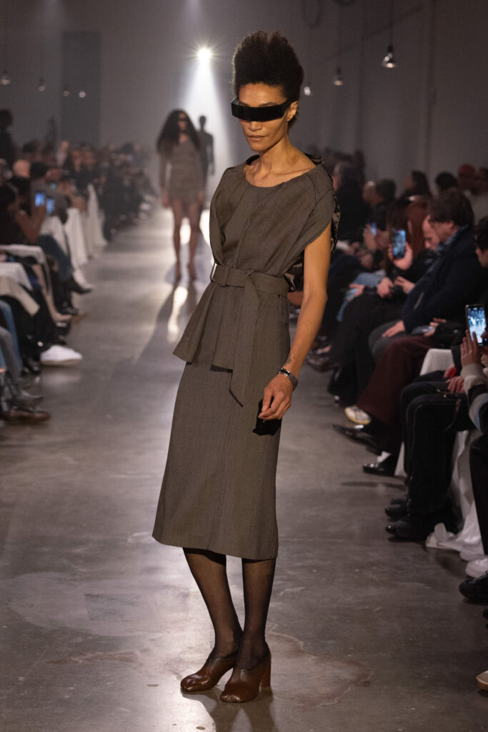 Les matières choisies sont une ode à la simplicité sophistiquée. Les lainages masculins, les cuirs lisses et les cotons utilitaires forment une bibliothèque textile où la rigueur rencontre l’audace.