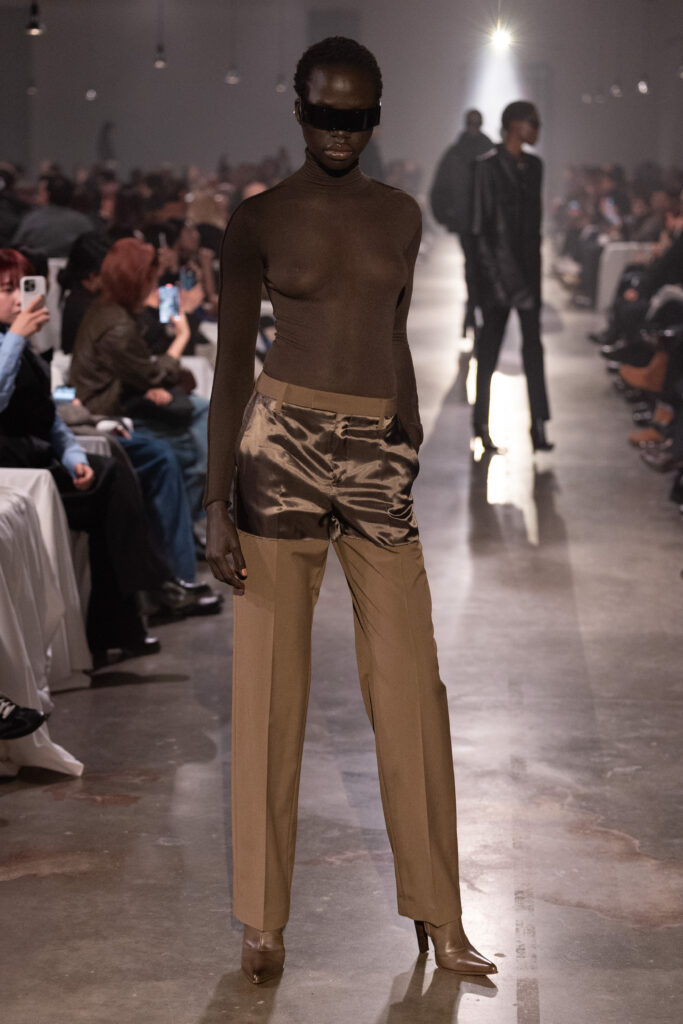 Dans cette nouvelle proposition, chaque pièce devient un terrain d’exploration où la silhouette oscille entre structure affirmée et fluidité entravée. Ici, les vêtements s’élargissent ou se contractent par des interventions subtiles mais radicales : panneaux additionnels, volumes sculptés par du rembourrage, tissus pincés et tordus révélant des marges de couture volontairement exposées.